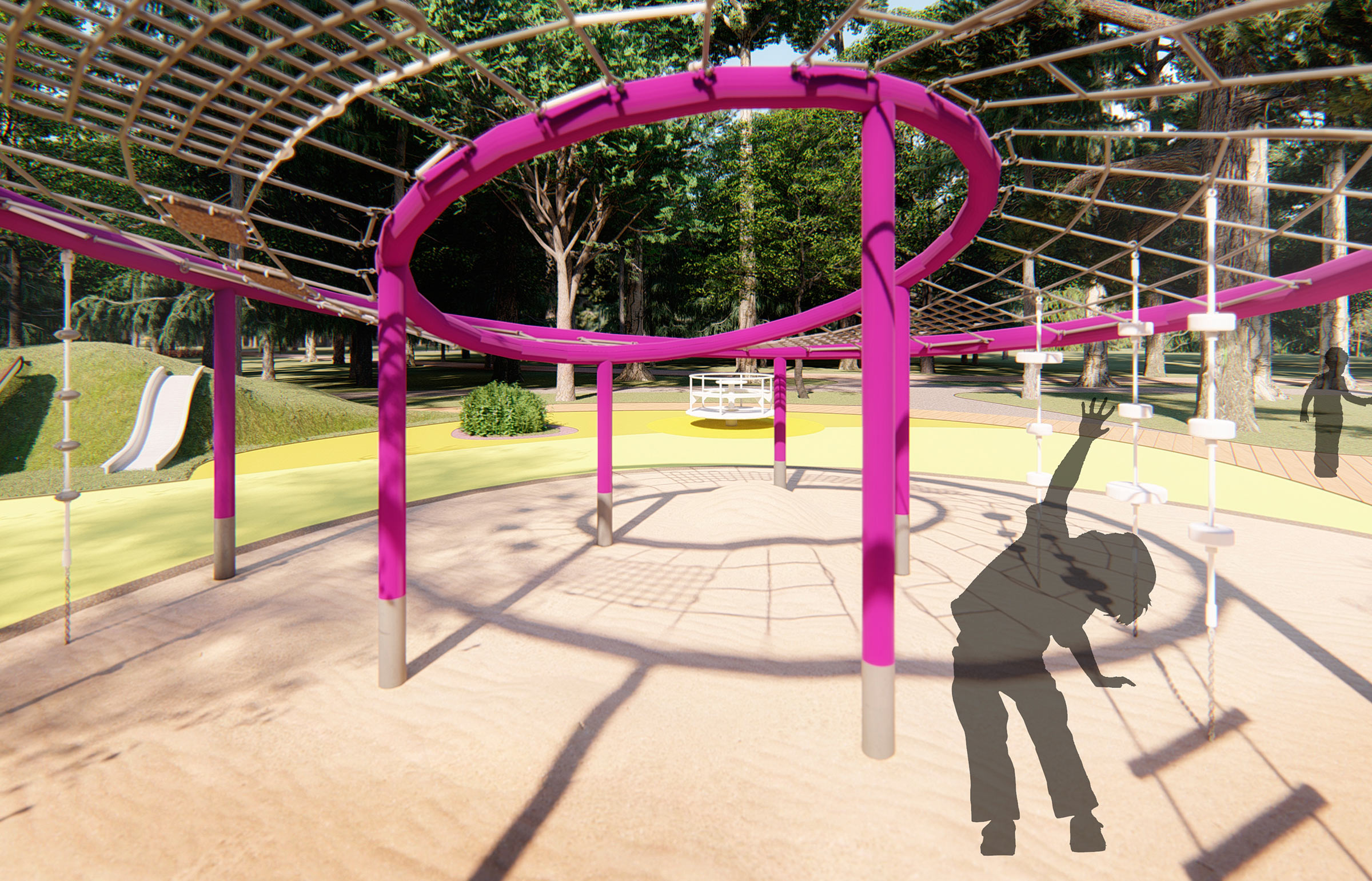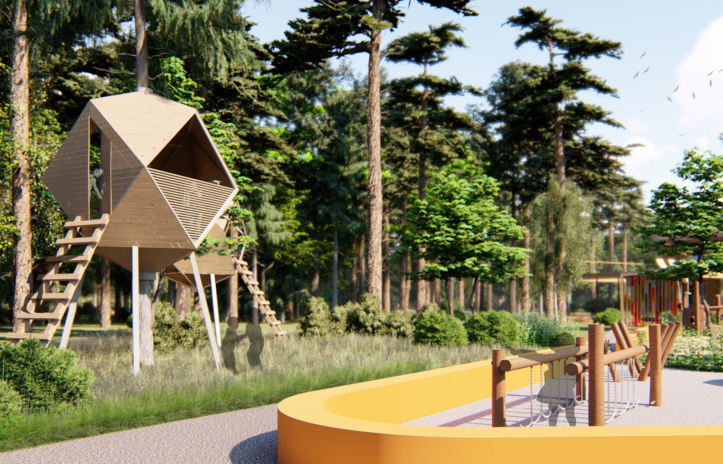 There are three children zones: a rope park, a play zone by the lecture hall and a playground.