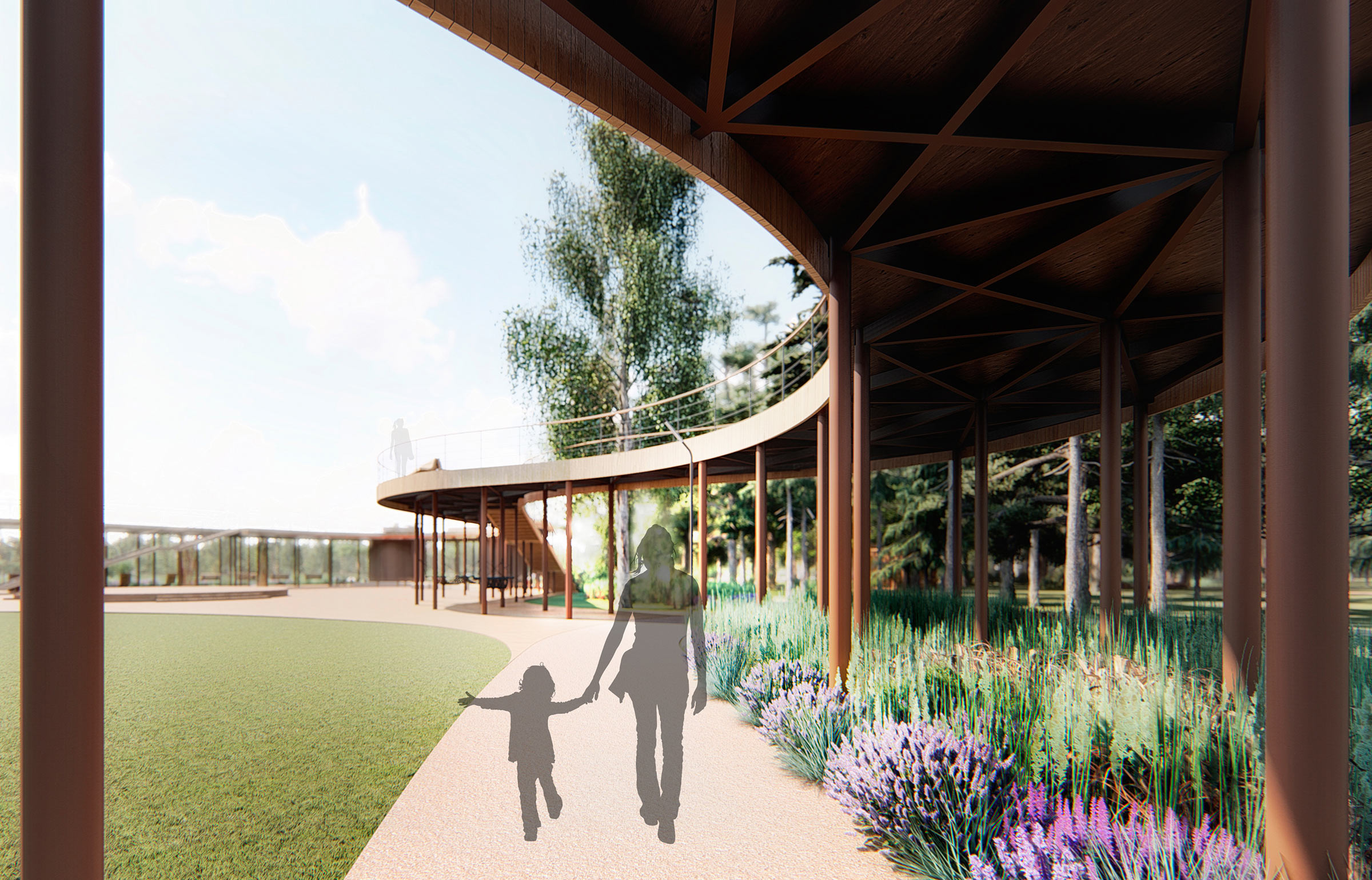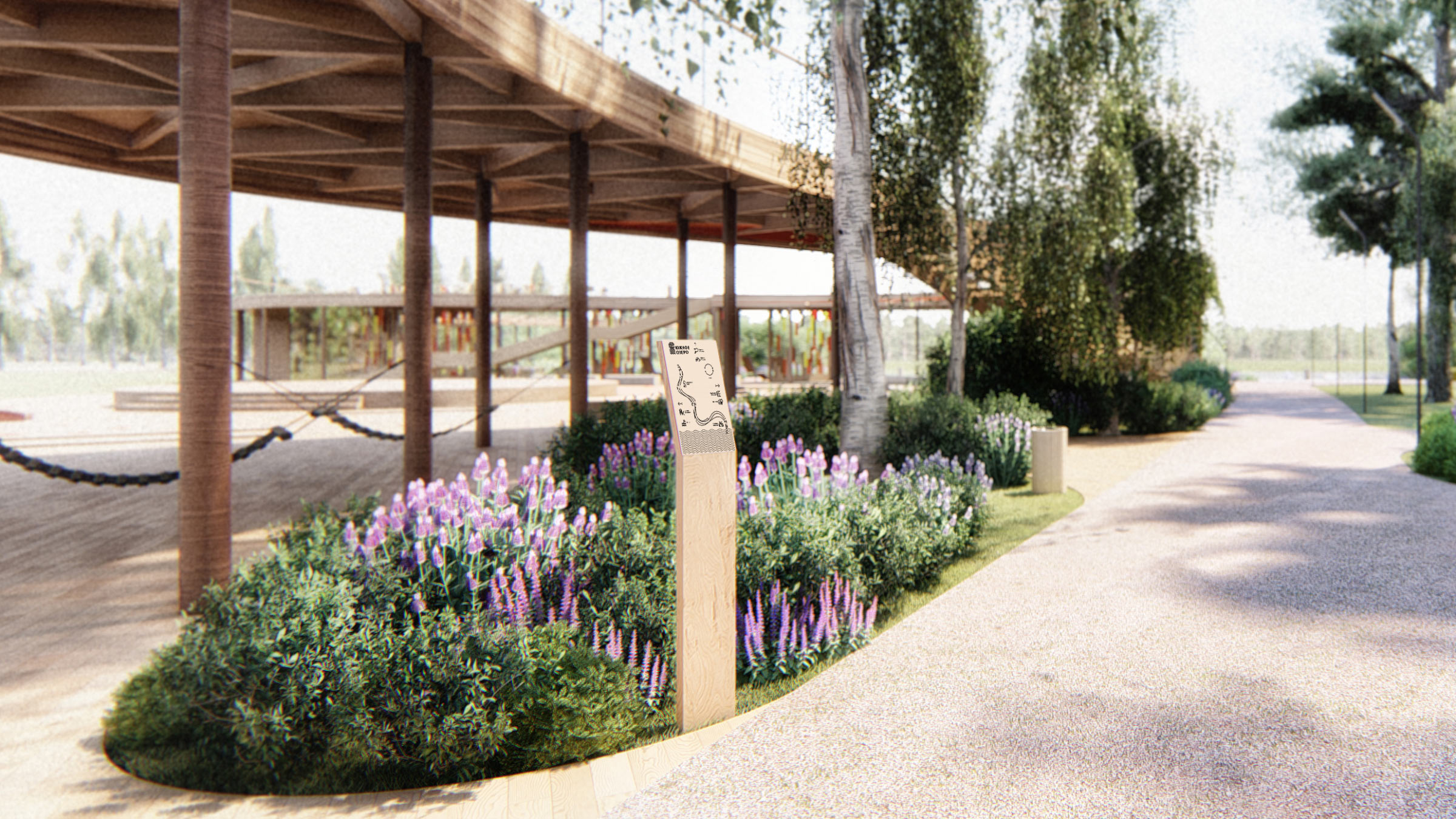 The primary material used in the park is wood. Benches, buildings, pathways, café pavilions and even the observation deck are finished with wood, making the image of the park more natural and intimate.