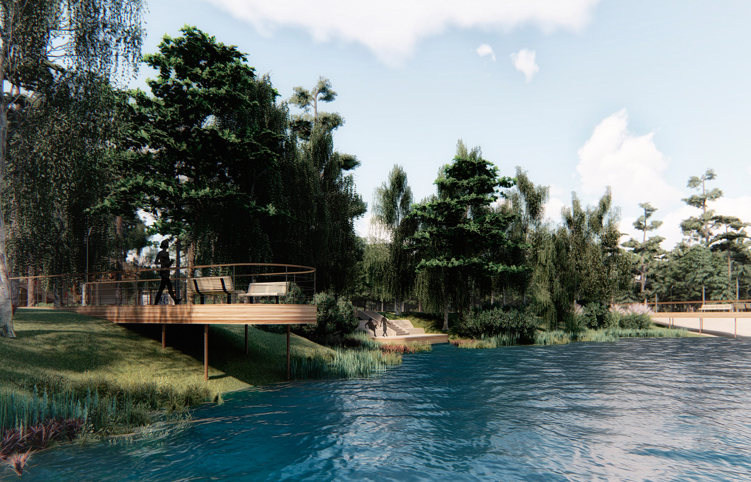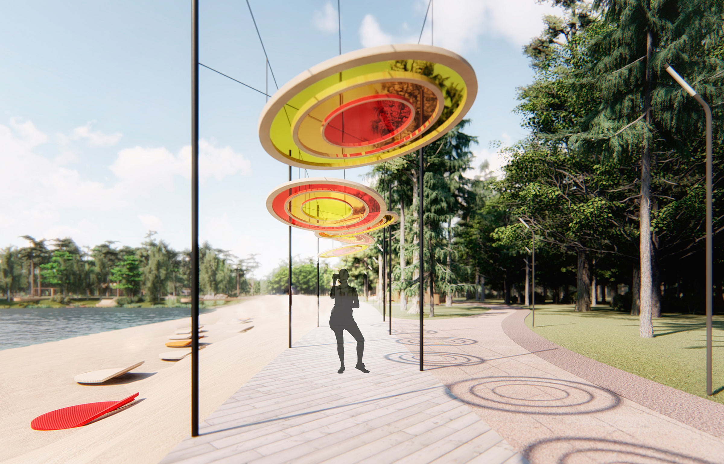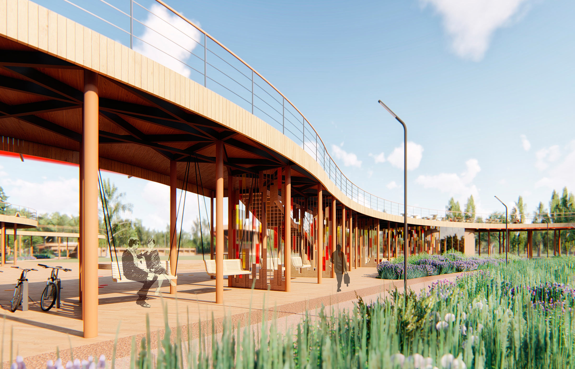 The most pleasant location in the park is the glade by the lake with a multifunctional observation deck made of wood. The long curved area stretches along the entire glade. Swings, hammocks, kiosks and café are underneath it and cozy benches are on top.
