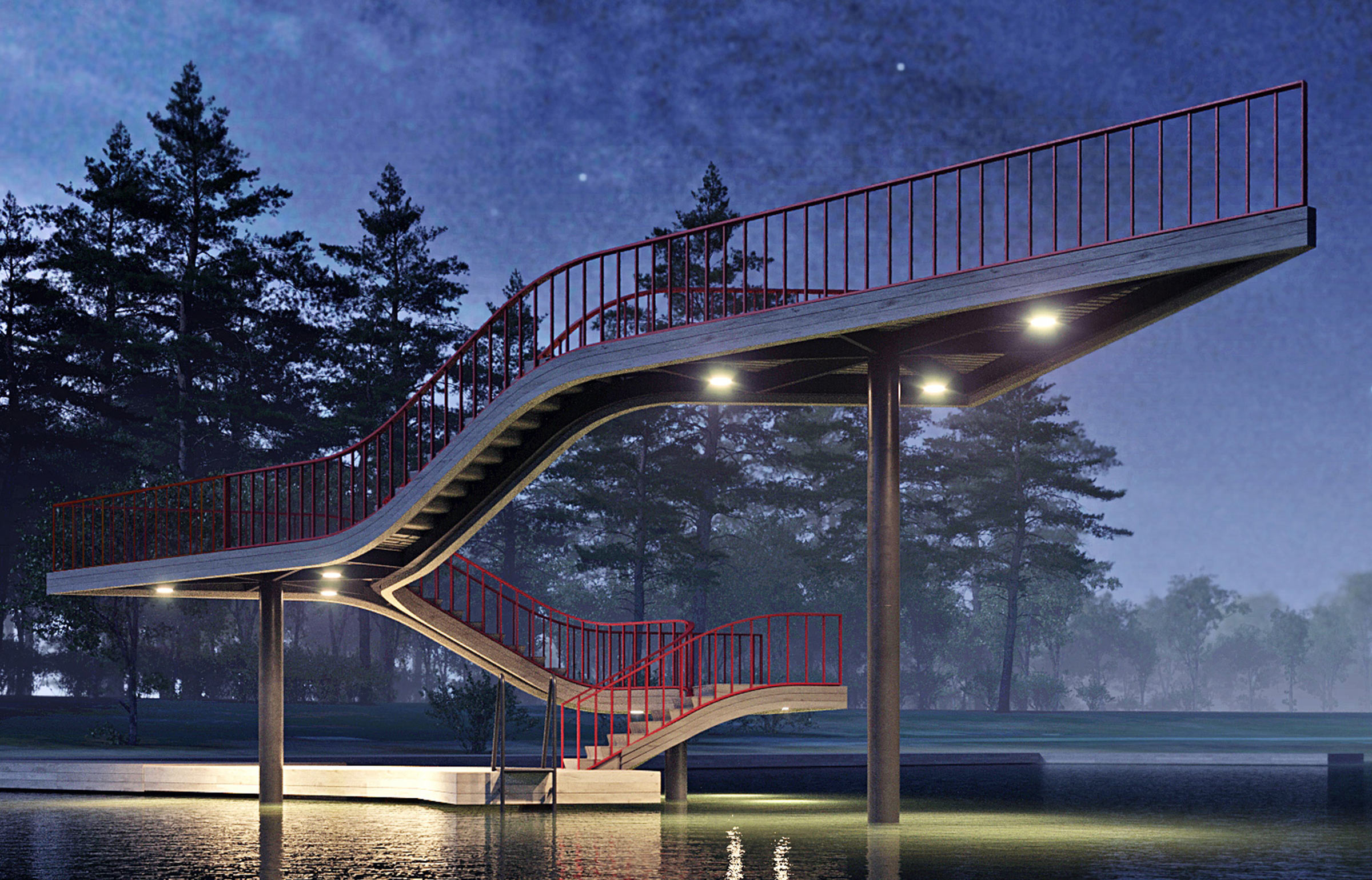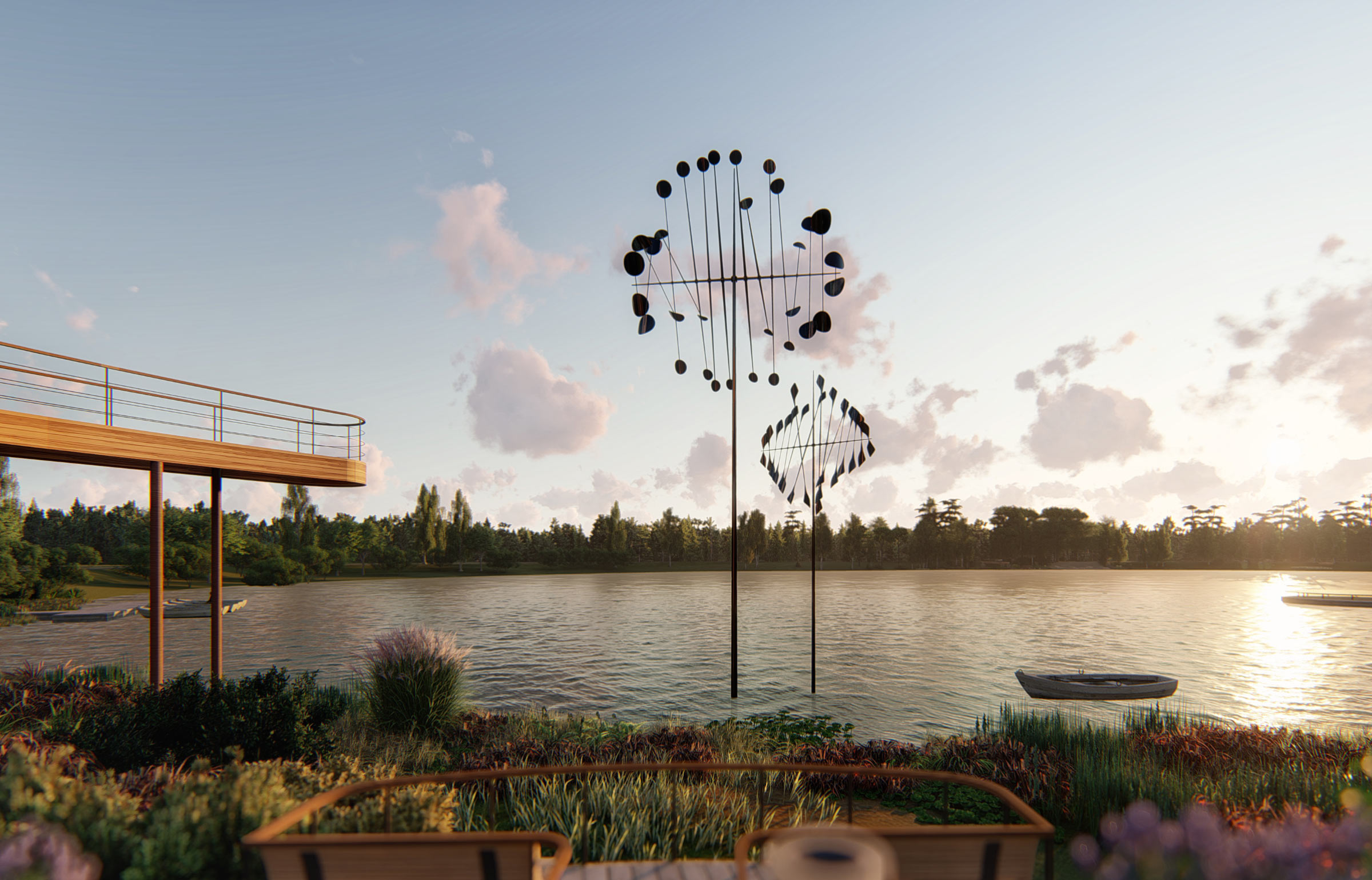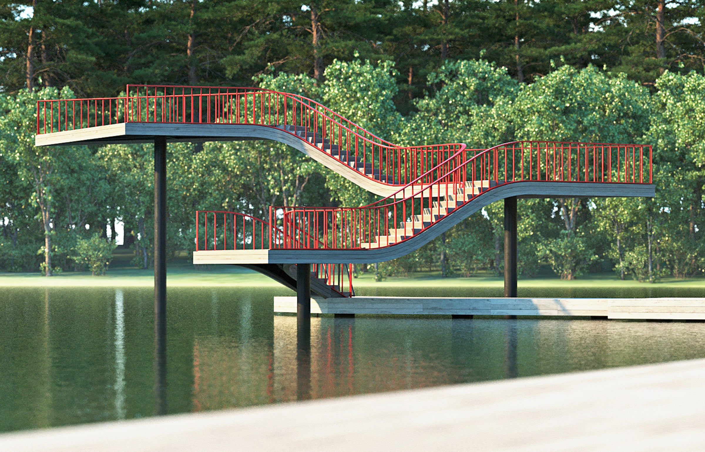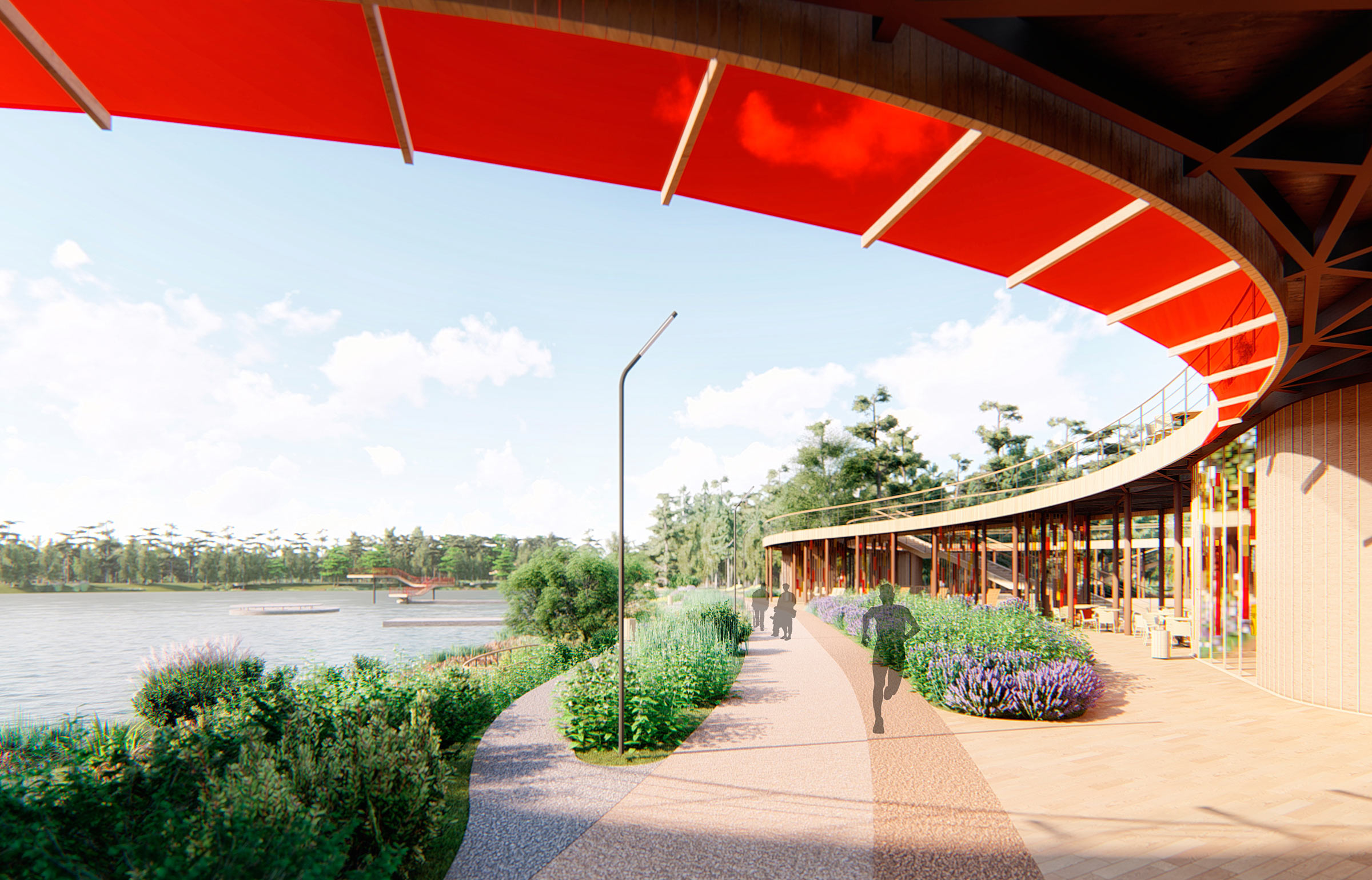The most pleasant location in the park is the glade by the lake with a multifunctional observation deck made of wood. The long curved area stretches along the entire glade. Swings, hammocks, kiosks and café are underneath it and cozy benches are on top.