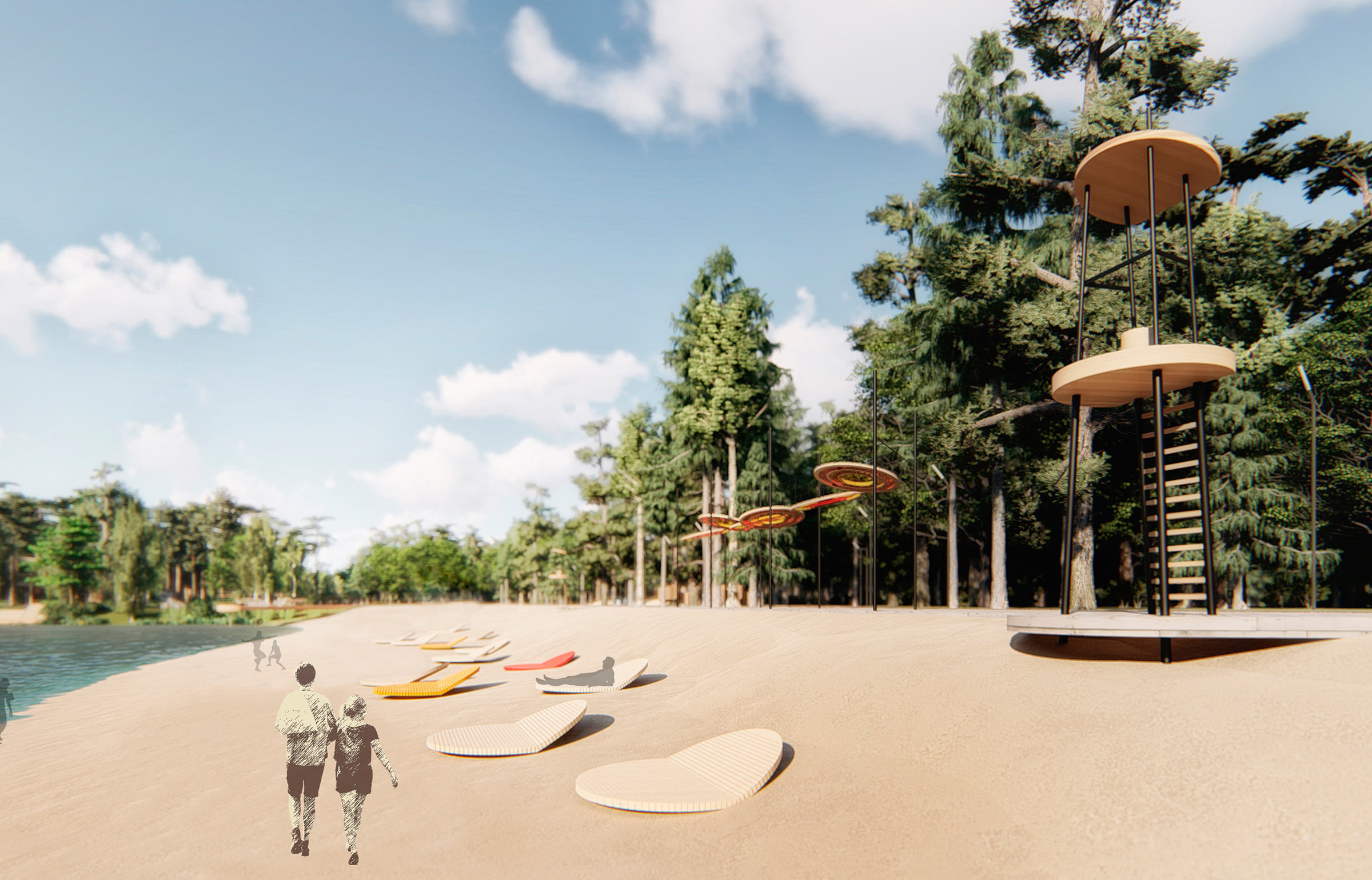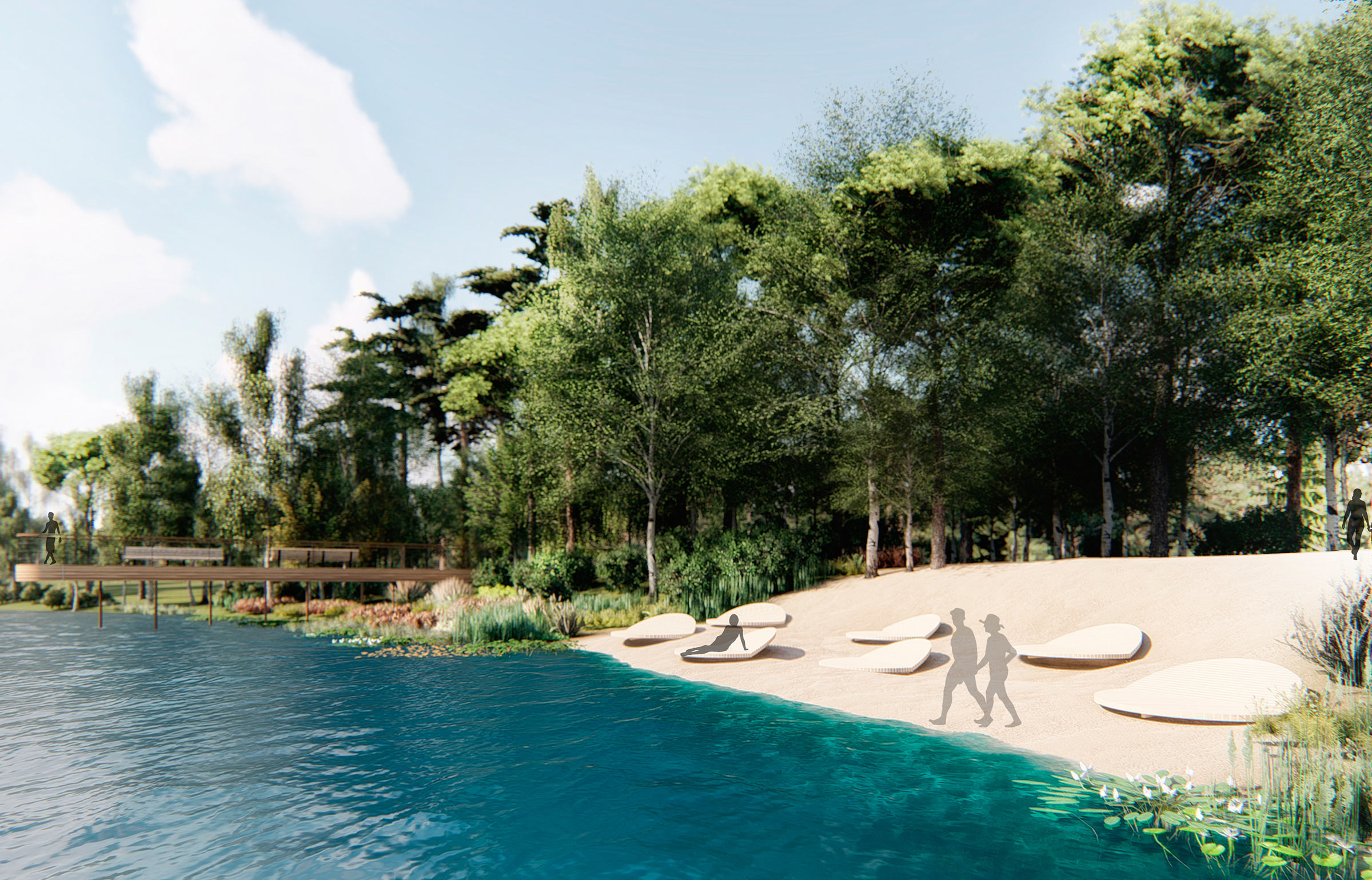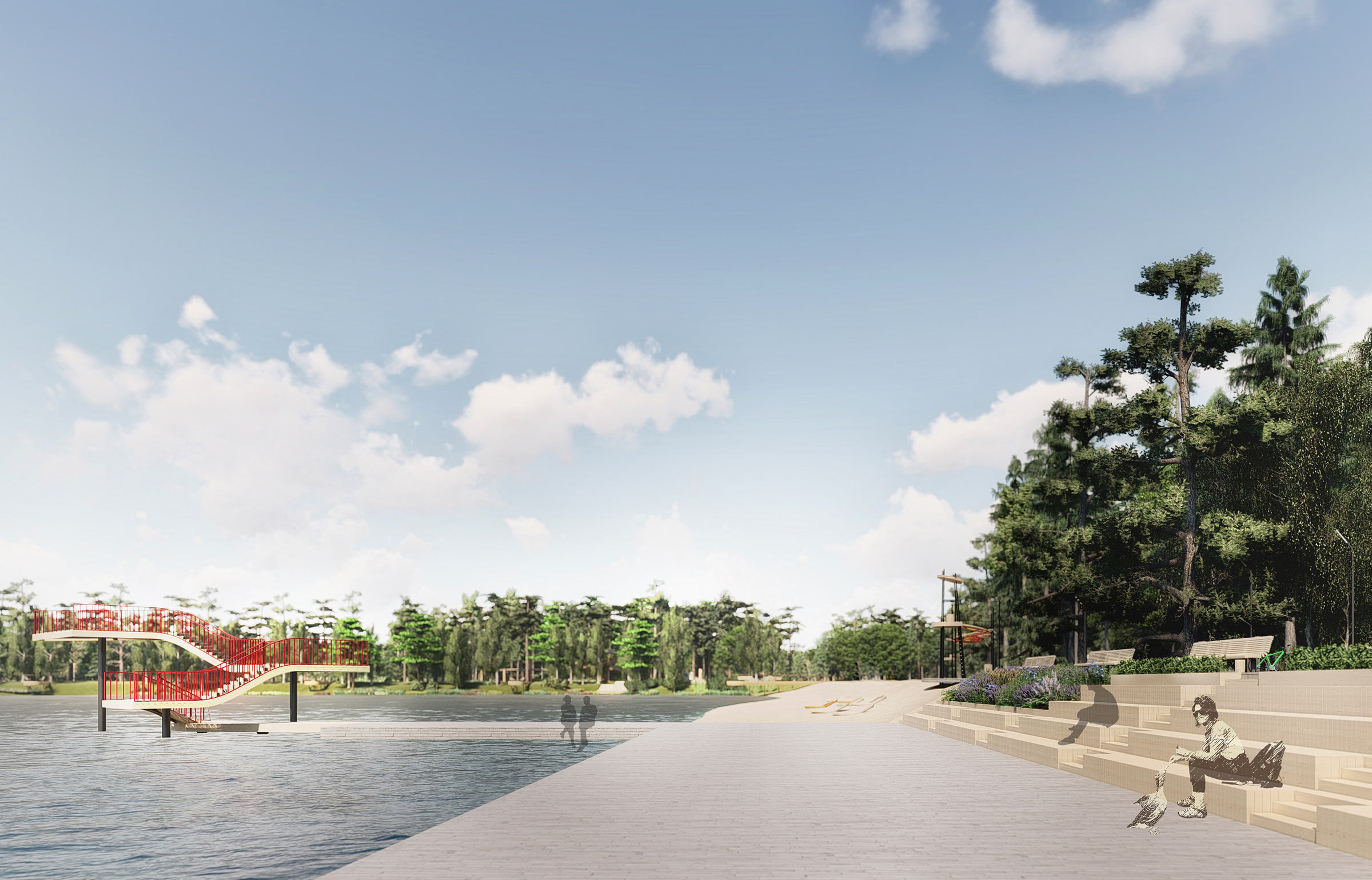 On the other side of the lake is a beach and a nice wooden embankment with an amphitheater and a floating stage.