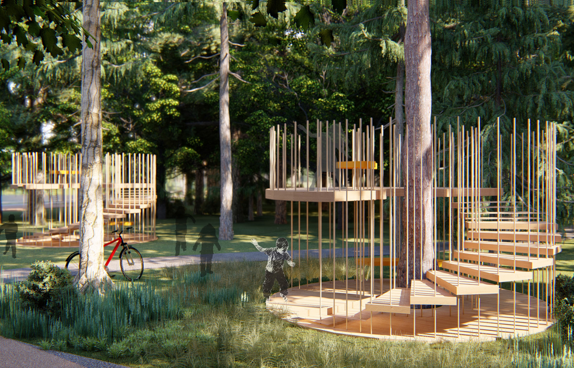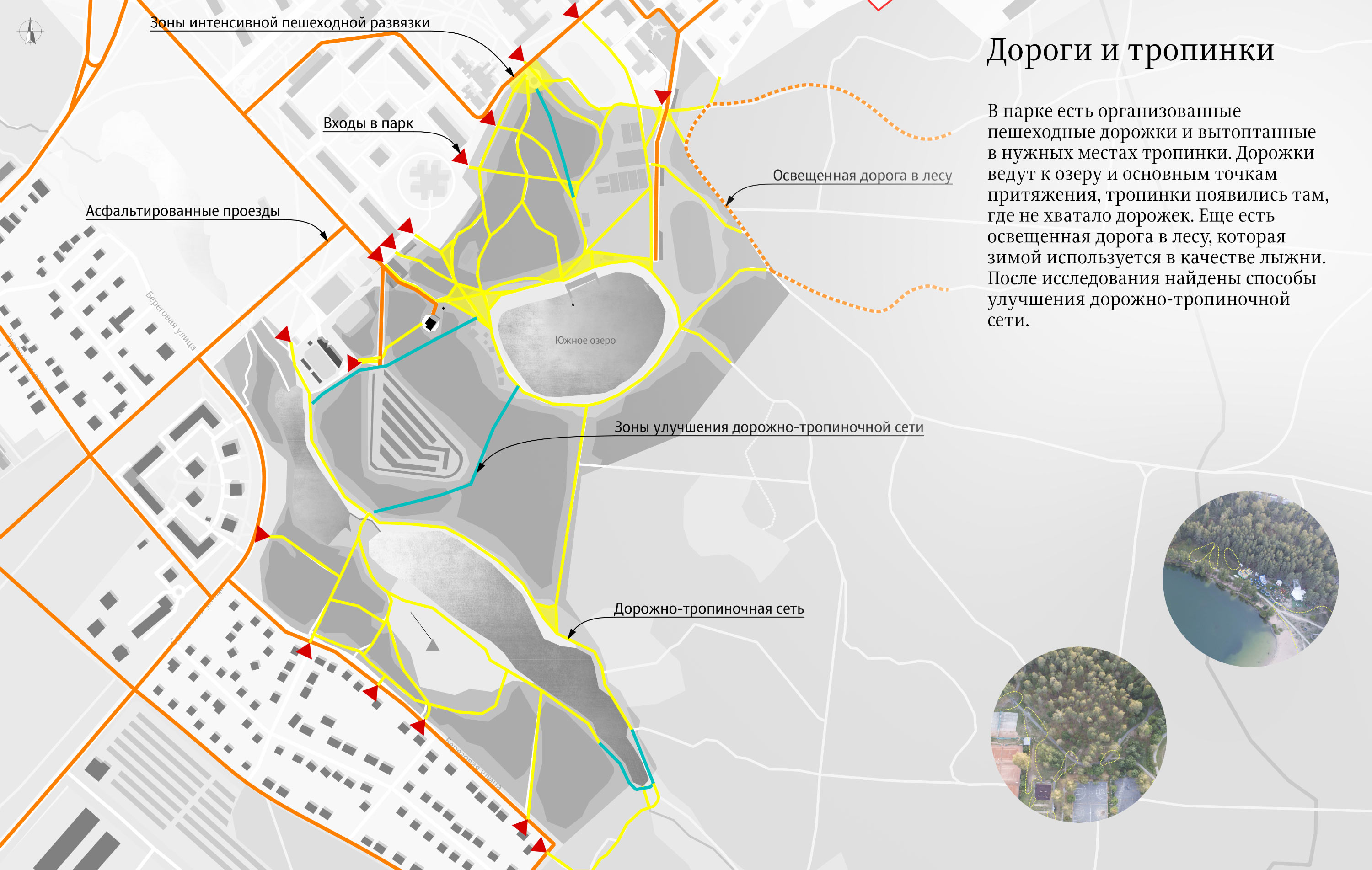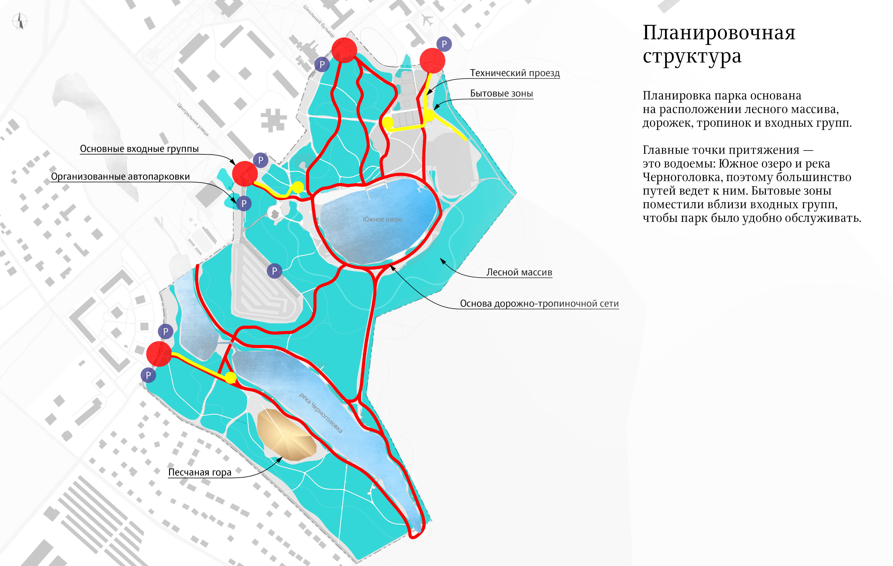 The park’s layout is based on the location of the forest, pathways, paths and entrances.