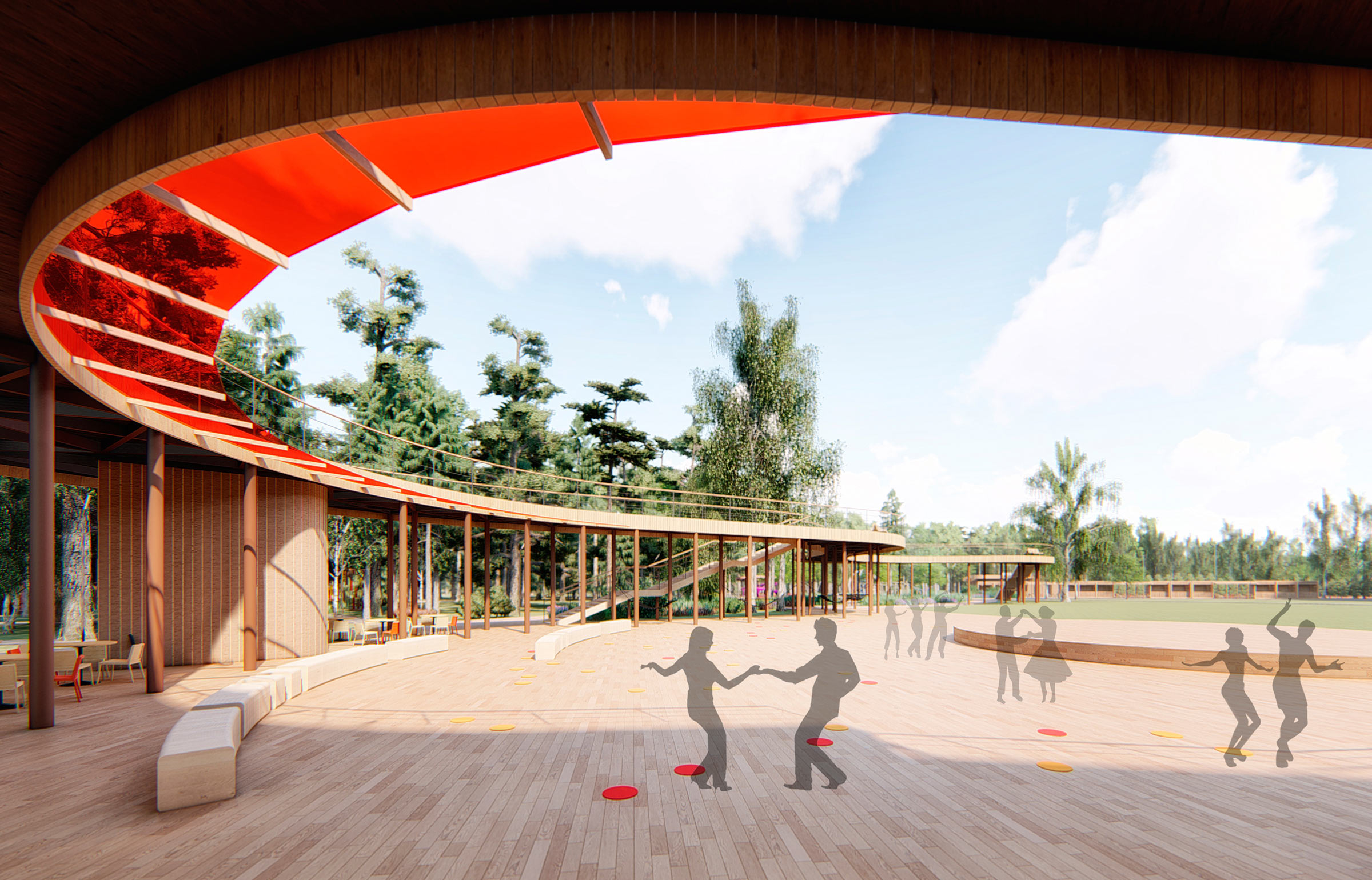 In the forest, by the lake and by the river are quiet areas for recreation. There are bridges and low piers by the water while in the forest there are gazebos for board games, benches and sun loungers.