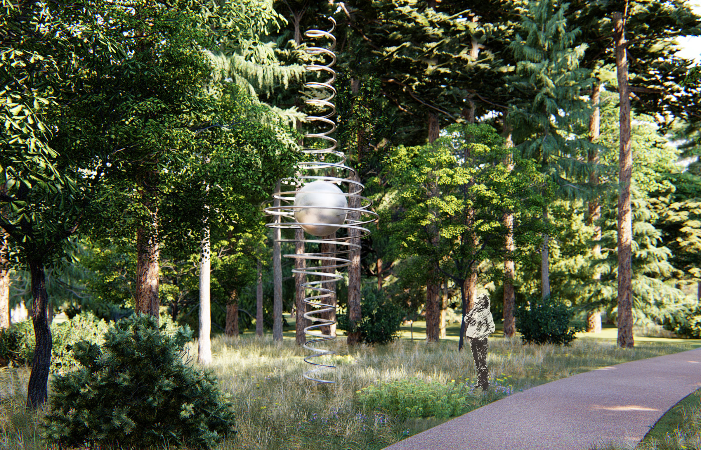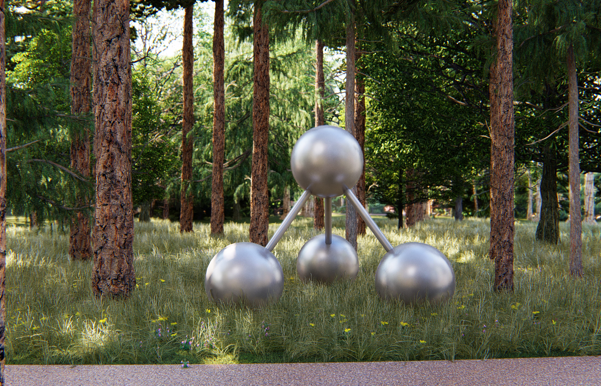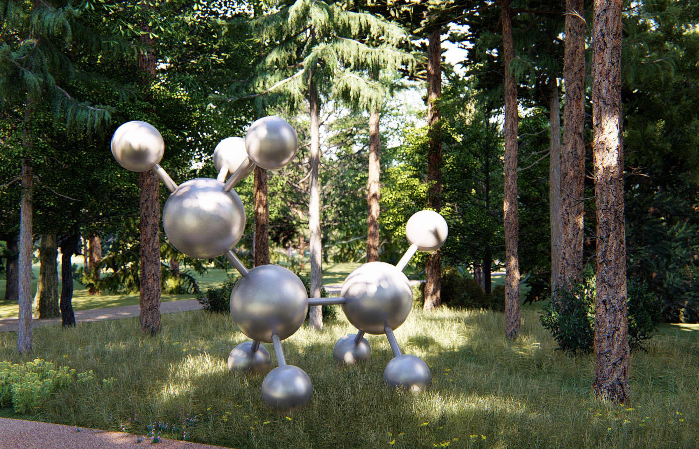 Abstract metal art objects provide a pleasant contrast with nature and remind about the place of science in the city’s history.