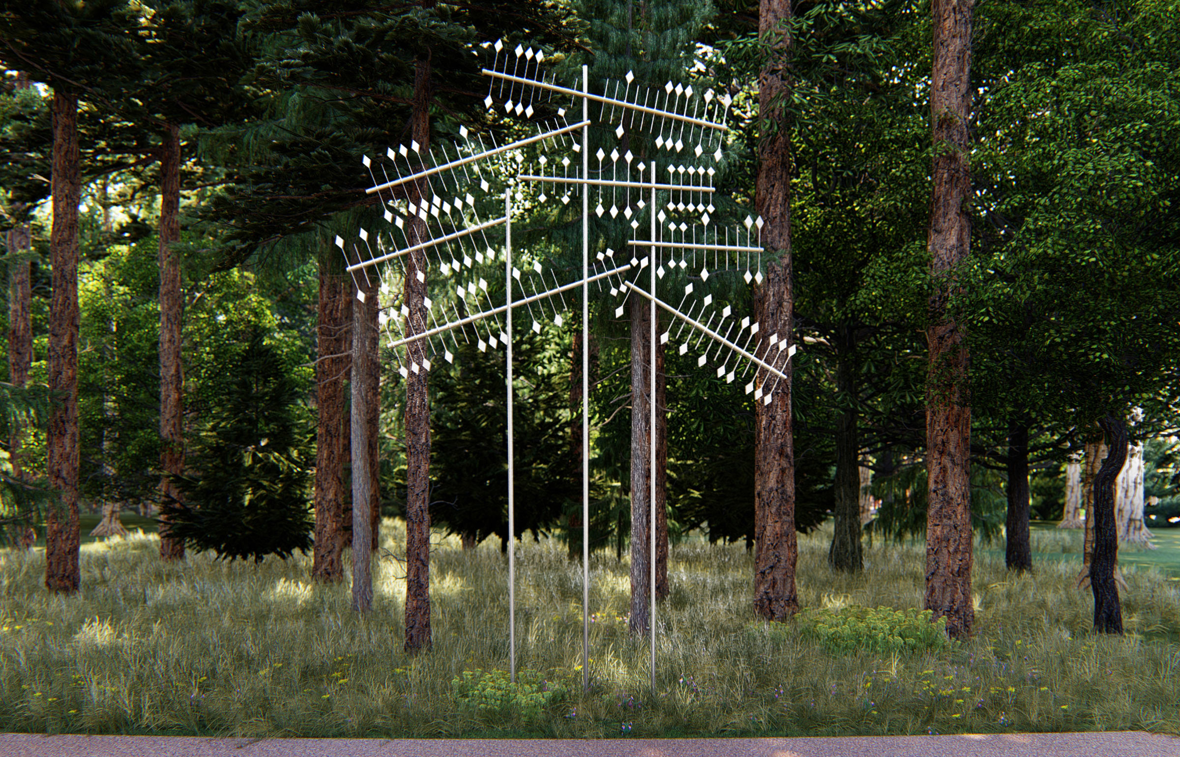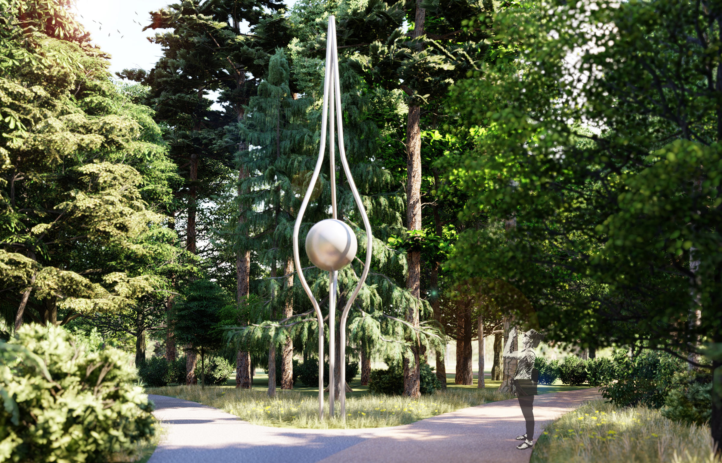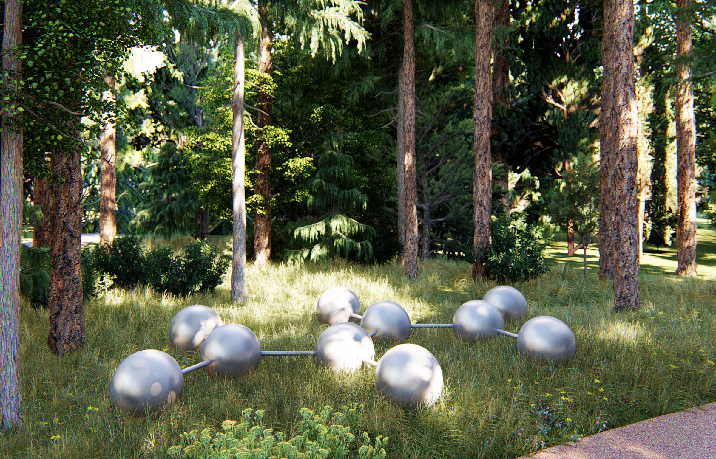 Abstract metal art objects provide a pleasant contrast with nature and remind about the place of science in the city’s history.