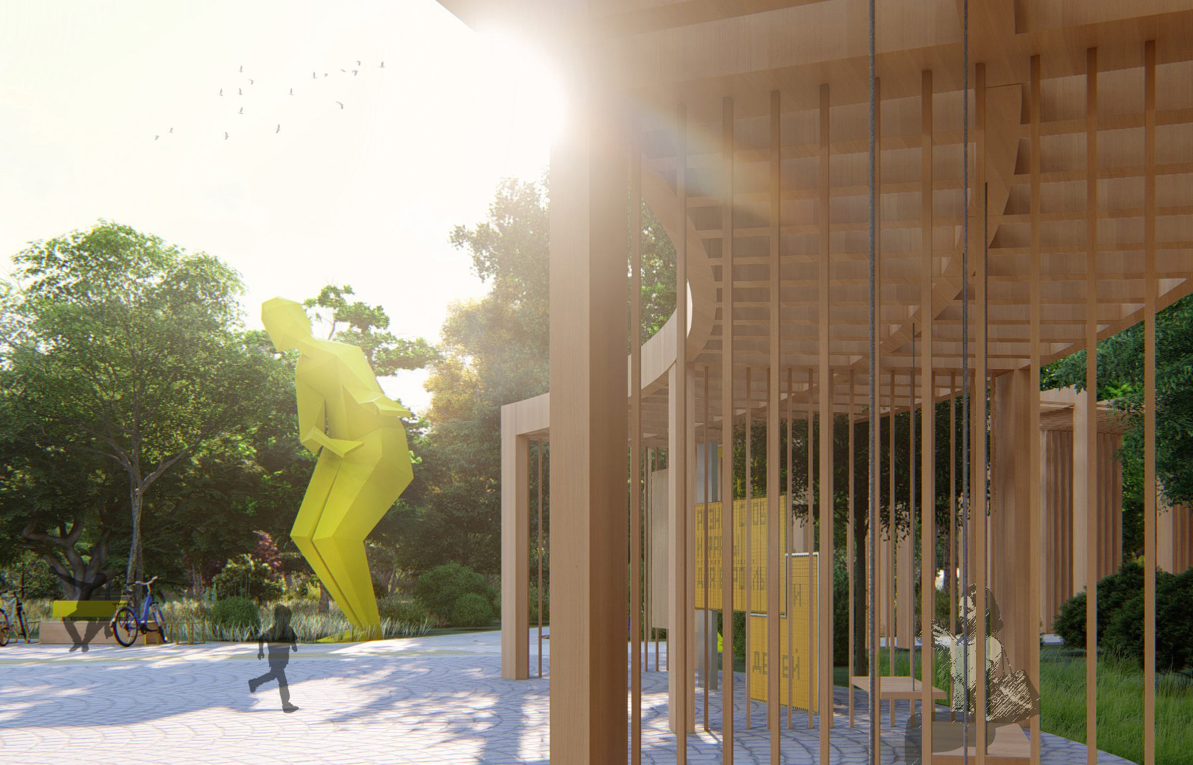 Next to the fountain there are benches with bike racks and an art object, a yellow figure of a person inviting to enter the park. Beautiful!