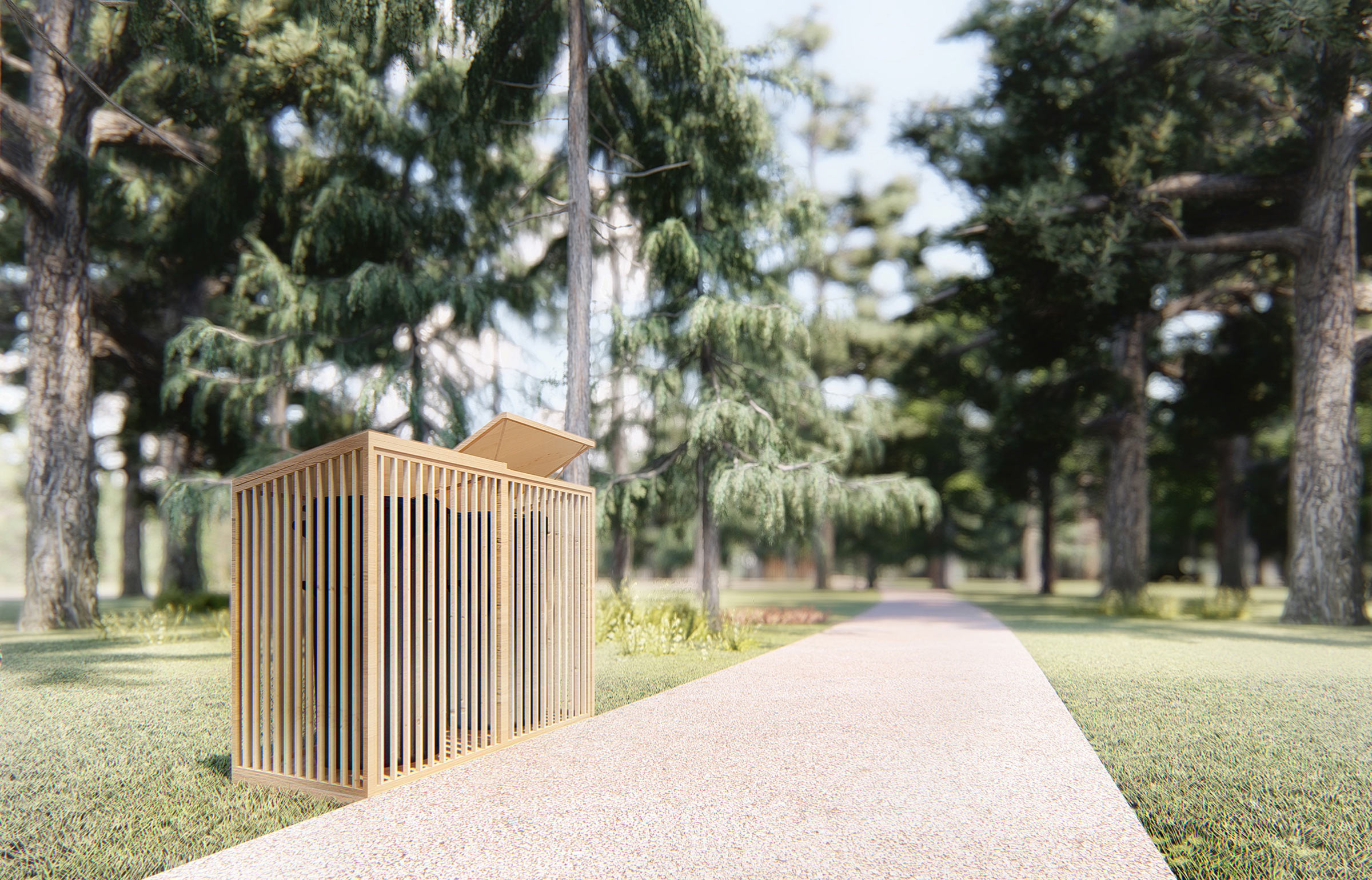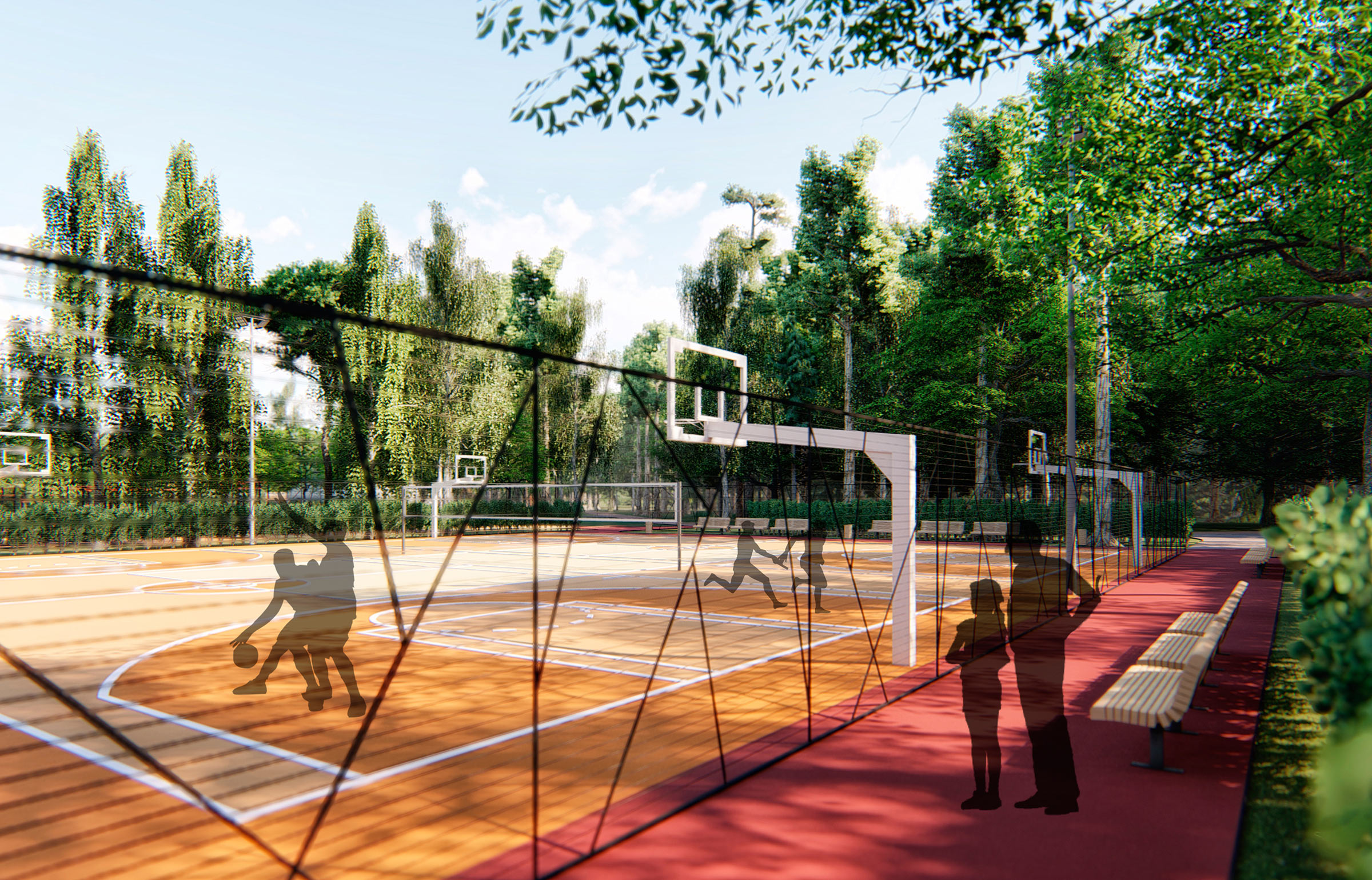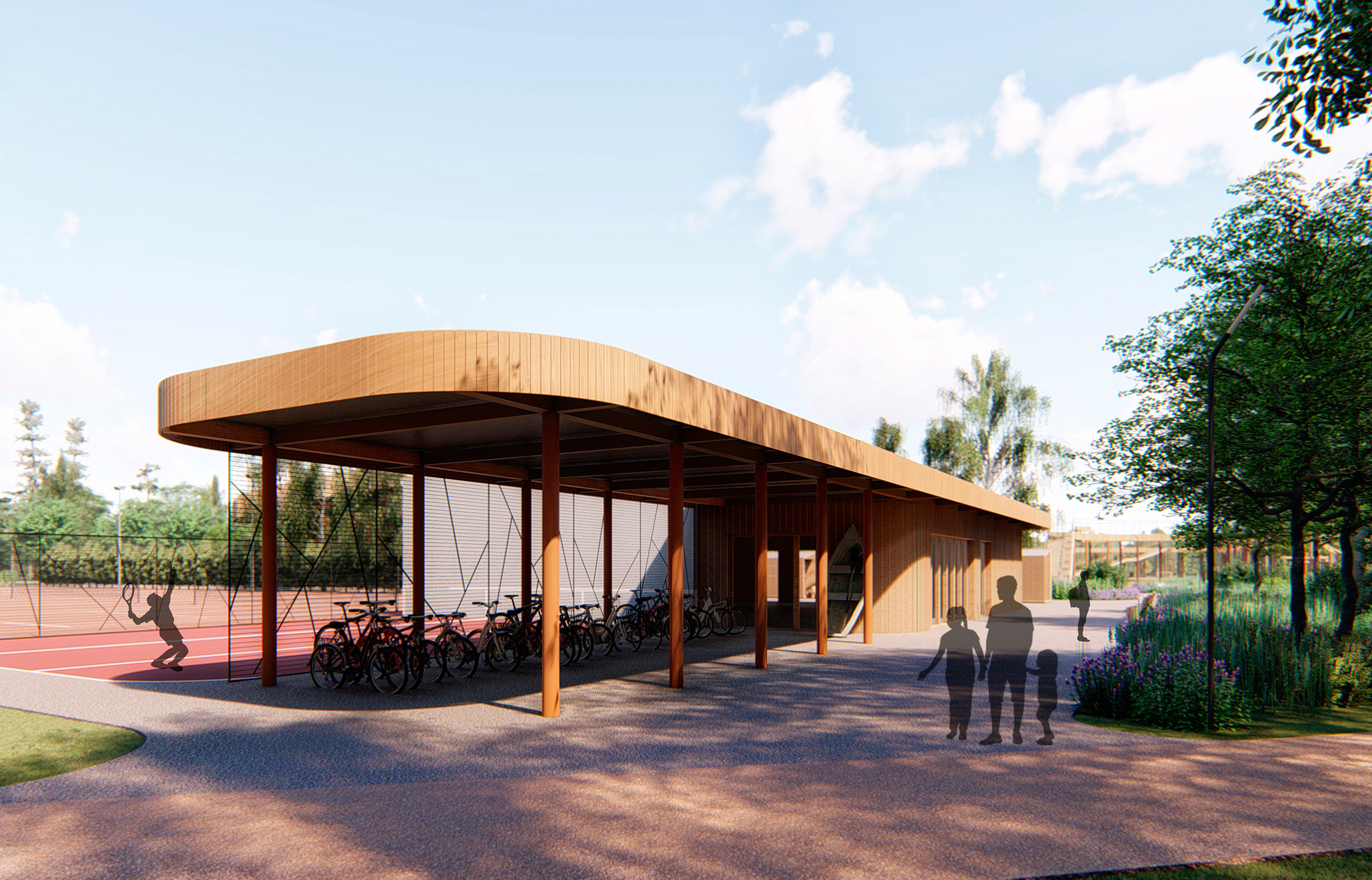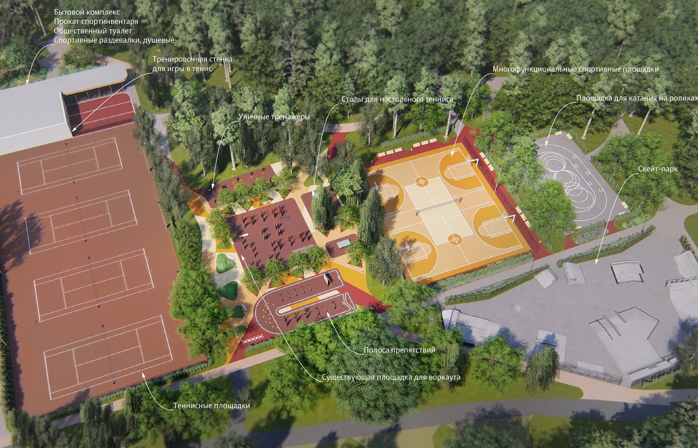 The functioning of the park is ensured by four service zones with technical facilities: a guardhouse, waste collection areas, warehouses, locker rooms, utility rooms and public washrooms.