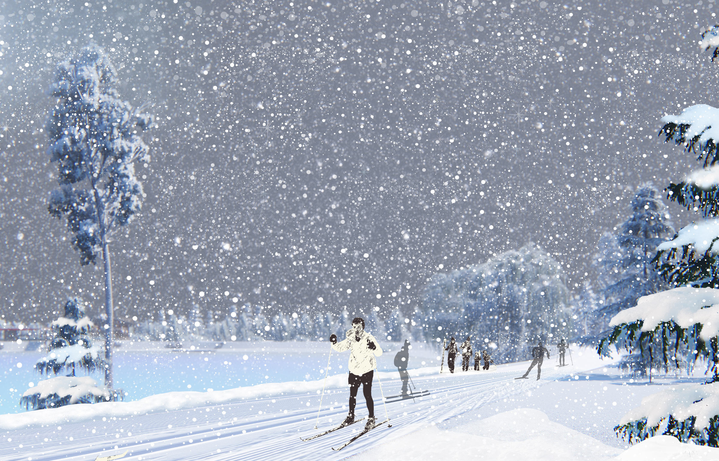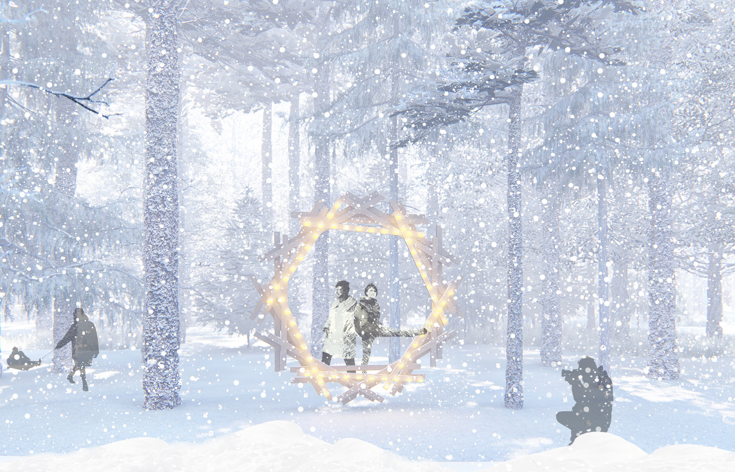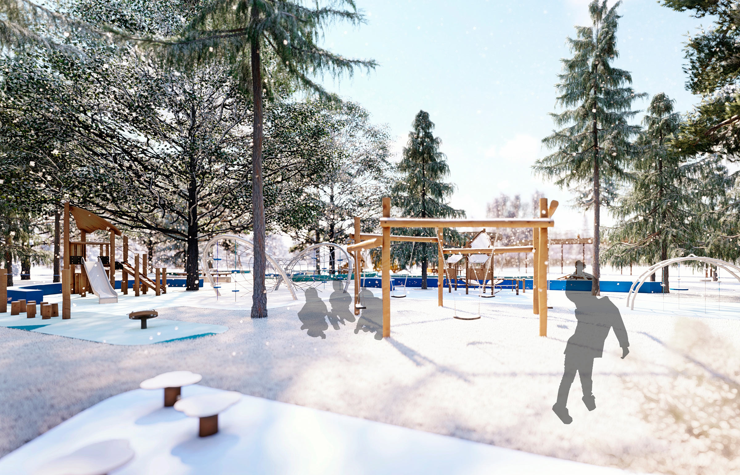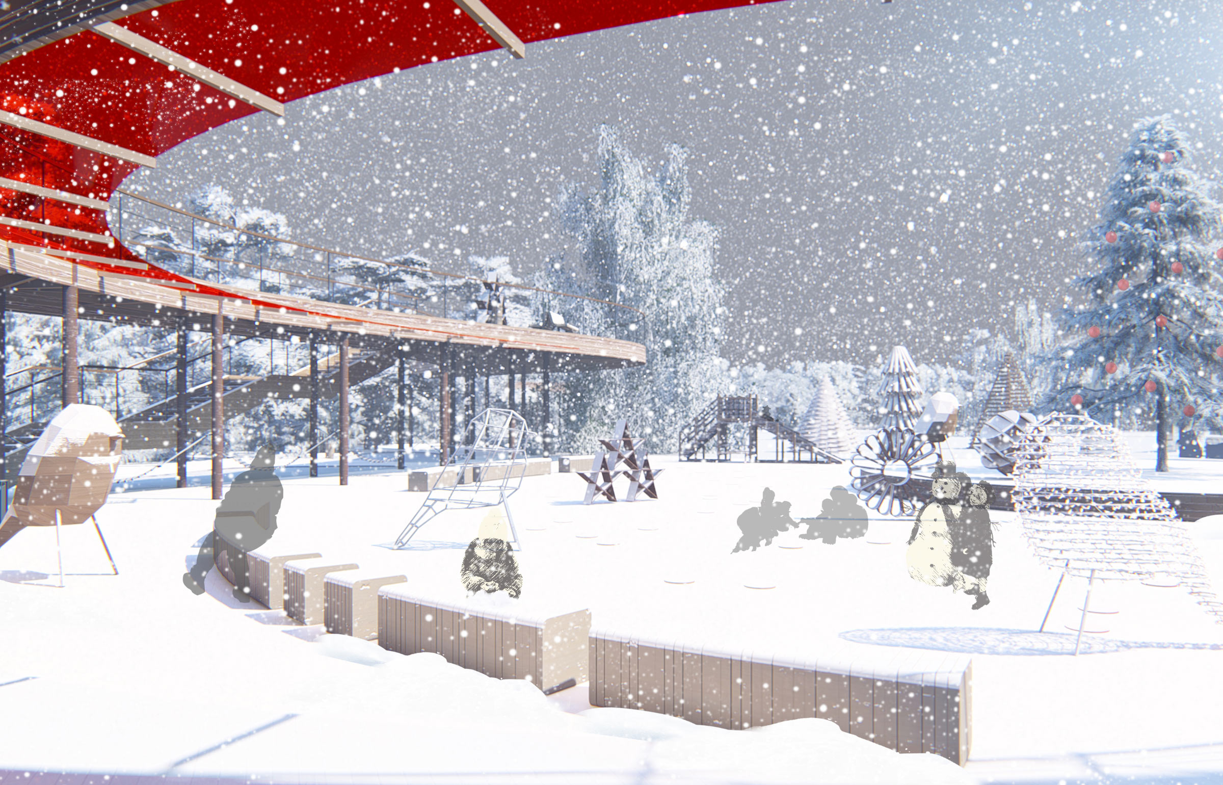 The park completely transforms in the winter: a Christmas tree is put up and a large wooden slide, new art objects and an ice fortress appear. Kiosks and pavilions host fairs where gifts and streetfood are sold. A cross-country skiing track is made in the forest.