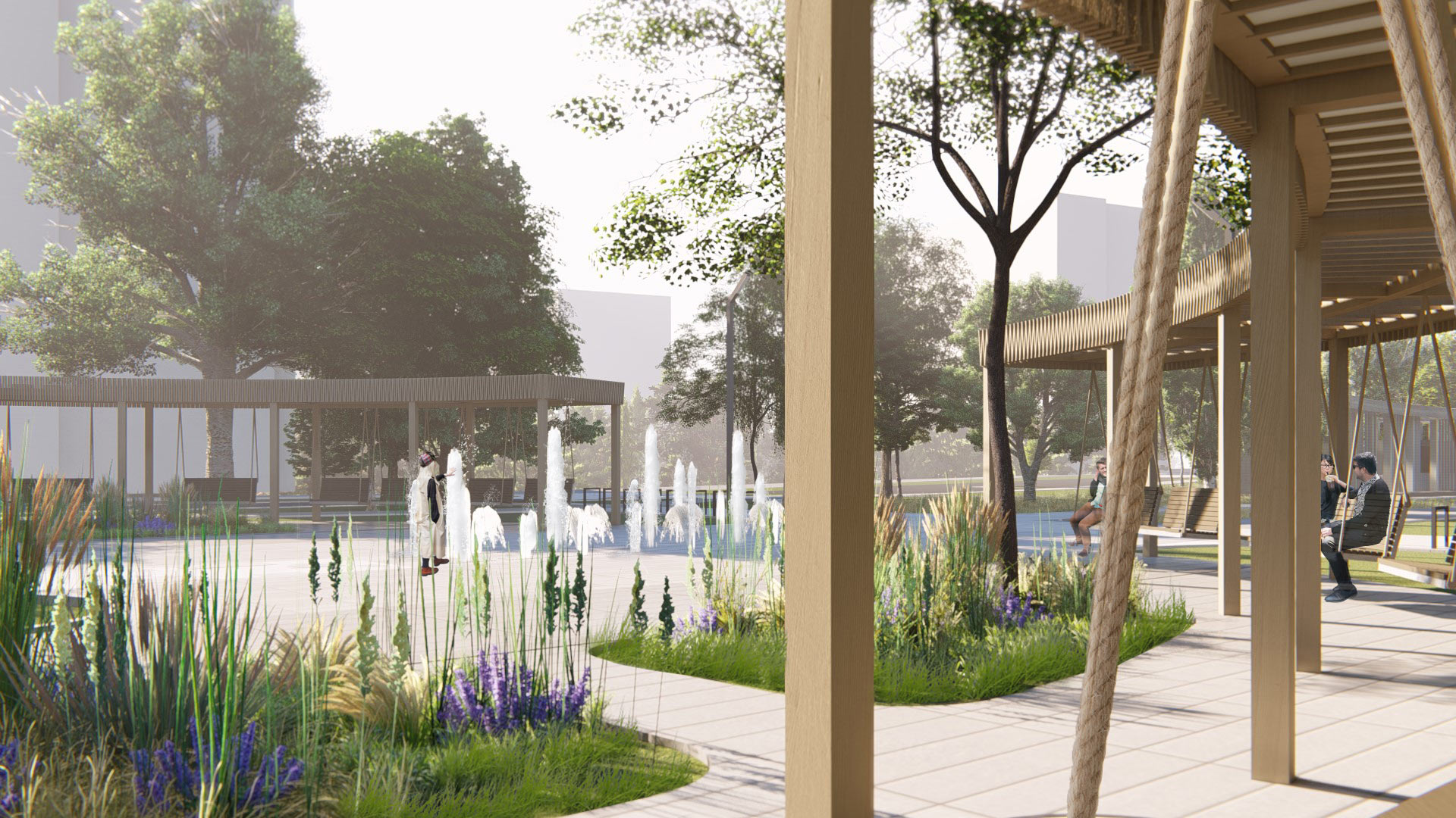 The active zone has a large canopied swing and a pedestrian fountain. The water shoots right out of the ground making it wonderful to run through in hot weather. All of this is next to a very beautiful alley with trees.