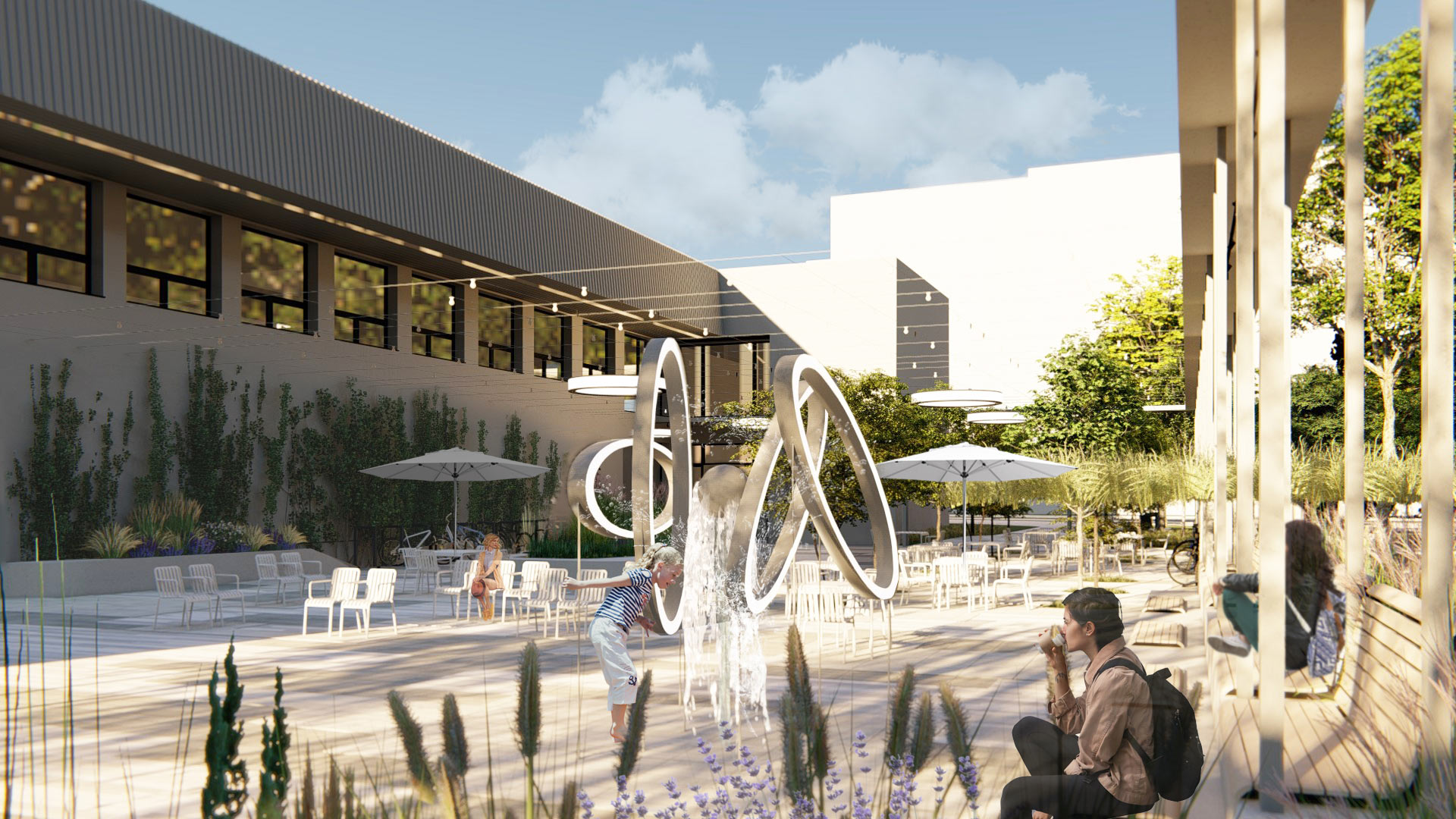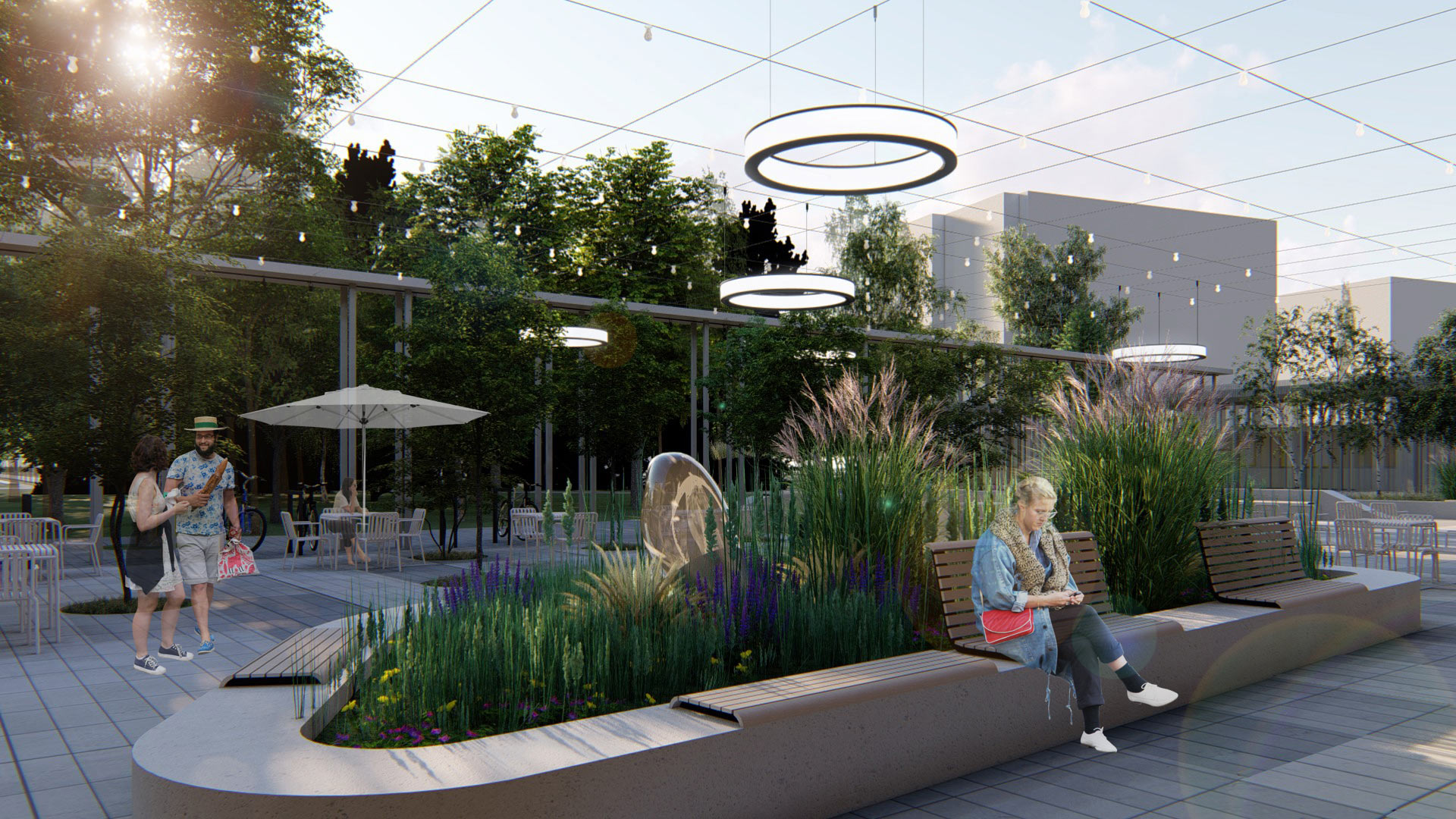 A small amphitheater with seats is located around the Atom art object. Different plants add to the feeling of comfort.