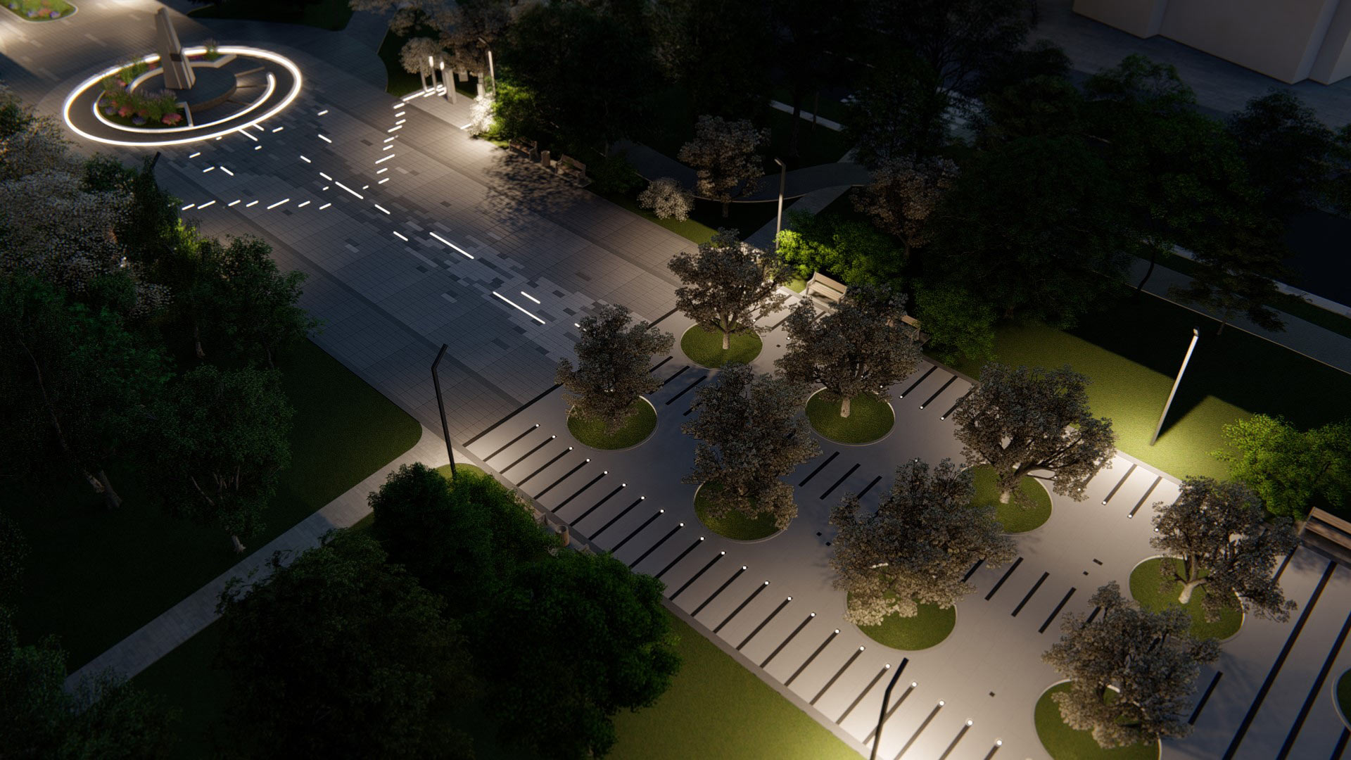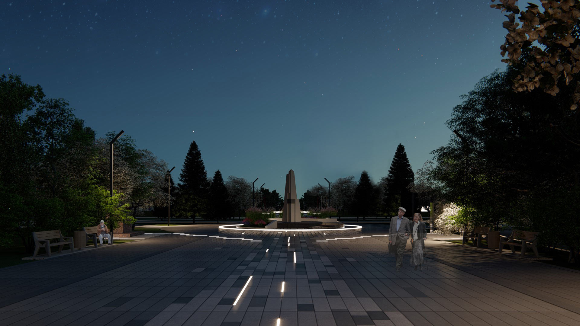 Paving leads to the monument to Soviet soldiers. Ground illumination turns on at night.