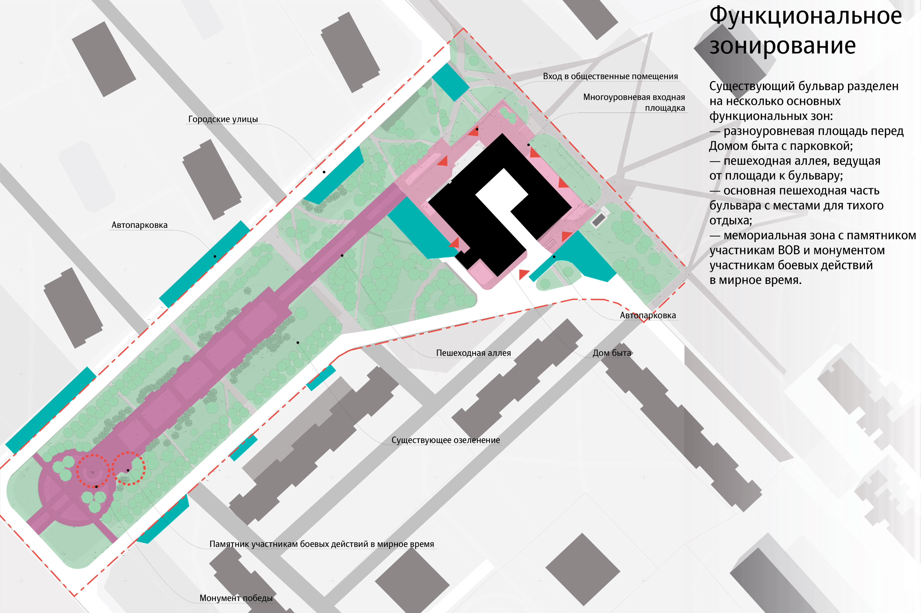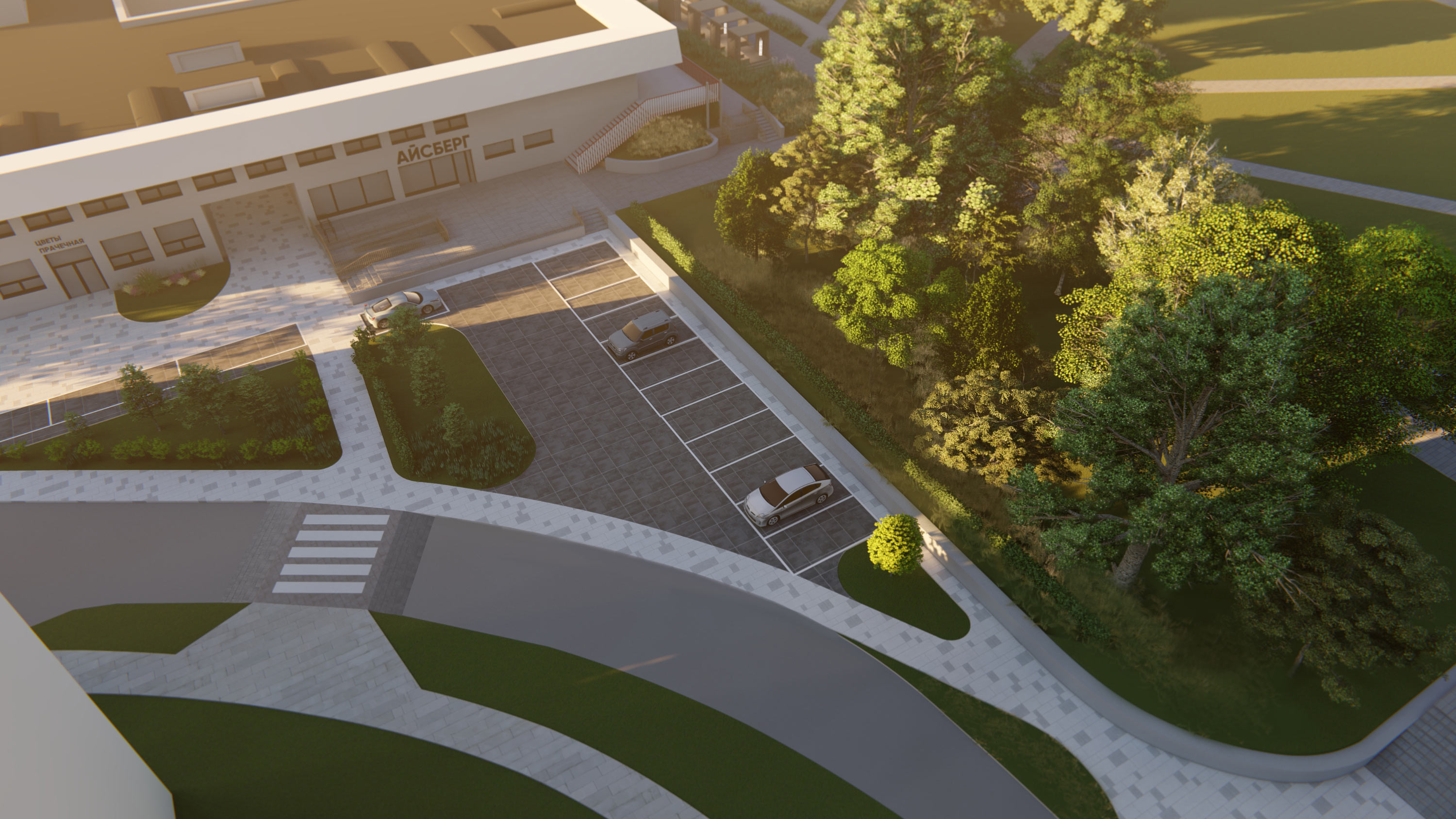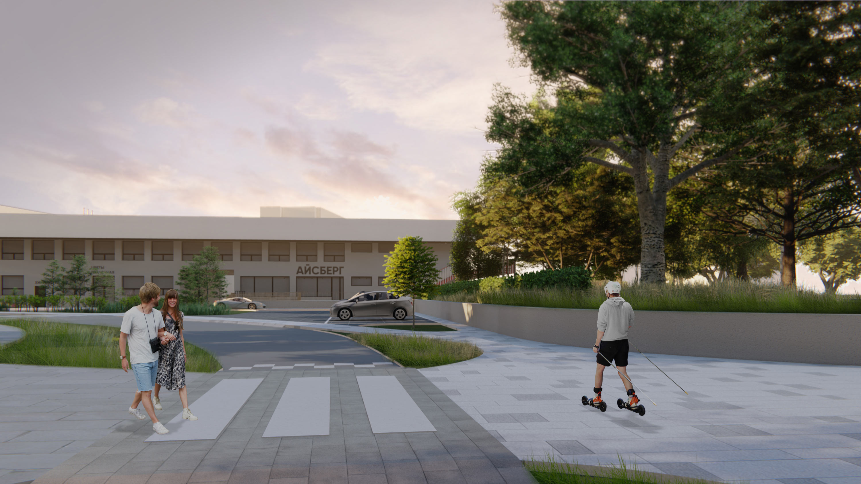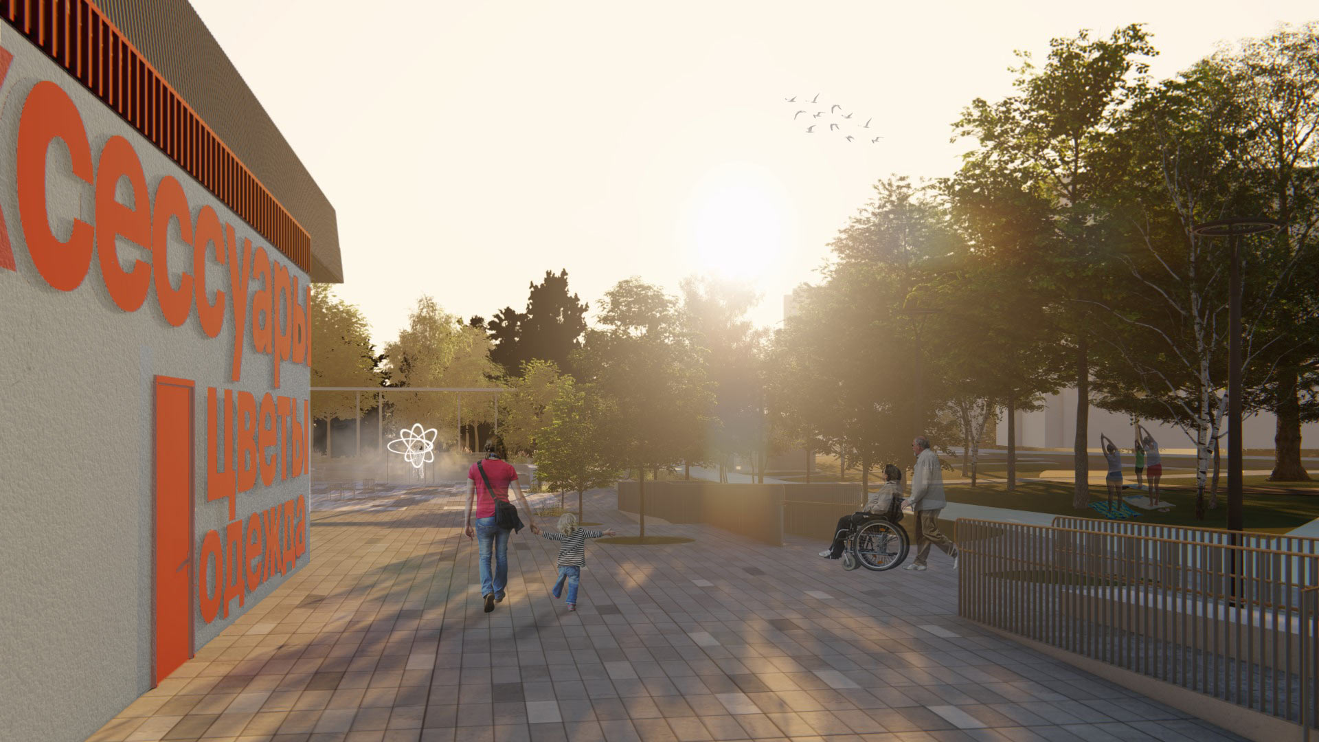 A central pedestrian axis goes from the Shkolny Boulevard to the Consumer Services Center. The walkways are paved with tiles and stones and are surrounded by pleasant vegetation.
