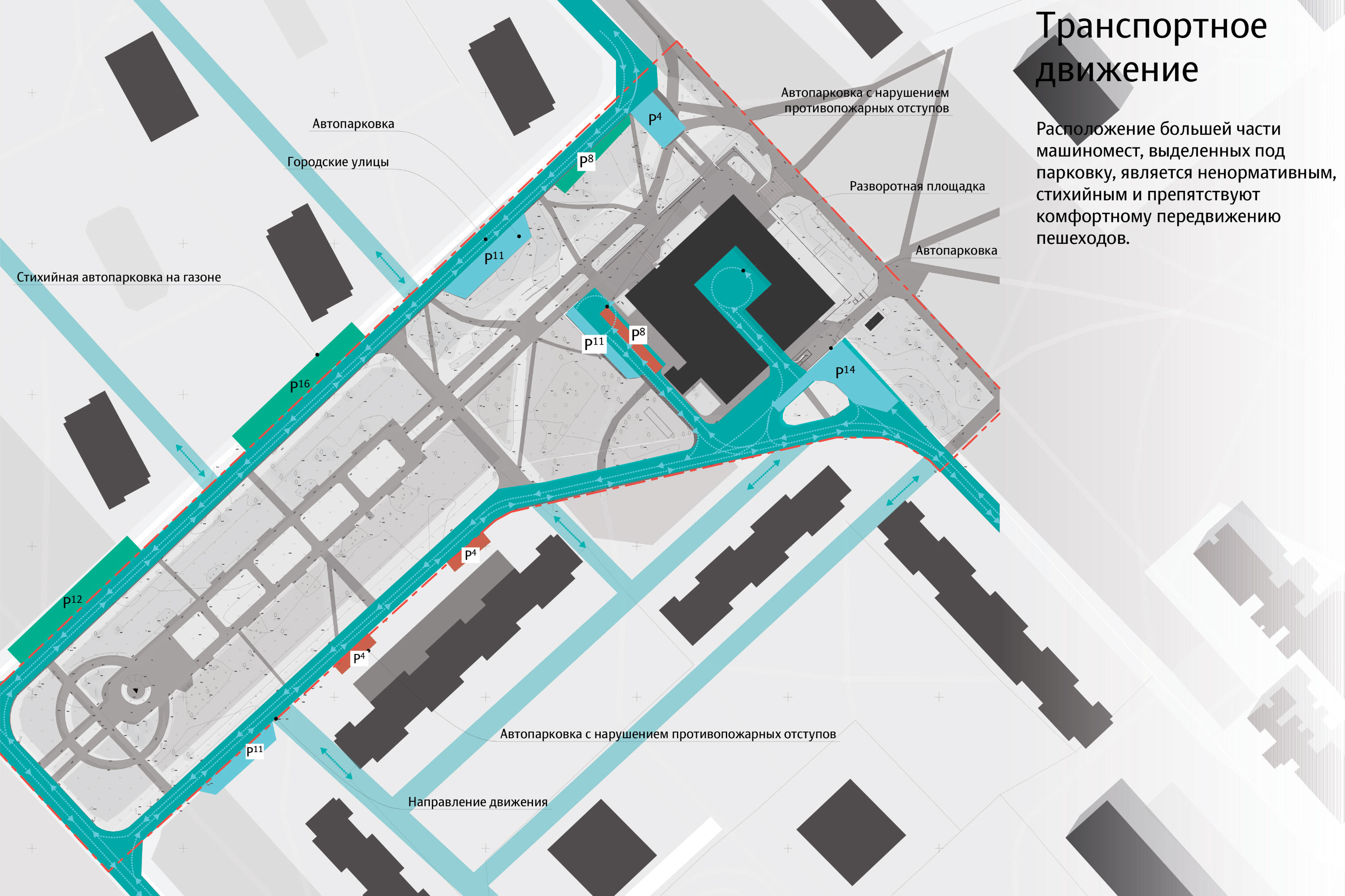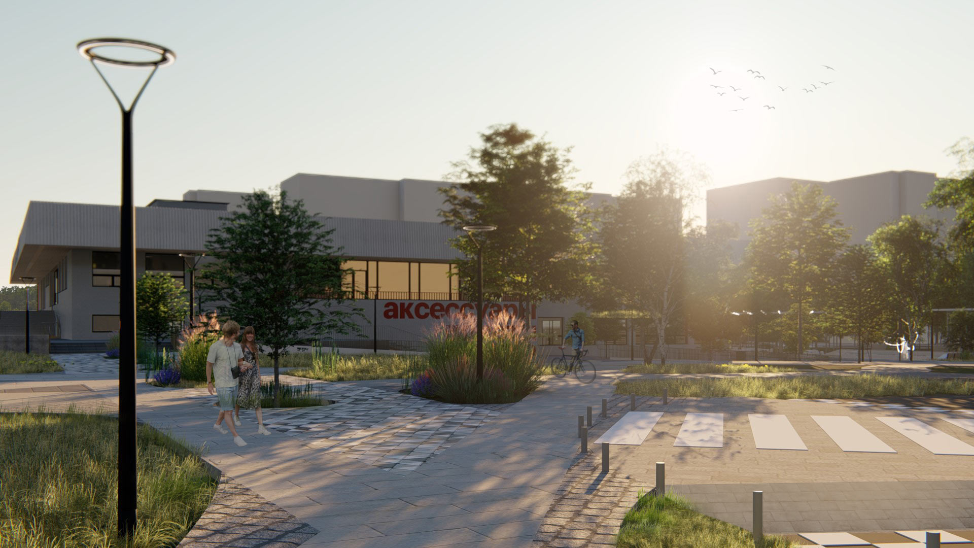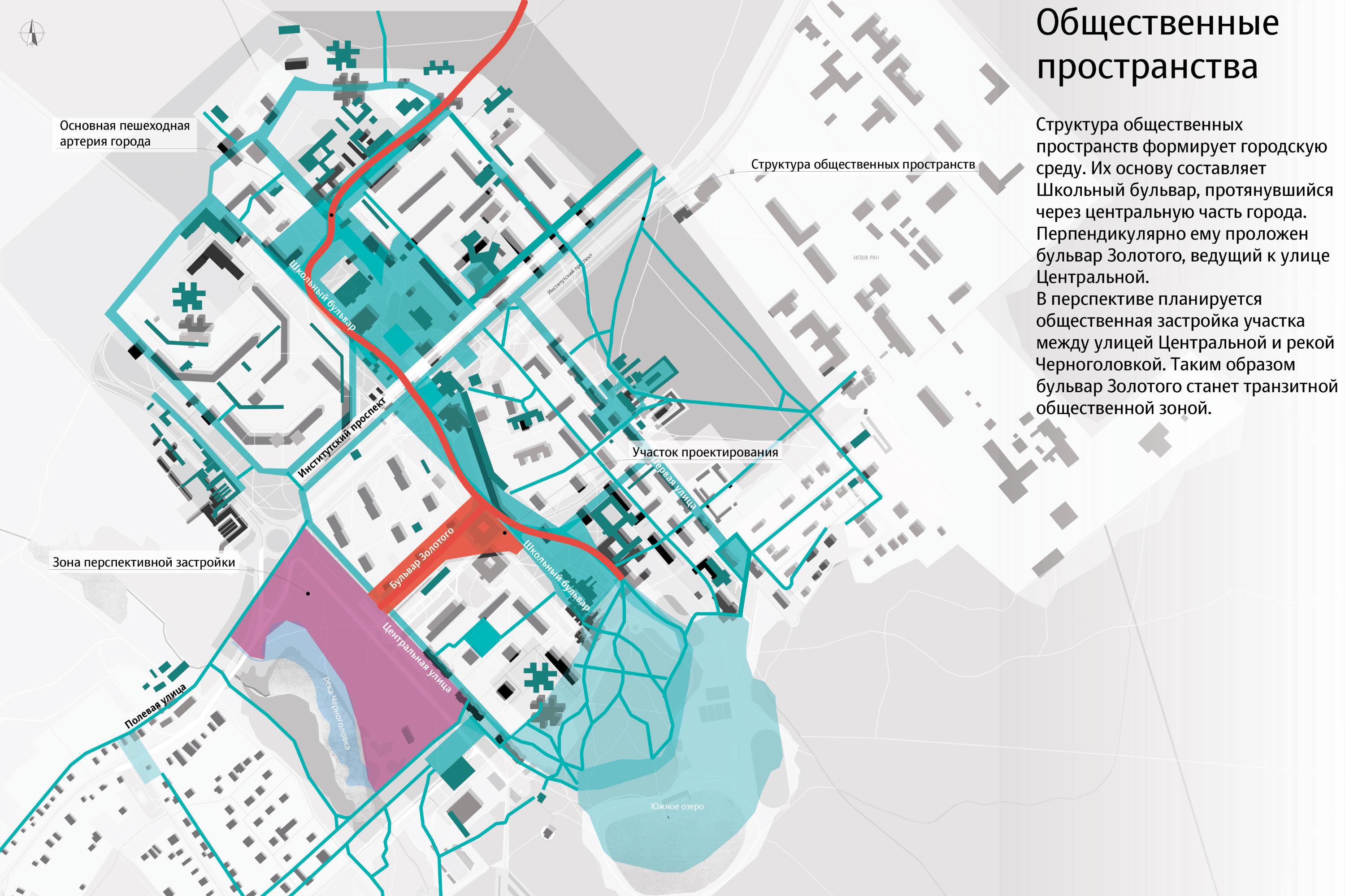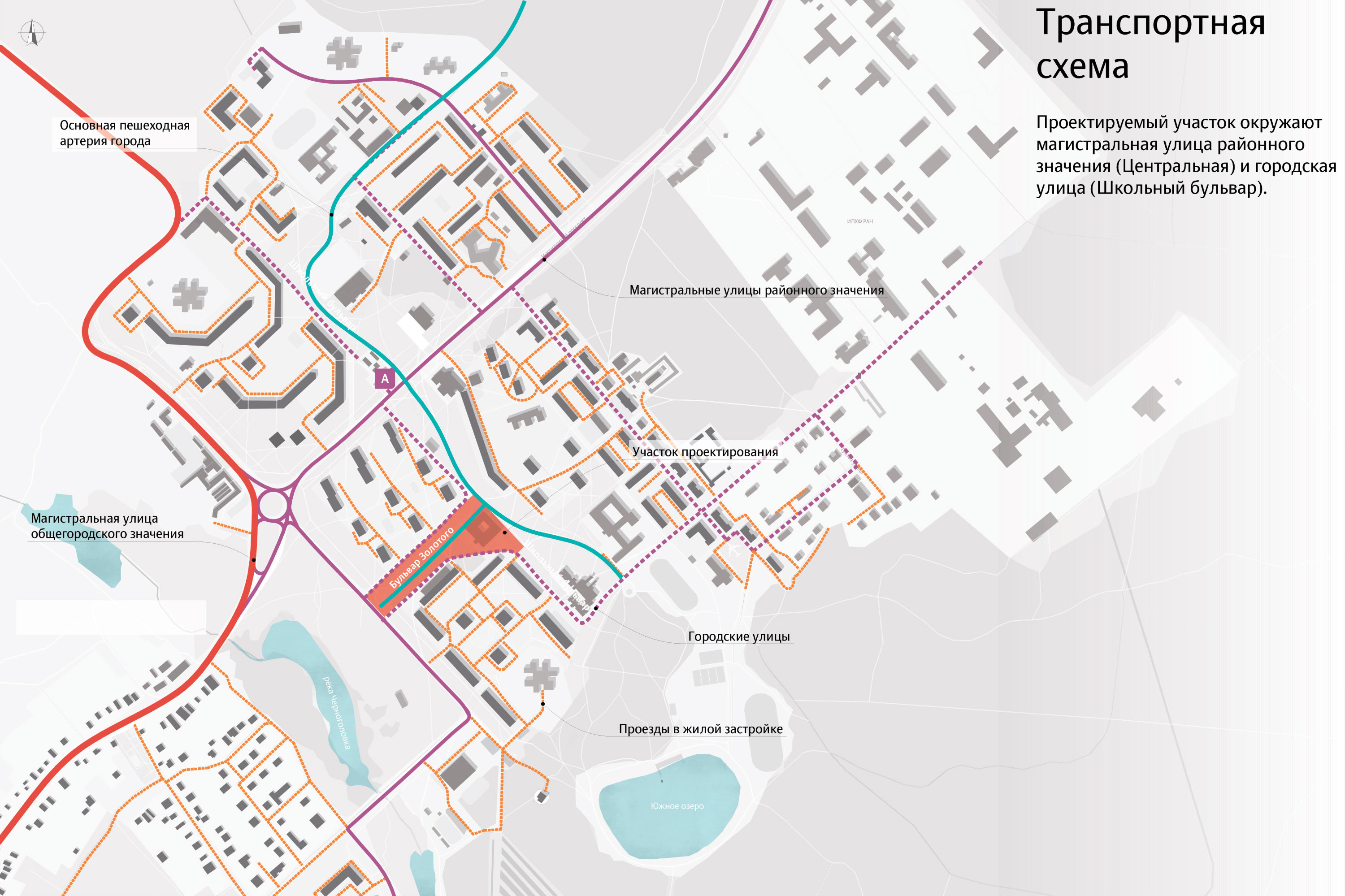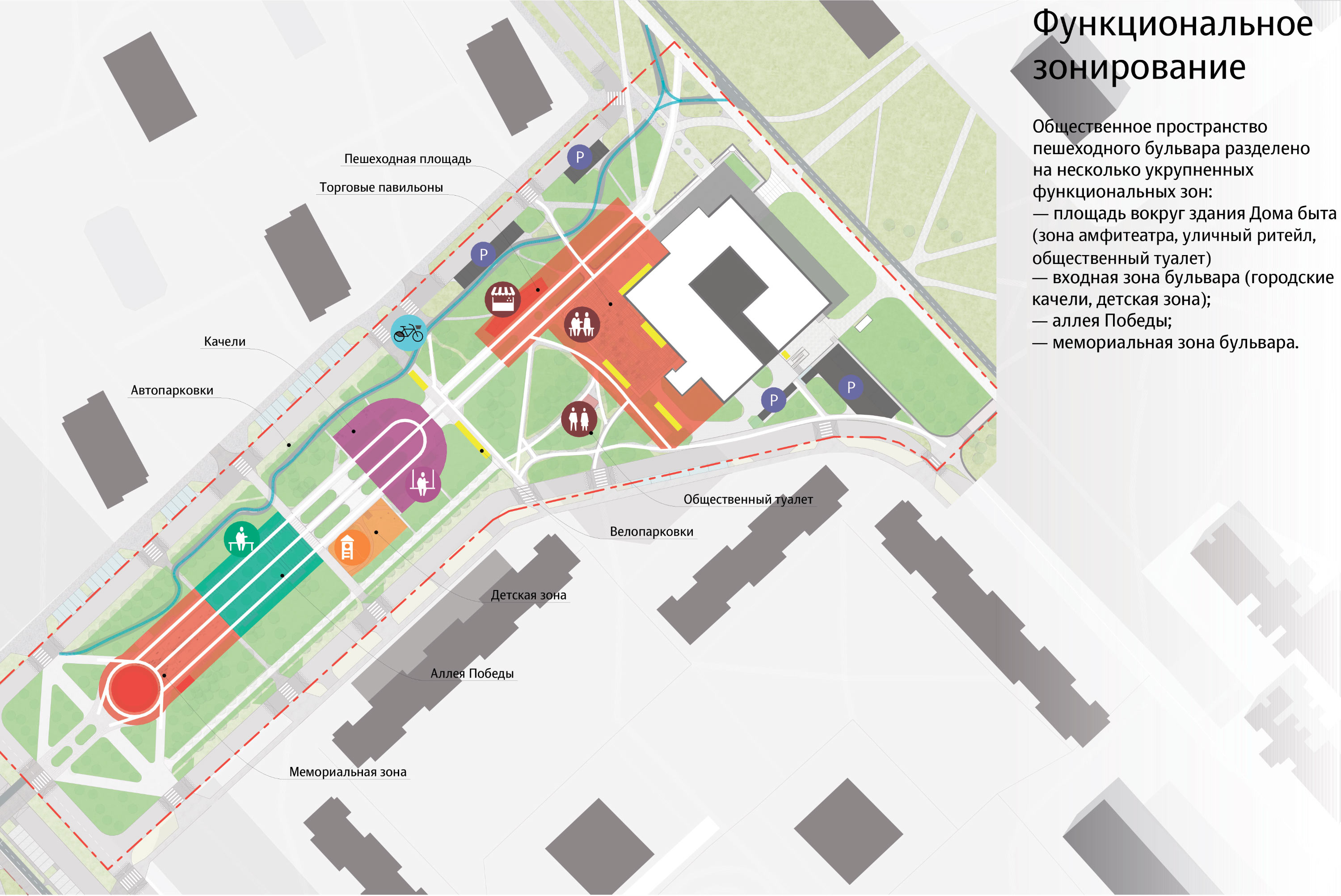 A central pedestrian axis goes from the Shkolny Boulevard to the Consumer Services Center. The walkways are paved with tiles and stones and are surrounded by pleasant vegetation.