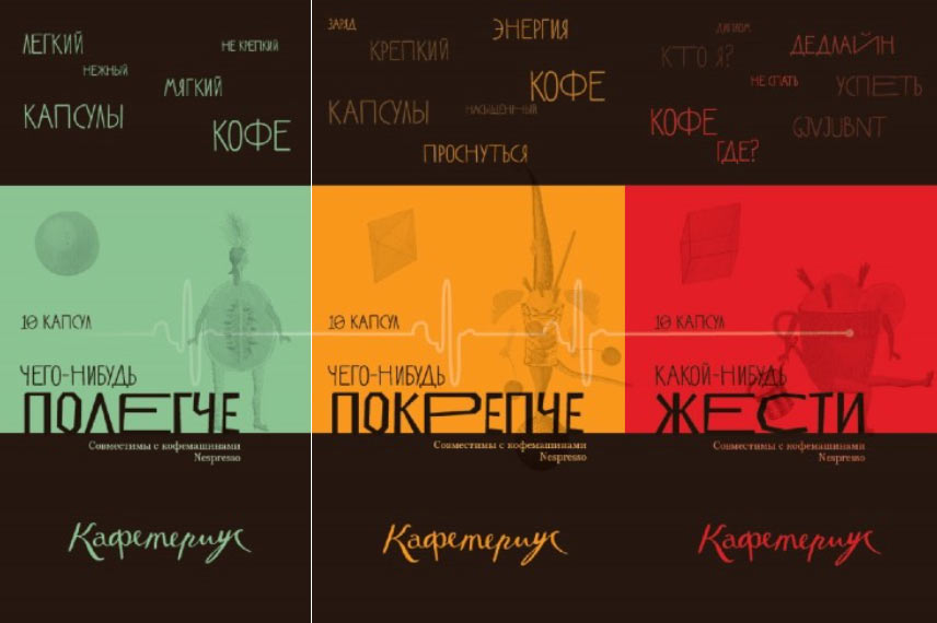 Art director: The third one can be called “Something tastier.” But overall the ideas are quite poor, more area is covered by Caféterius pictures. “Deadline approaching” is a nice slogan, I would put it in a circle of some sort. We can potentially come up with similar ones for the rest of the coffees.