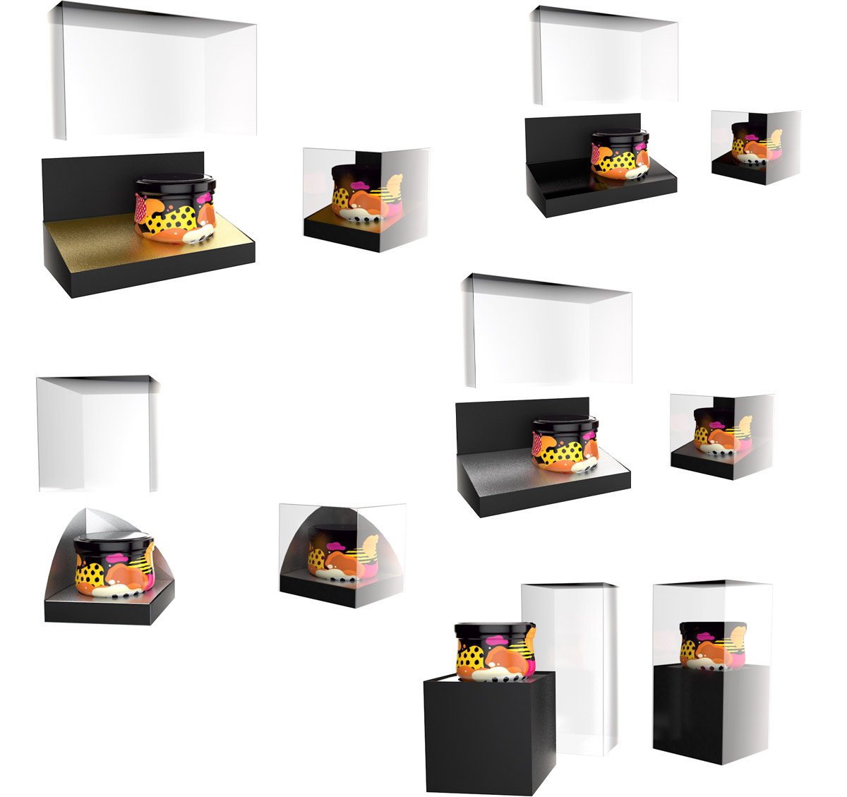 Also creating designs where the jar is supported by transparent inserts that make it look like it’s floating in the air. Trying to incorporate graphic illusions à la Cinematografica.
