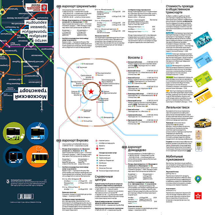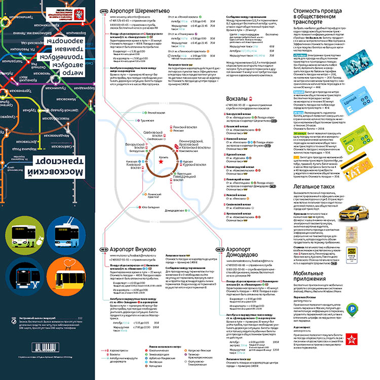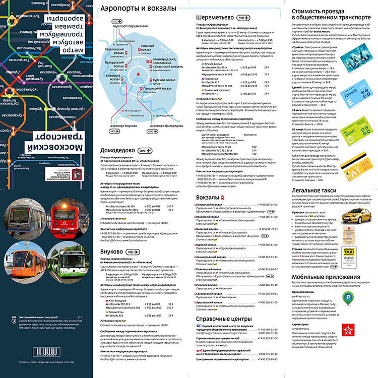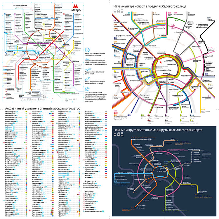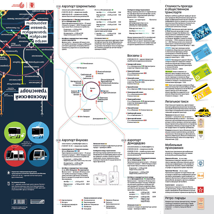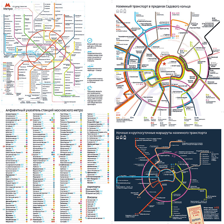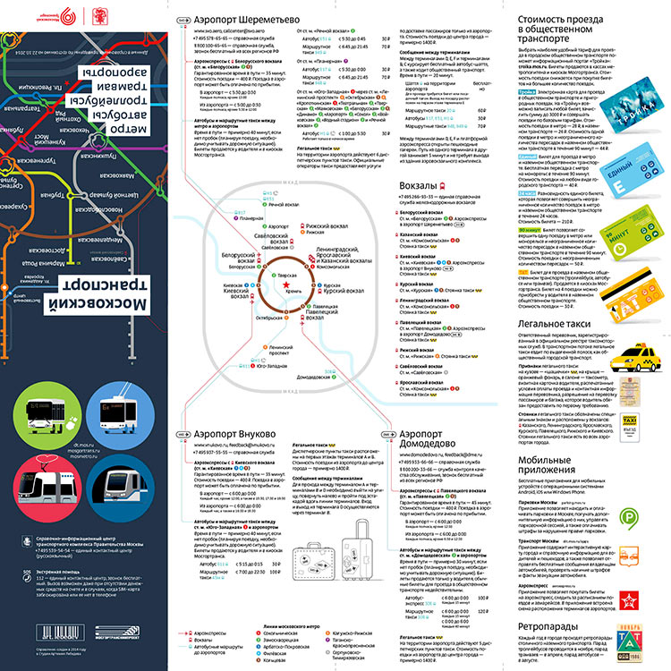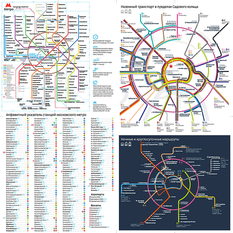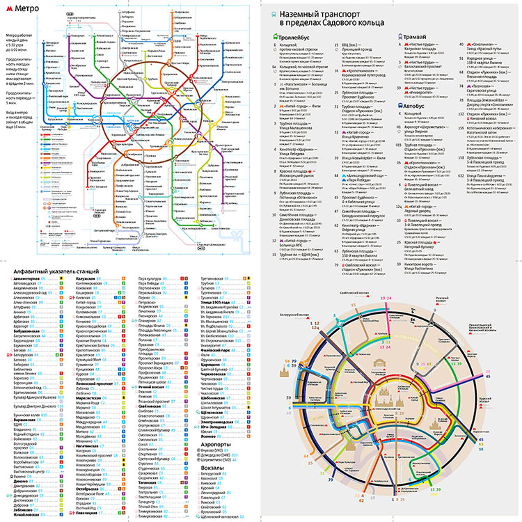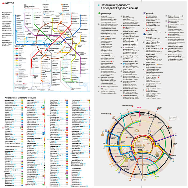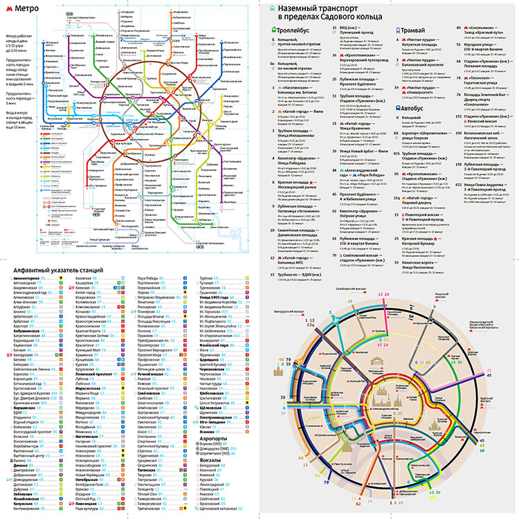 Collecting the information about airports, rail terminals, taxis, night and active day routes of ground transport within Sadovoye Koltso (the Garden Ring). The designer draws the “night” and “garden” ground transportation maps. Typesetting the Metro map with a list of stations, adding advice to install mobile apps that would be helpful to a tourist. Preparing an insert on landmarks. Coming up with a cover in five minutes and taking the mock-up to the Department of Transportation for the first presentation.