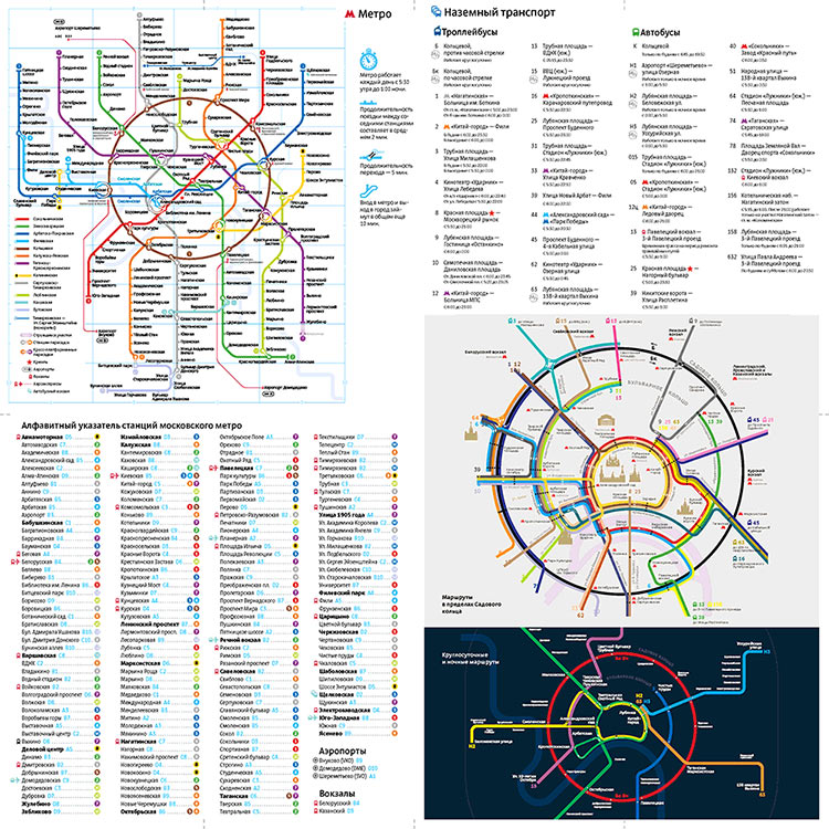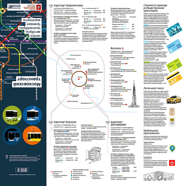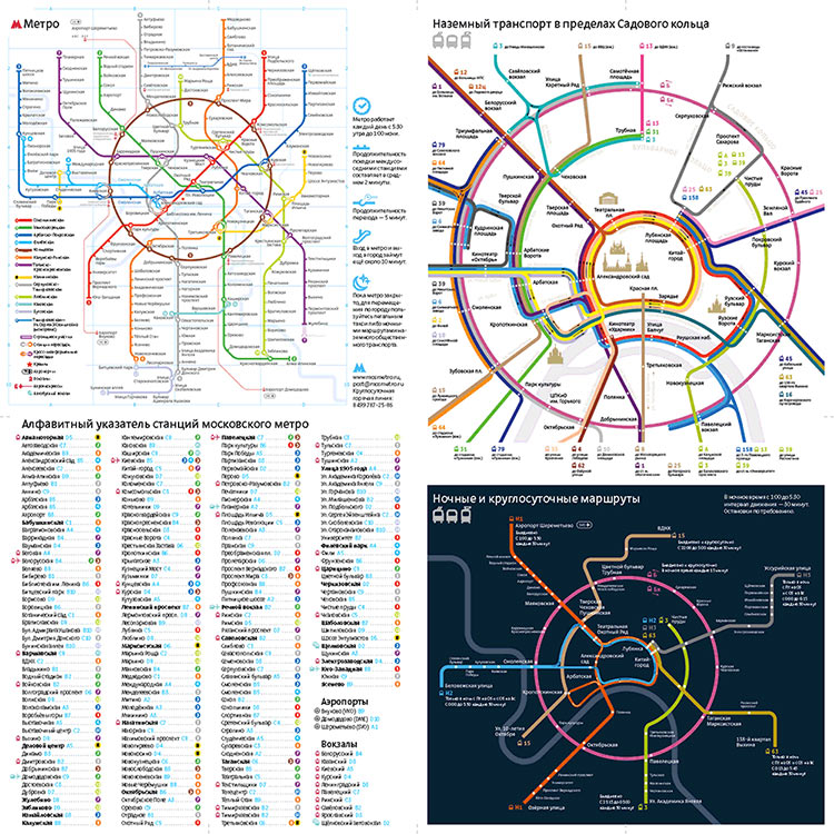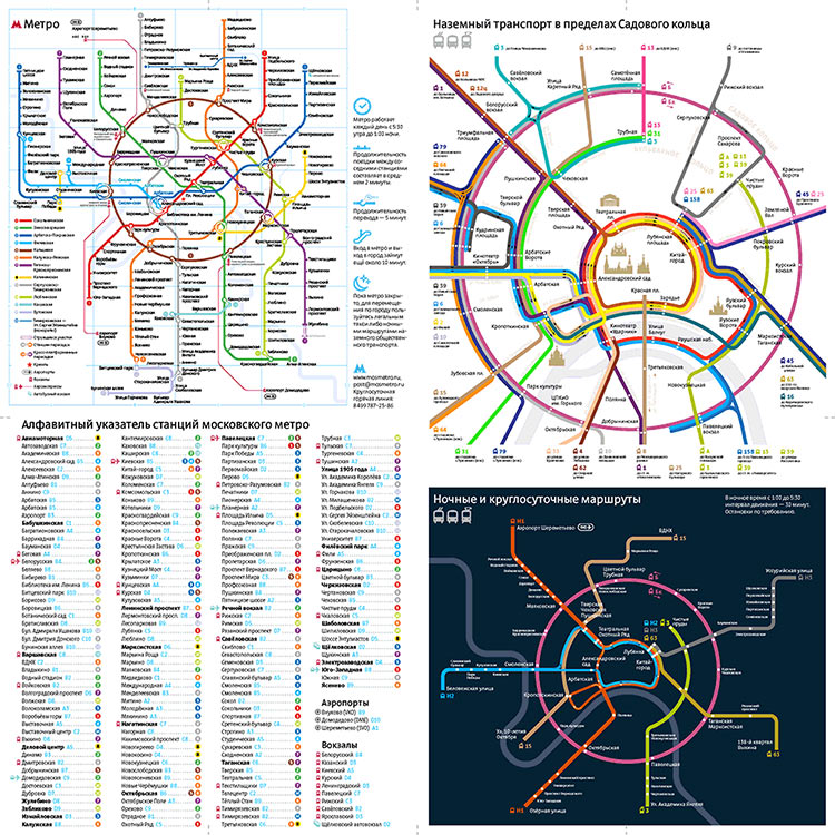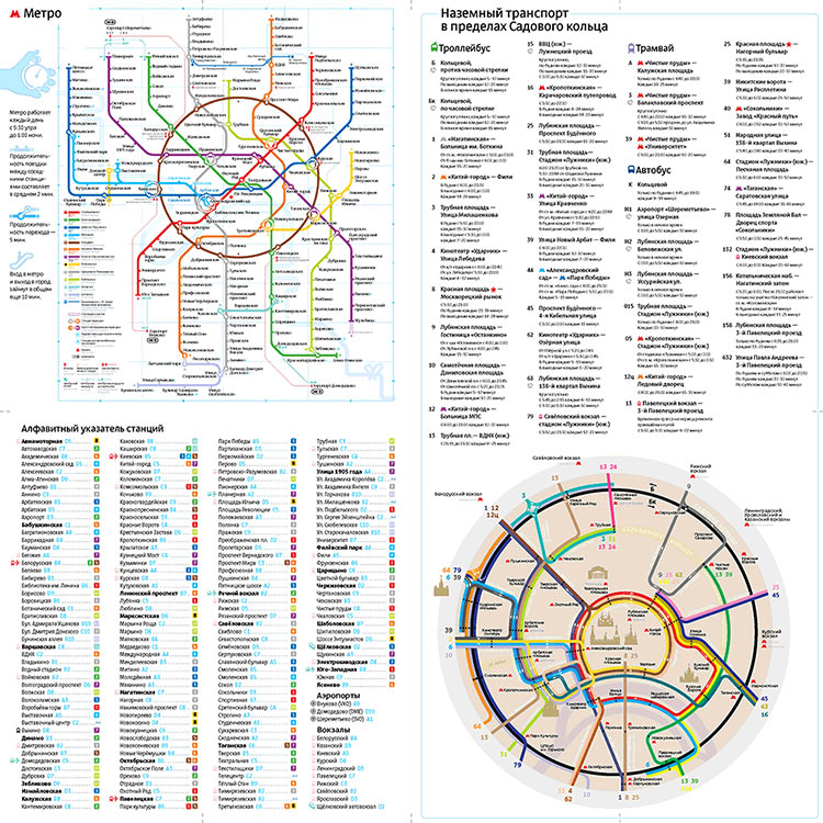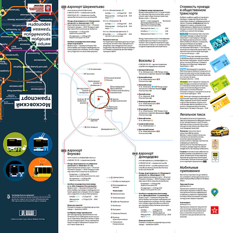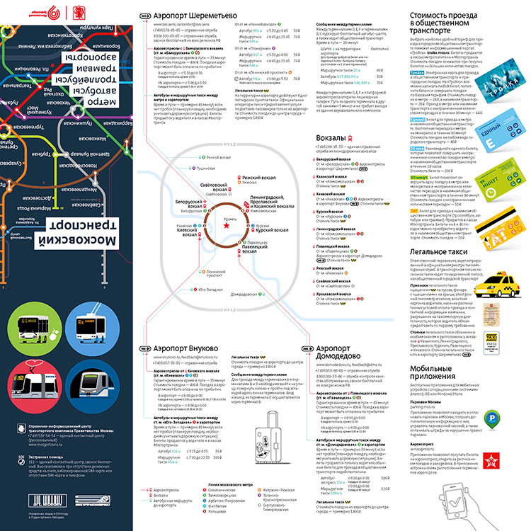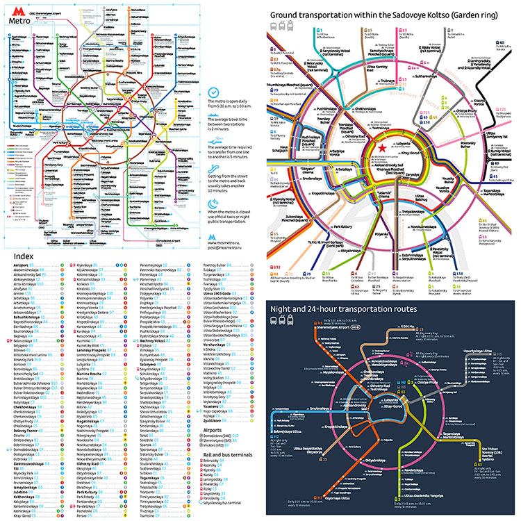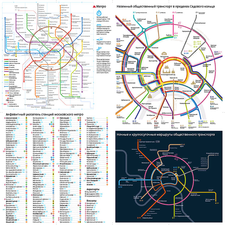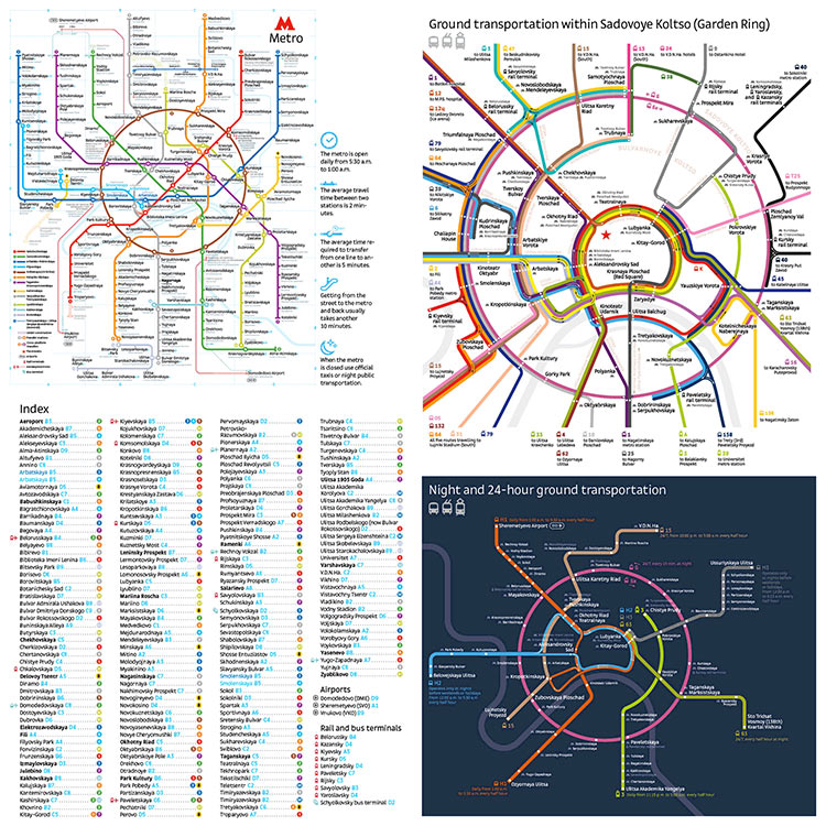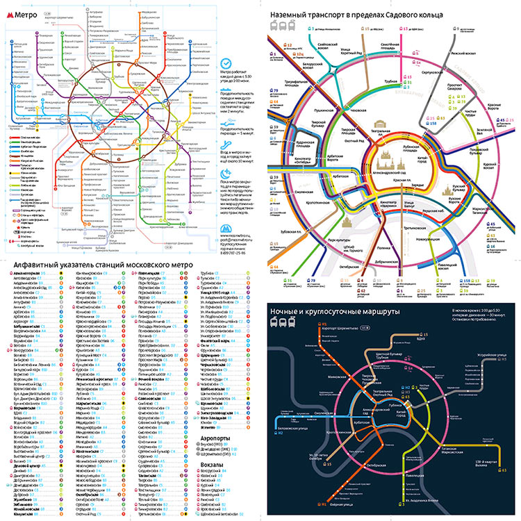 Collecting the information about airports, rail terminals, taxis, night and active day routes of ground transport within Sadovoye Koltso (the Garden Ring). The designer draws the “night” and “garden” ground transportation maps. Typesetting the Metro map with a list of stations, adding advice to install mobile apps that would be helpful to a tourist. Preparing an insert on landmarks. Coming up with a cover in five minutes and taking the mock-up to the Department of Transportation for the first presentation.
