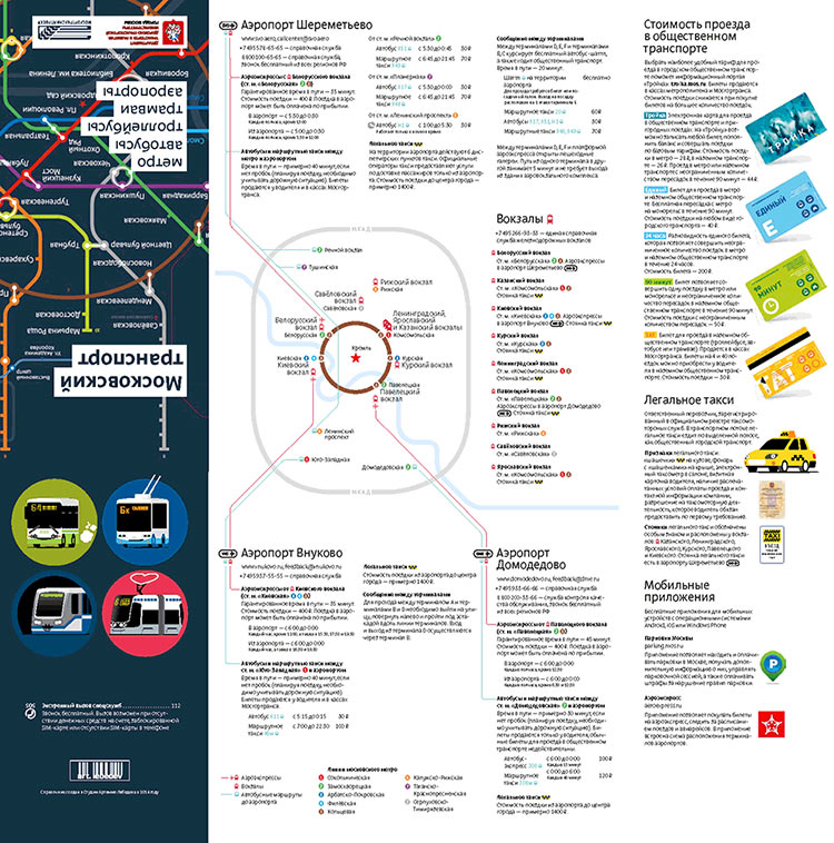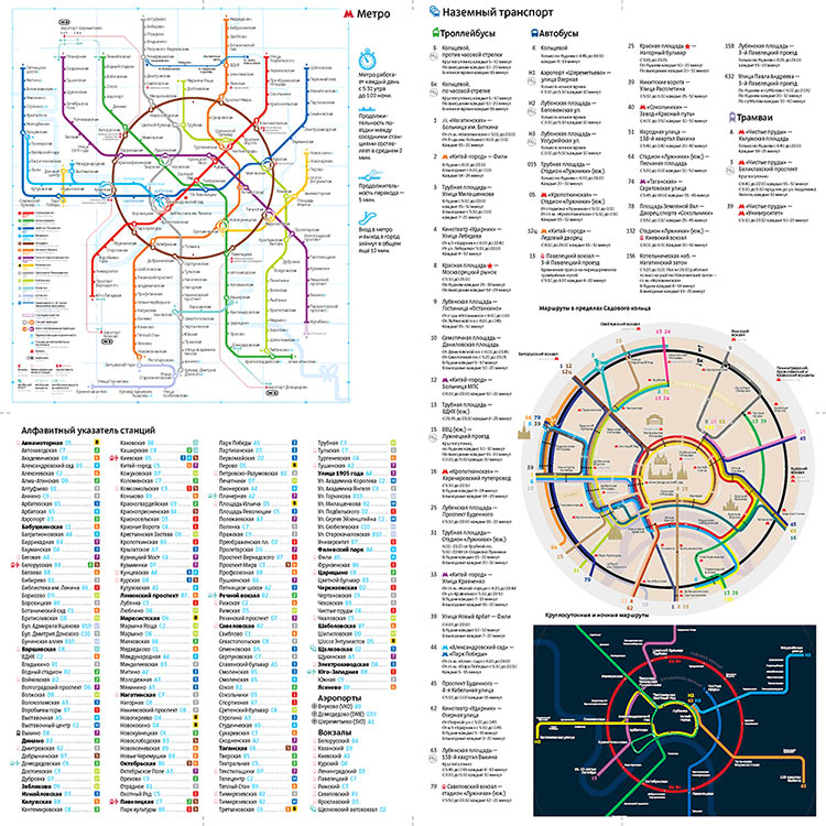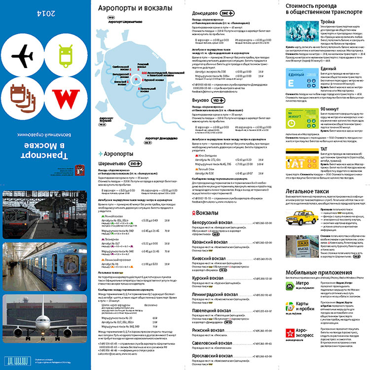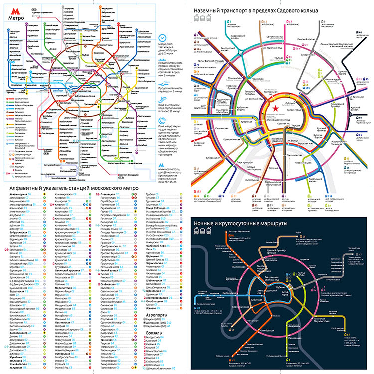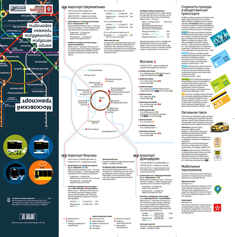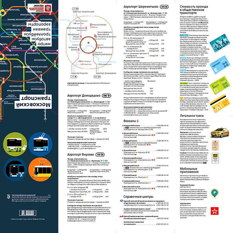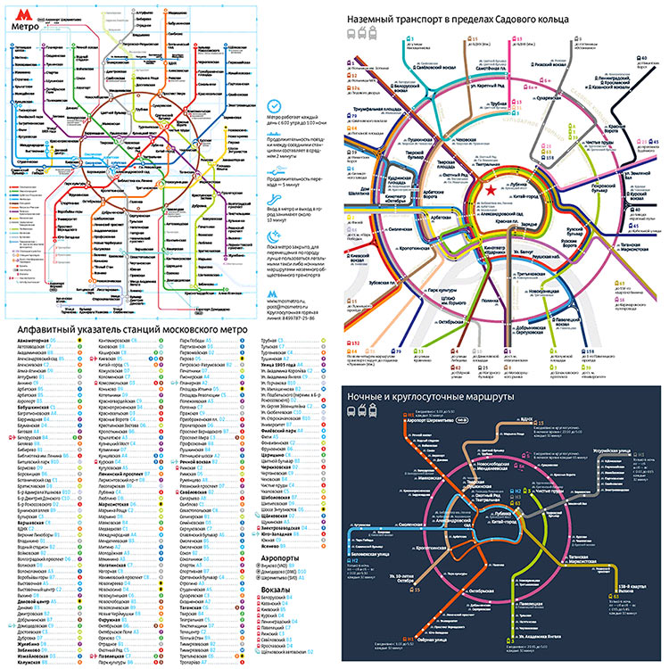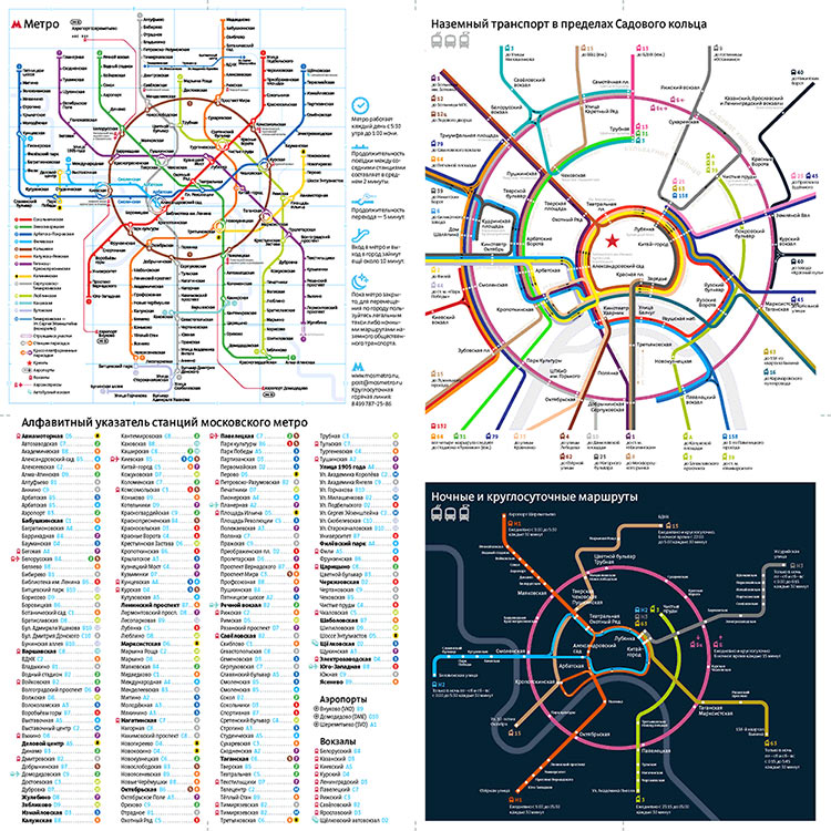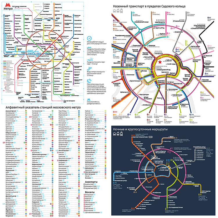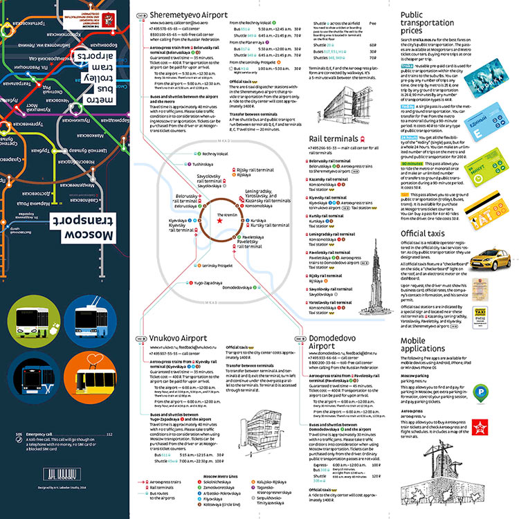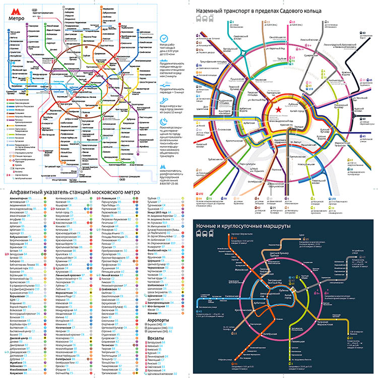 Collecting the information about airports, rail terminals, taxis, night and active day routes of ground transport within Sadovoye Koltso (the Garden Ring). The designer draws the “night” and “garden” ground transportation maps. Typesetting the Metro map with a list of stations, adding advice to install mobile apps that would be helpful to a tourist. Preparing an insert on landmarks. Coming up with a cover in five minutes and taking the mock-up to the Department of Transportation for the first presentation.