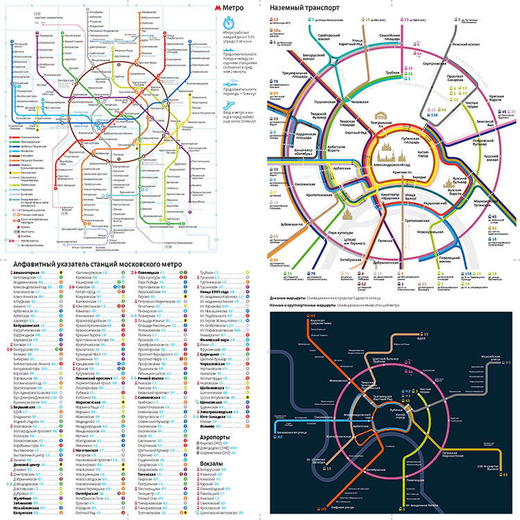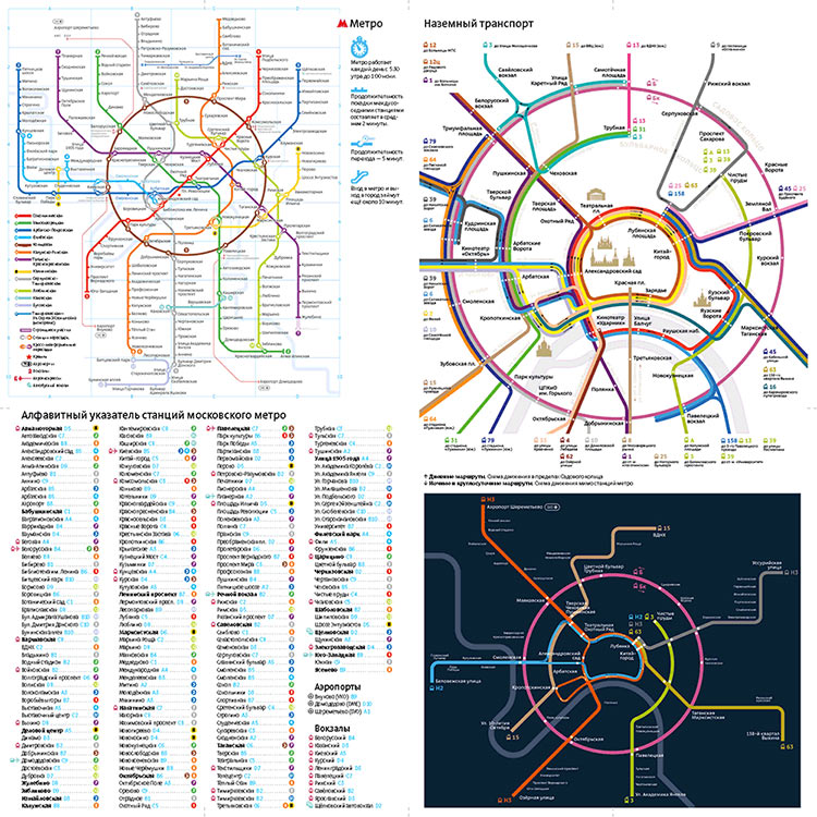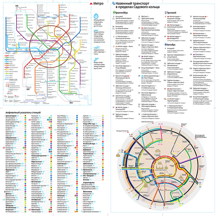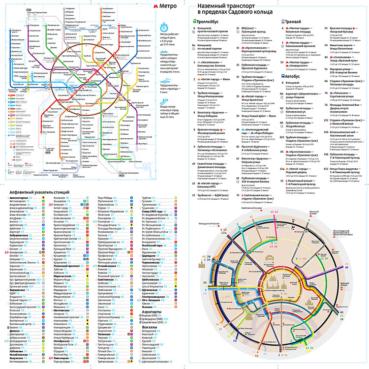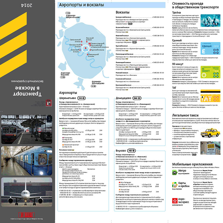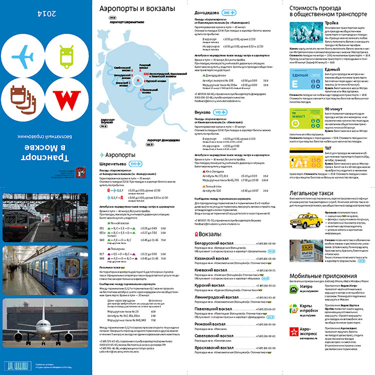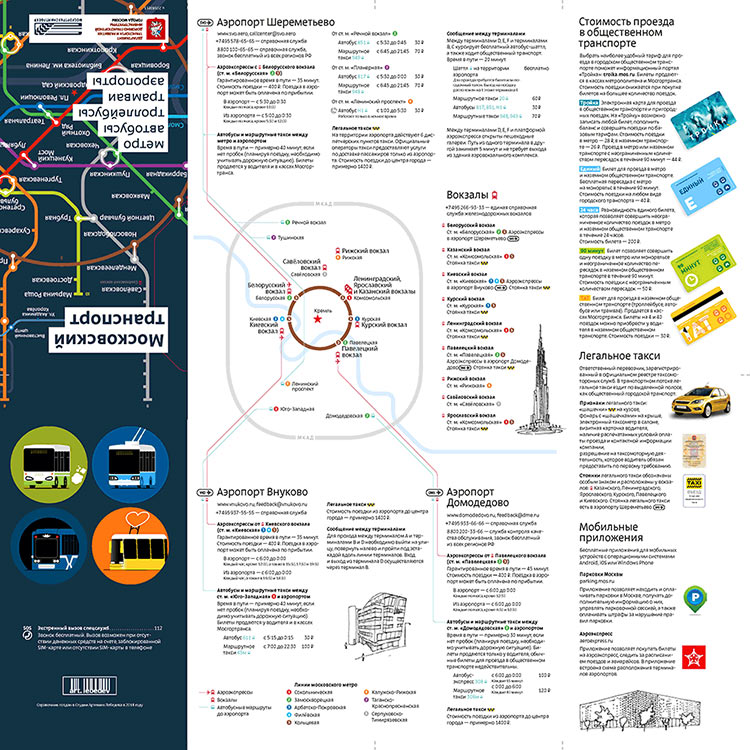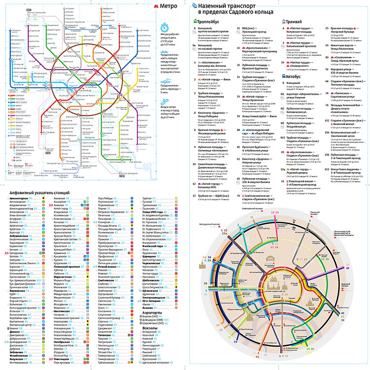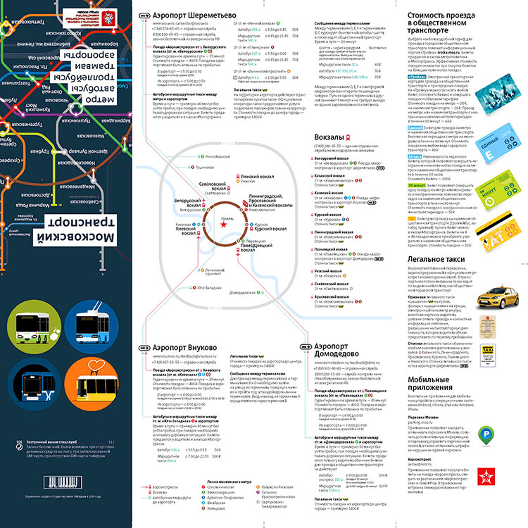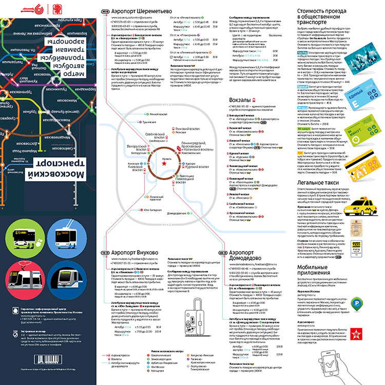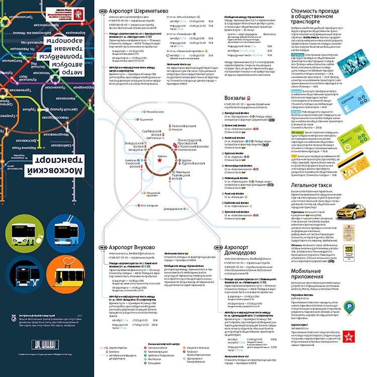 Collecting the information about airports, rail terminals, taxis, night and active day routes of ground transport within Sadovoye Koltso (the Garden Ring). The designer draws the “night” and “garden” ground transportation maps. Typesetting the Metro map with a list of stations, adding advice to install mobile apps that would be helpful to a tourist. Preparing an insert on landmarks. Coming up with a cover in five minutes and taking the mock-up to the Department of Transportation for the first presentation.