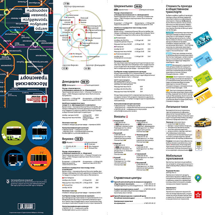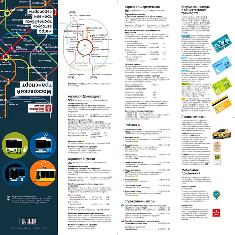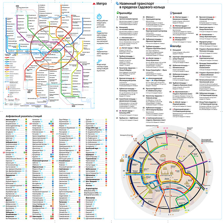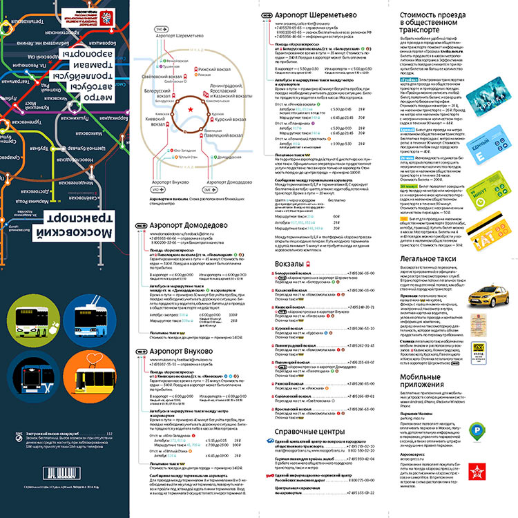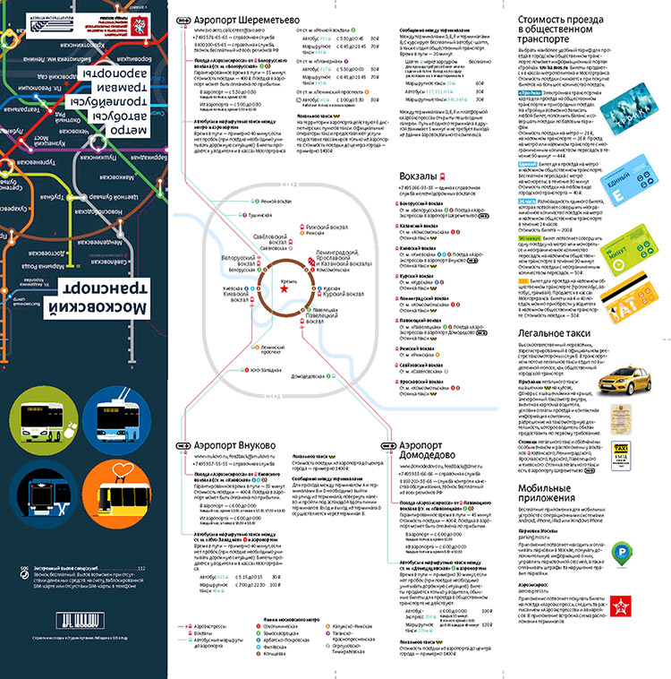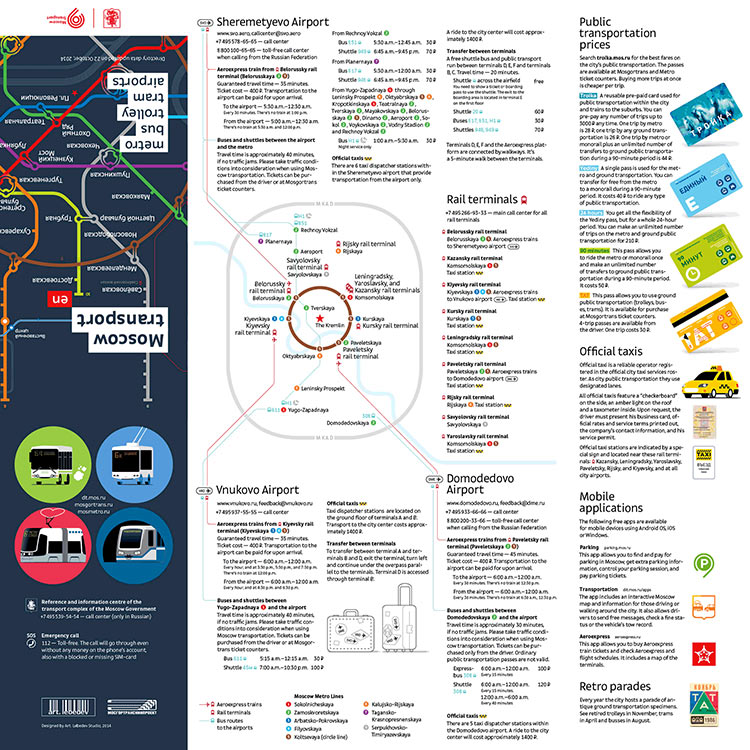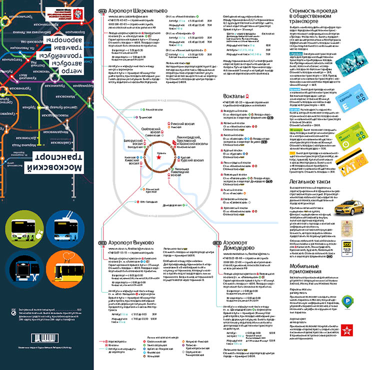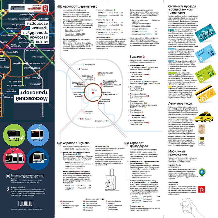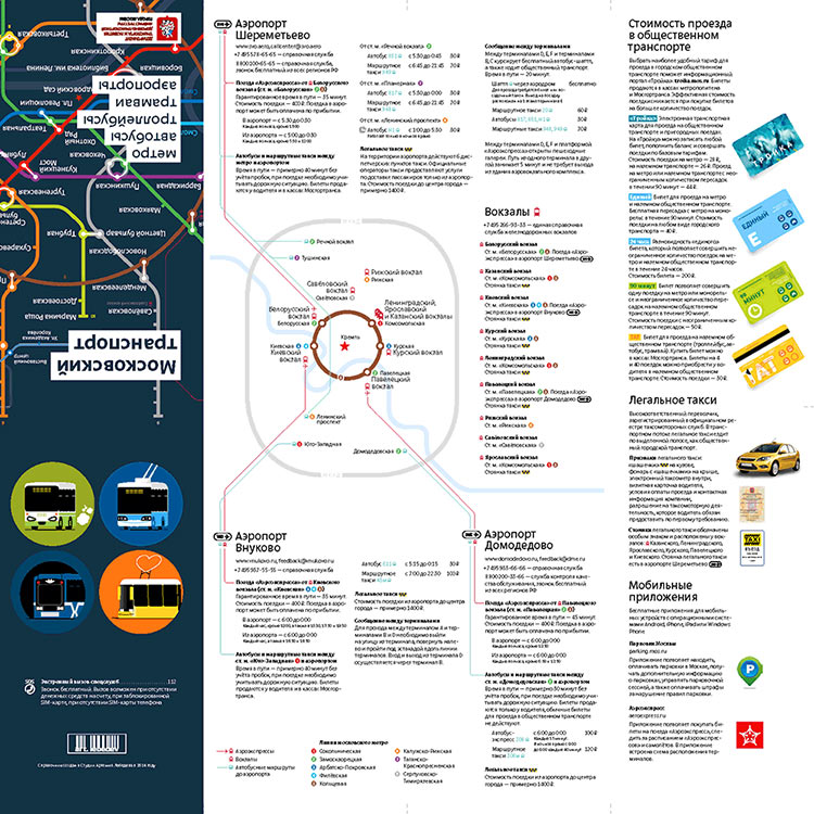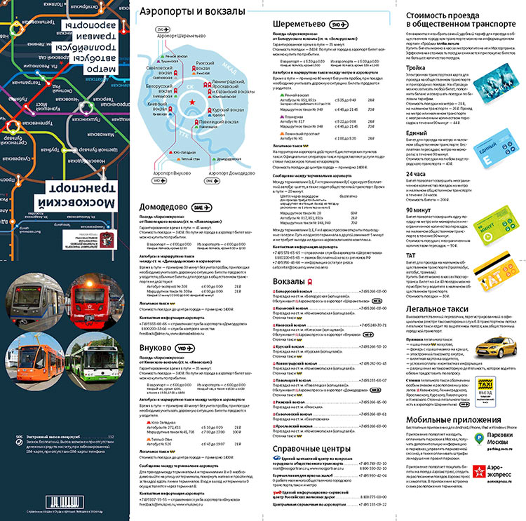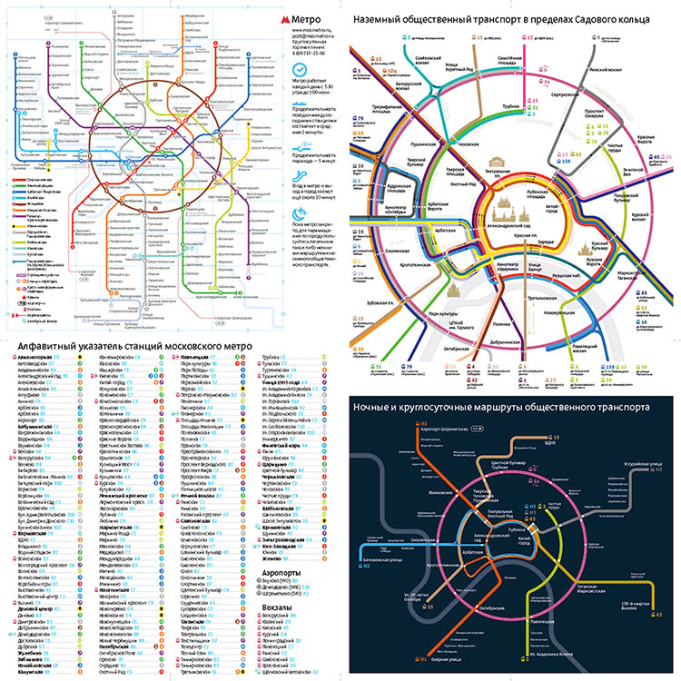 Collecting the information about airports, rail terminals, taxis, night and active day routes of ground transport within Sadovoye Koltso (the Garden Ring). The designer draws the “night” and “garden” ground transportation maps. Typesetting the Metro map with a list of stations, adding advice to install mobile apps that would be helpful to a tourist. Preparing an insert on landmarks. Coming up with a cover in five minutes and taking the mock-up to the Department of Transportation for the first presentation.