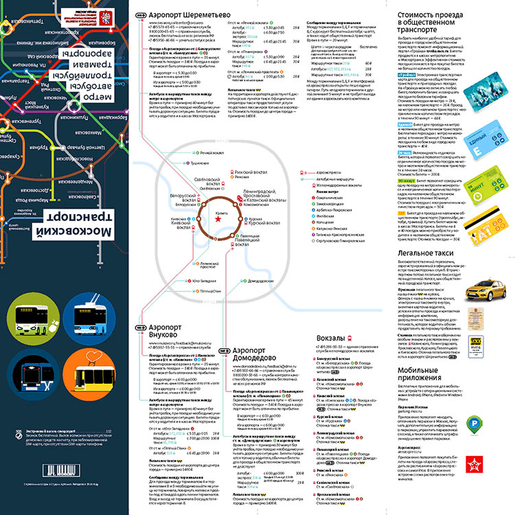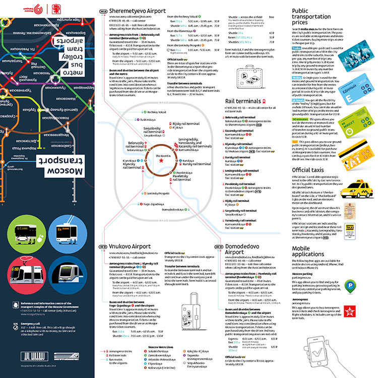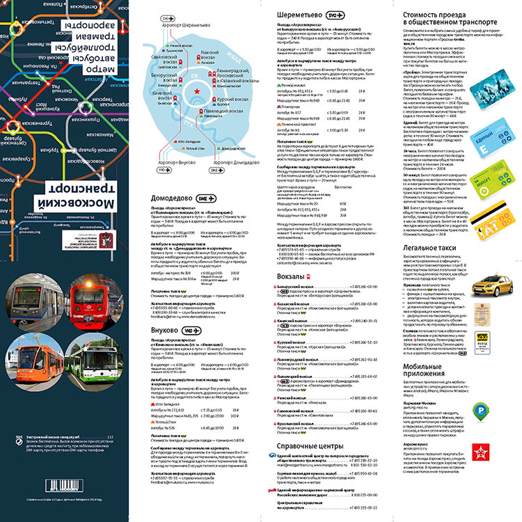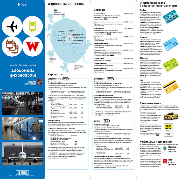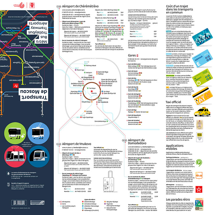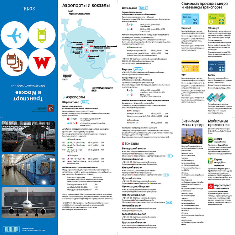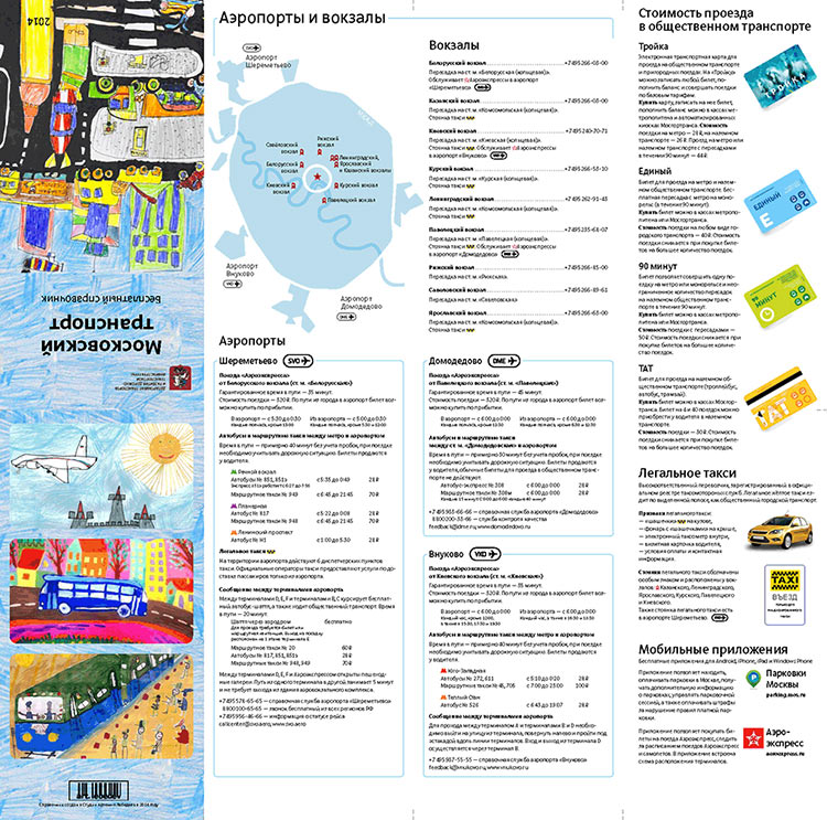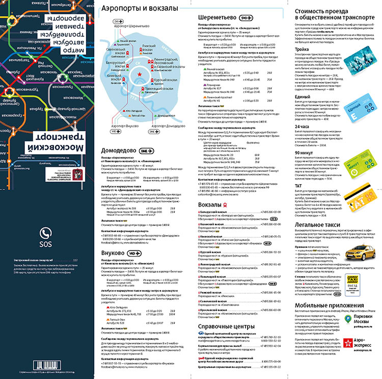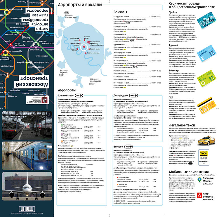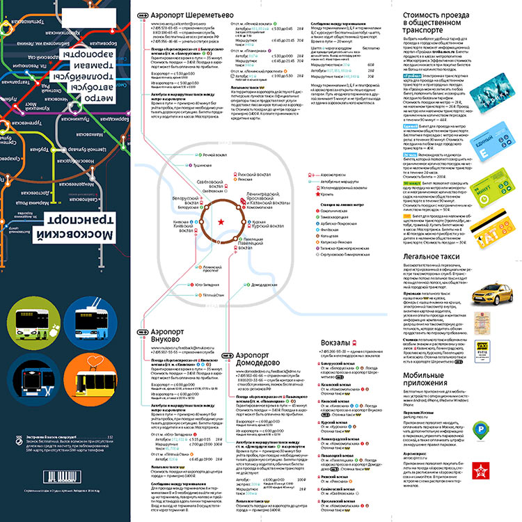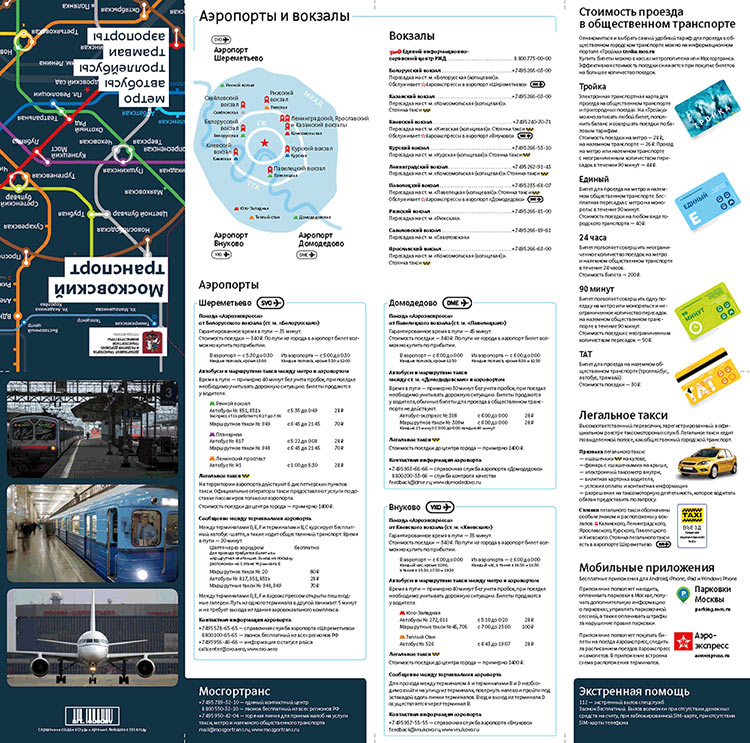 Collecting the information about airports, rail terminals, taxis, night and active day routes of ground transport within Sadovoye Koltso (the Garden Ring). The designer draws the “night” and “garden” ground transportation maps. Typesetting the Metro map with a list of stations, adding advice to install mobile apps that would be helpful to a tourist. Preparing an insert on landmarks. Coming up with a cover in five minutes and taking the mock-up to the Department of Transportation for the first presentation.