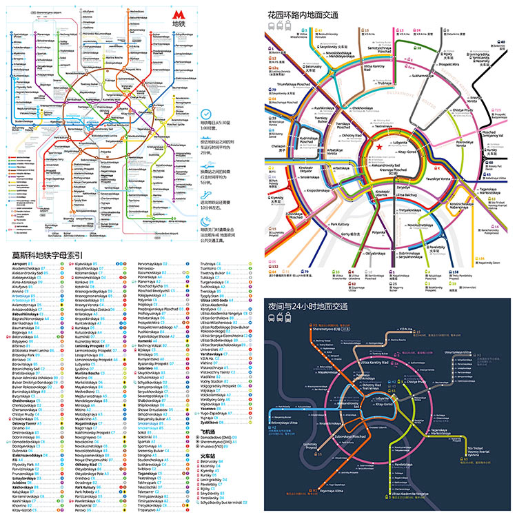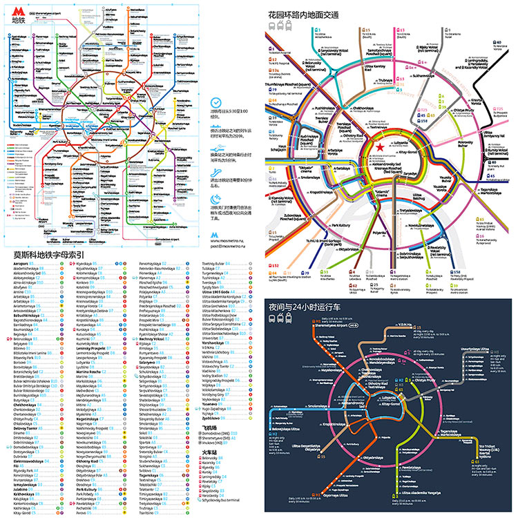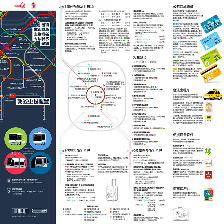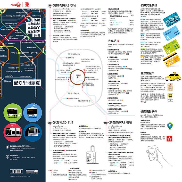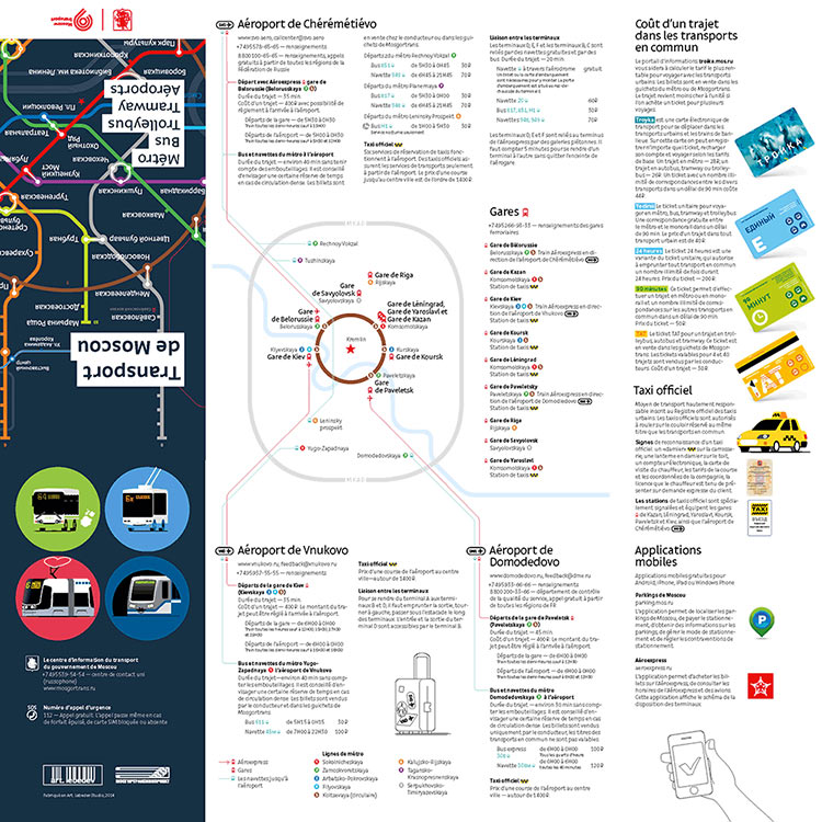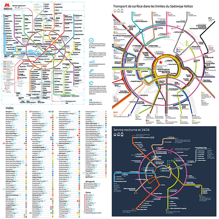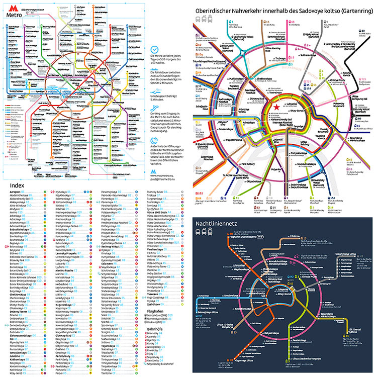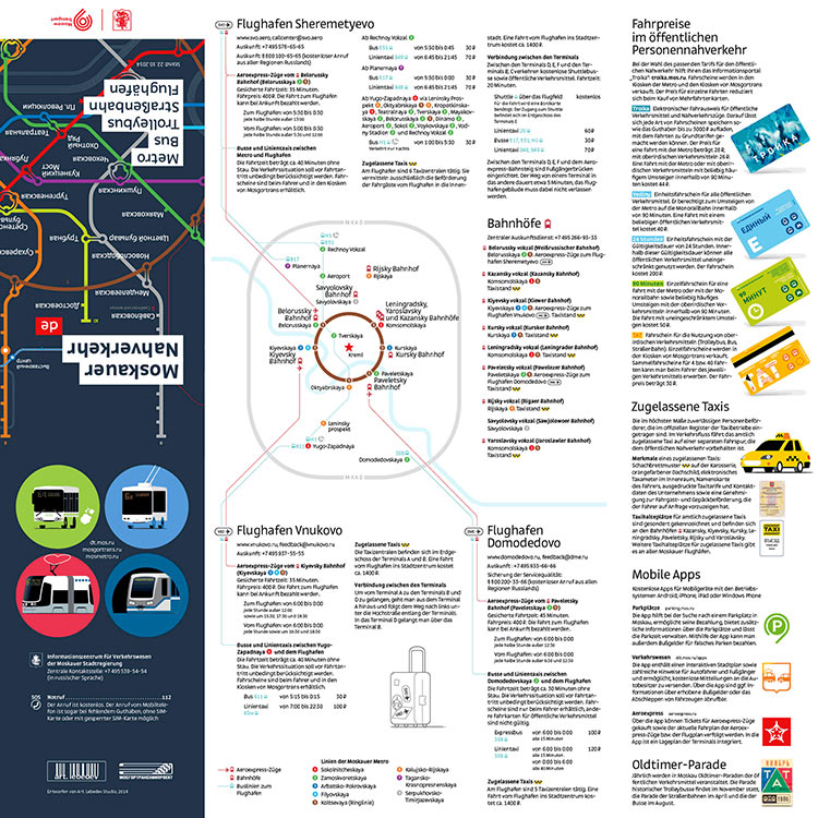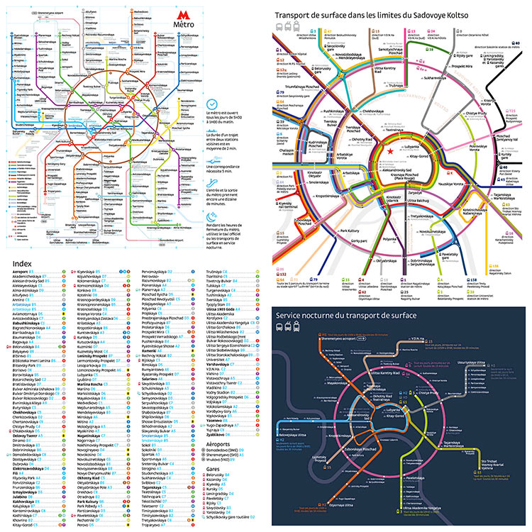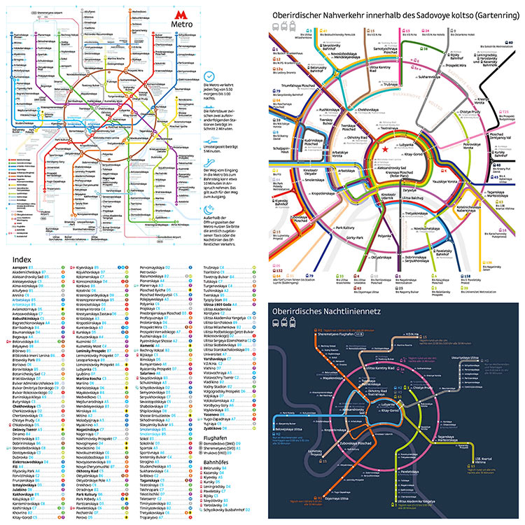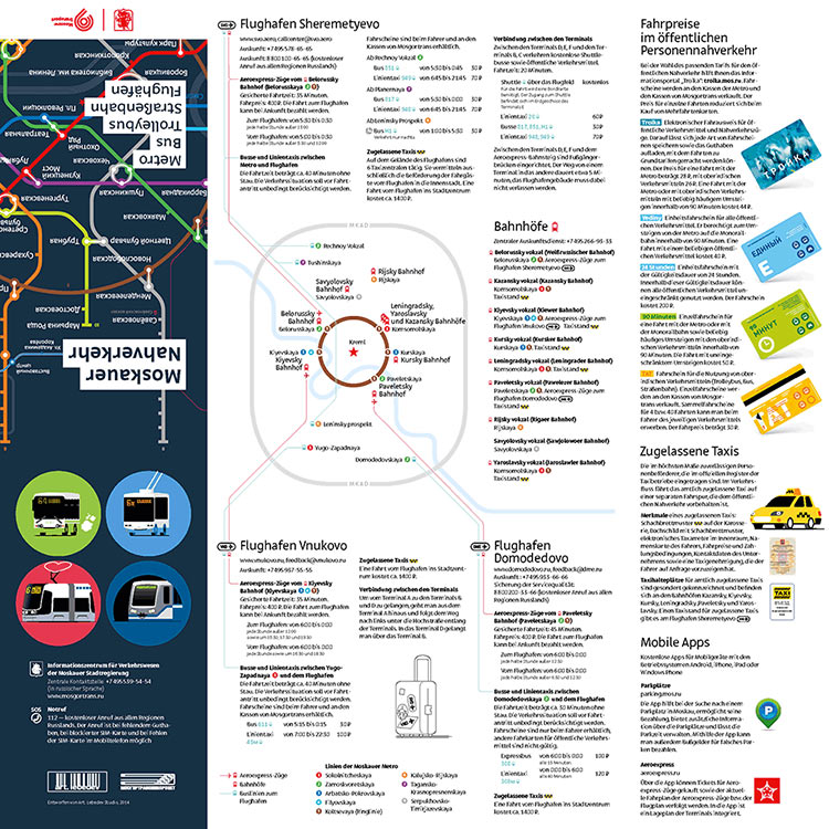 Collecting the information about airports, rail terminals, taxis, night and active day routes of ground transport within Sadovoye Koltso (the Garden Ring). The designer draws the “night” and “garden” ground transportation maps. Typesetting the Metro map with a list of stations, adding advice to install mobile apps that would be helpful to a tourist. Preparing an insert on landmarks. Coming up with a cover in five minutes and taking the mock-up to the Department of Transportation for the first presentation.