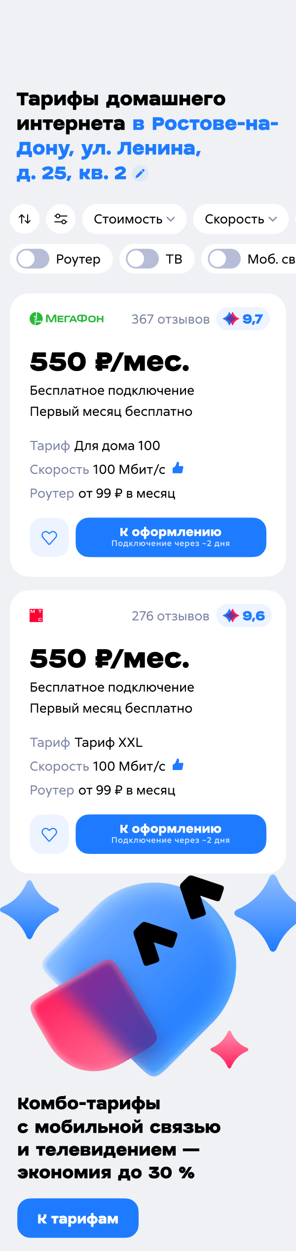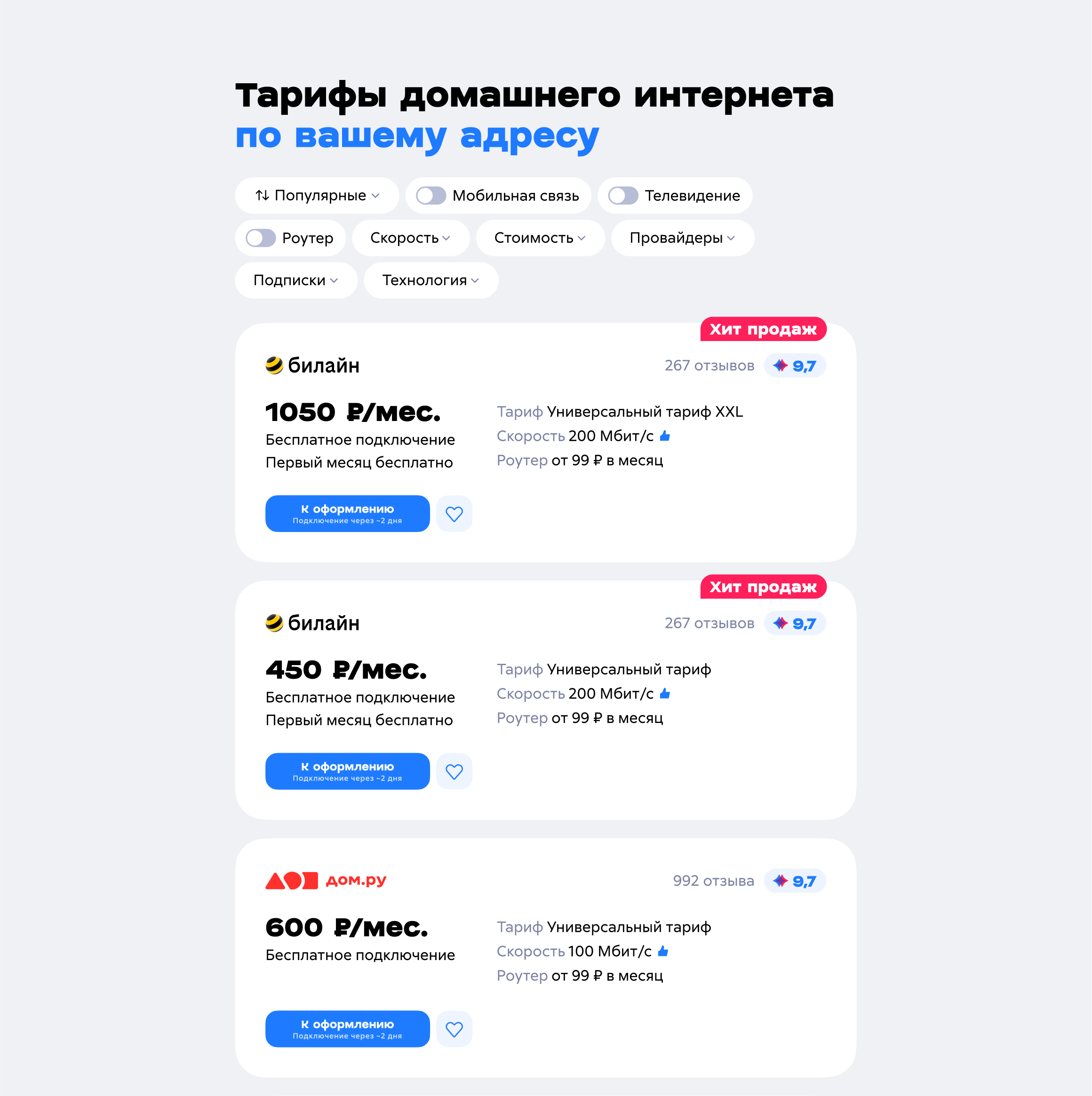 We designed the website with a simple and clean aesthetic: no fluff and no unnecessary marketing. The service shows the best plans based on your conditions, so all you have to do is pick the one you like and enjoy stable internet.