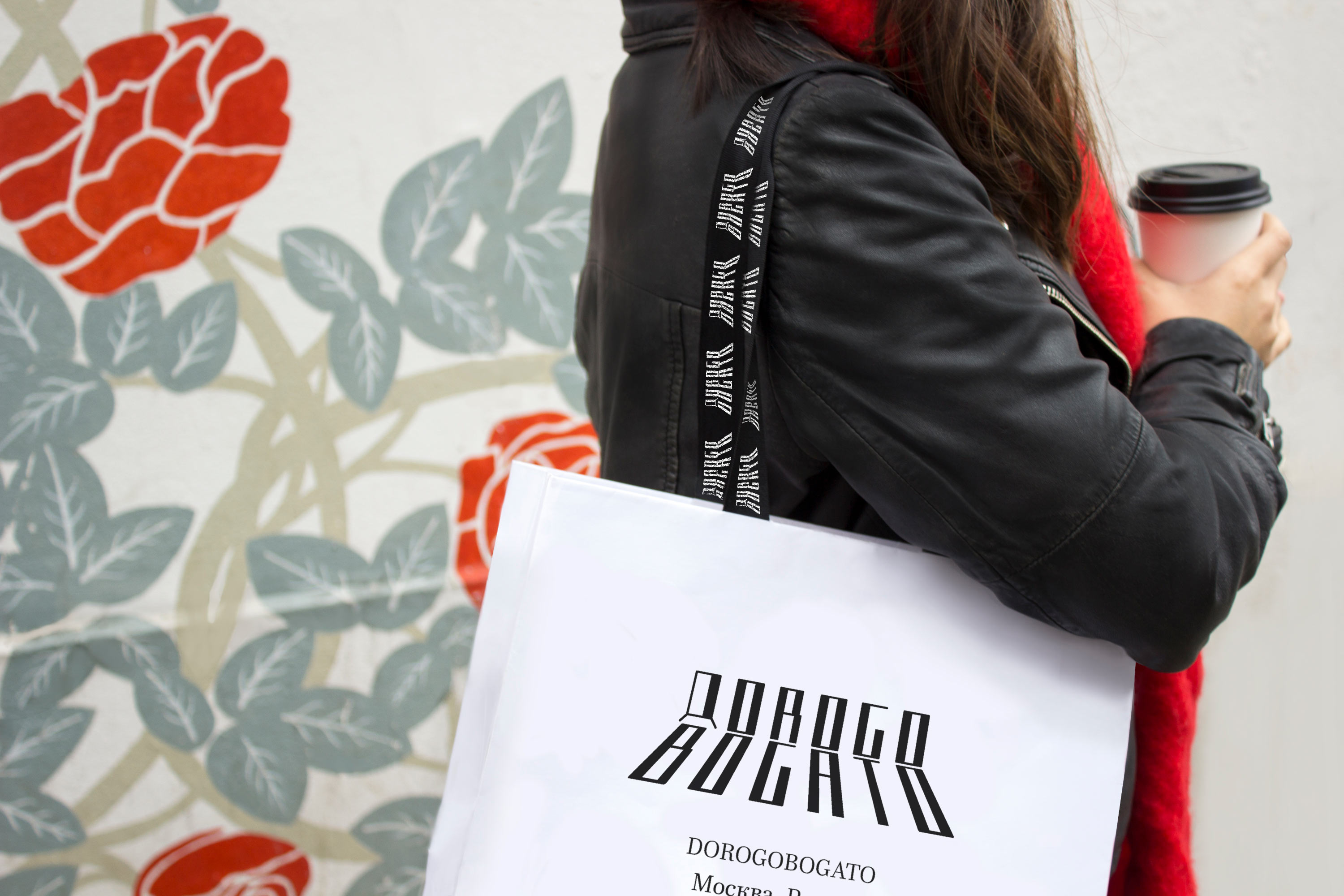 The word Dorogo is written in style traditional for fashion brands, in tall, graphic and airy letters.
