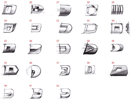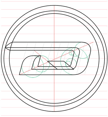 While working on the volumetric solution of the text and the circle around D you need to draw inspiration from the automotive logos, not our illustration. The only reason we provided it was to demonstrate the existing capacity to make elements more interesting.