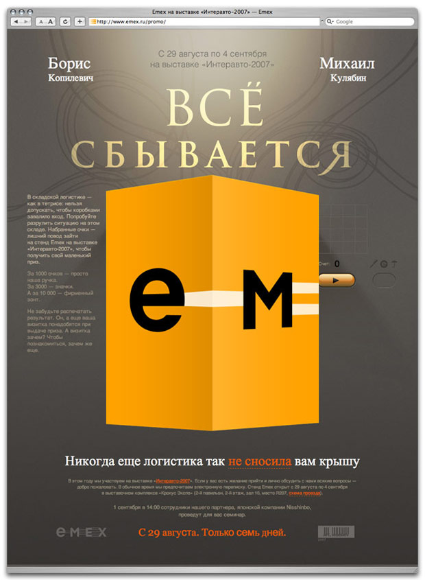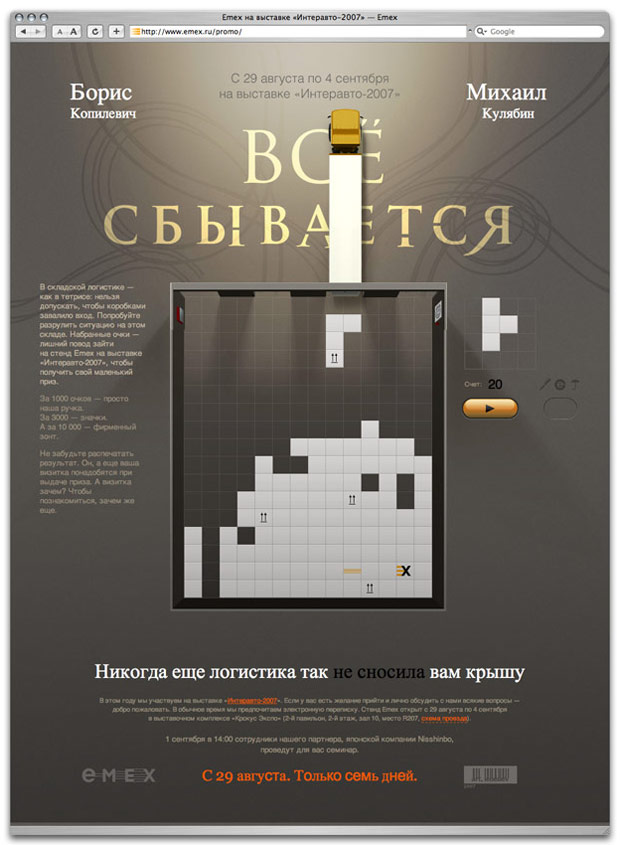 EMEXs stand is open at the Interauto-2007 exhibition from Aug 29 to Sept 4. Suppliers of automobile spare parts are invited to meet the company's top managers who are in other times available only by e-mail. Take you time visiting the page and find a game of Depot Tetris worthwhile as your efforts will be rewarded with real prizes at the EMEX exhibition stand.