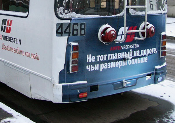Ads on trolleys remind drivers that the vehicles lofty price and huge size are no excuse for rudeness on the roadway.
