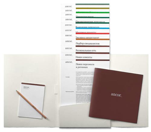 The design of Ancor advertising materials is based on light graphic elementsupper margins of different colors, and a well thought-out layout. The set includes a series of flyers describing all Ancor activities, a catalog, an advertising folder, a pencil and a notepad. ![]() Closed folder. The word Ancor on the pencil seems to be written on the back of the folder
