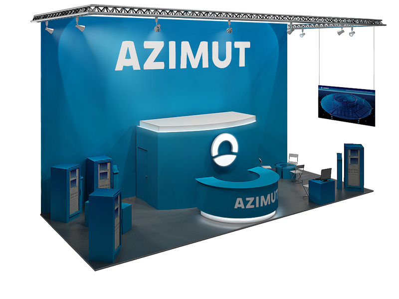 Azimut Production Association specializes in the development of a broad range of radio-electronic air traffic control equipment, navigation and landing systems for Russian civil aviation and Air Force. The stand design has been especially developed for the international space and aviation exhibition MAKS2005. The backdrop of the exhibition stand is a huge piece of fabric rippling in the air blown by two fans installed on the floor. Looks like a real sky. The reception desk and the conference room behind it were made in the form of the company logo that was earlier created by the studio. |