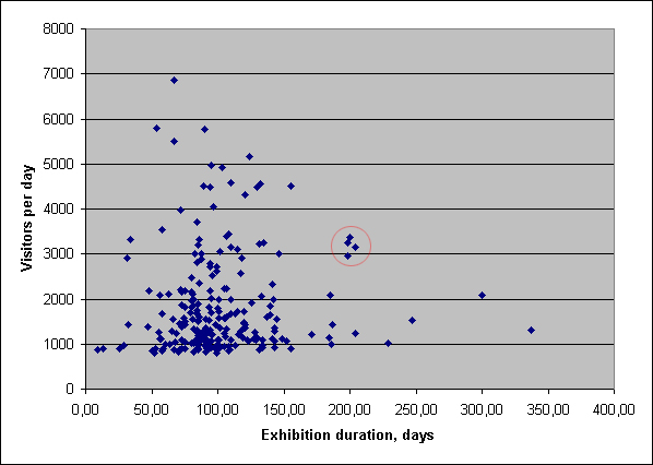![]() Voronezhsky-Gorbunov hypothesis: Short exhibitions attract more visitors a day. Constant exhibitions are less popular. |