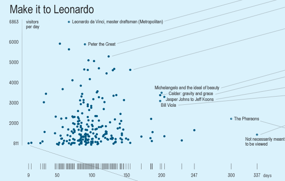In February 2004 Roman Voronezhsky and Artem Gorbunov, designers of our studio, in cooperation with Mir magazine staff worked on a double page spread containing world statistics on attendance of art exhibitions in 2003. Initial visitor figures for 233 exhibitions were provided by 96 museums located in 61 cities around the world, and published in The Art Newspaper. This information was arranged in a table: ![]() There also were exhibition top tens for the following genres: Old Masters, Contemporary, Decorative Arts, Modern and Antiquities. The author accepts full responsibility for all assumptions and conclusions he built upon these data. HypothesisAmusing statistics is the kind of information you would like to learn, analyze, and compare. Unfortunately, most designers who deal with statistics do not bother to draw the meaning from the figures they have to present. Instead, they get busy trying to make them look pretty. In fact, the information is intrinsically attractive. The designer should determine what in particular may present interest among the data he has, and then each milligram of printing ink and each solid pixel should be devoted to this purpose. (Ed. note: See Edward Tuftes works.) So, our work on the double spread sheet began with data analysis. We transferred the initial table into Microsoft Excel format and applied some transformations to it. This software allows playing with data, grouping them, constructing aggregates, and visualizing relationships. By the way, at this stage you can judge the quality of the initial data. For example, we were surprised to see that figures provided by the Hermitage were rounded to 1,000 or even to 10,000. All the rest museums counted every single visitor. Exhibition popularity rate expressed by daily averages was calculated on this basis. In order to present this information in the best way, we needed some idea or hypothesis that could be somehow illustrated or tested. We could suggest, for instance, that there is correlation between exhibition duration and its popularity. Lets make a diagram based on the Excel table showing joint distribution of these two quantities. |