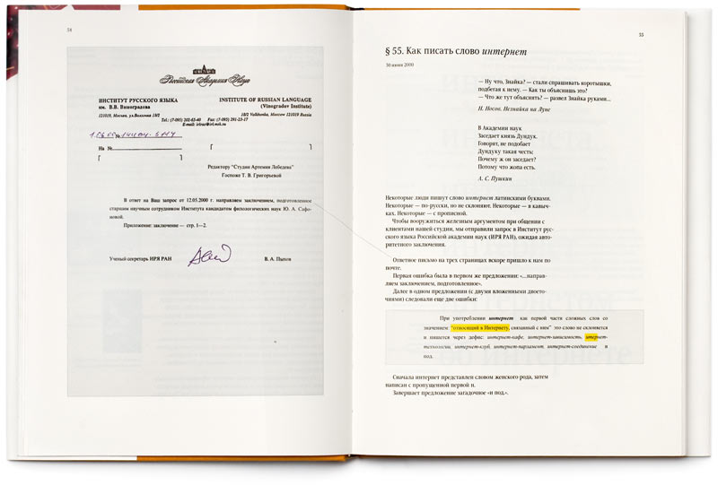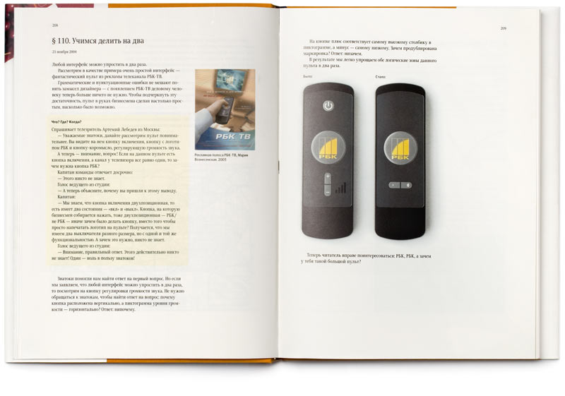 In 1997 Artemy Lebedev set about writing chapters for his future book about design. A year had passed, but there was not enough material to make a book. So he started to publish the chapters on the studios website. In the elapsed 10 years the number of sections has grown so much that publishing them in a book seemed just natural.