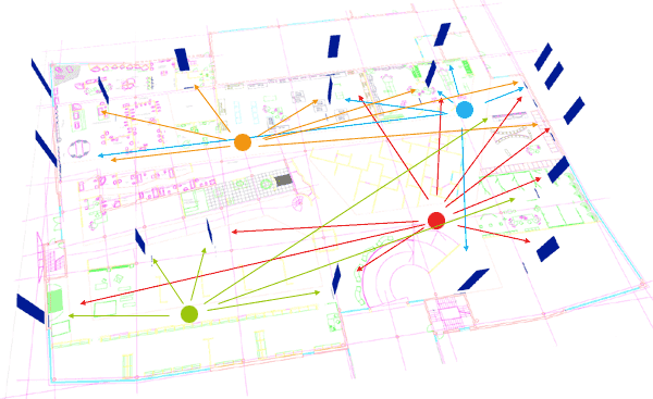 Plan of positioning vertical lettering in the Decorum hall. The four colored points indicate the major positions where the visitor will search for visual cues. The arrows are aimed at the lettering. Between the orange and green circles there are premises blocking the field of view |