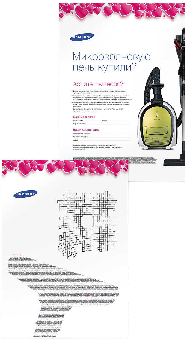 Every buyer of a microwave oven gets a gorgeous crossword. Those who solve the crossword have a chance to win a bigger prizea Samsung vacuum cleaner. Samsung has stashed away one hundred vacuum cleaners.