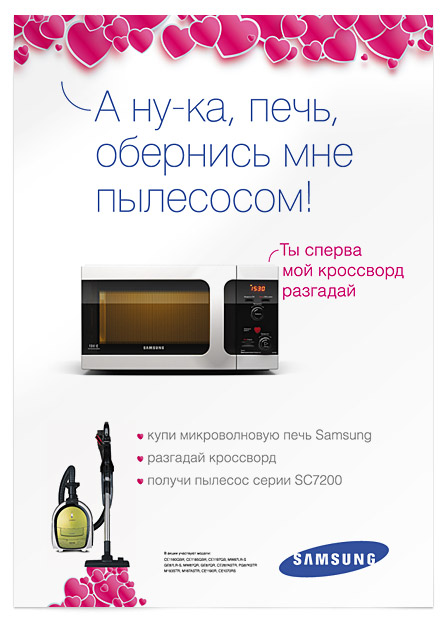 Every buyer of a microwave oven gets a gorgeous crossword. Those who solve the crossword have a chance to win a bigger prizea Samsung vacuum cleaner. Samsung has stashed away one hundred vacuum cleaners. ![]() Poster