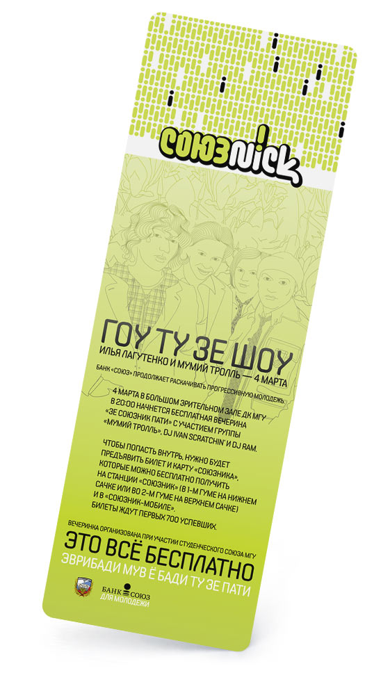 Problem: Lure people into going to The Soyuznick Party held on the occasion of opening the Soyuznick Bank office in the Moscow State University on March 4, 2006.