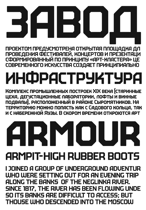 The wide strokes of the letterforms allow them to serve as picture frames or wear different textures. The perfect fit would be imitations of any coarse surfaces. You can freely play with this type by breaking, crumbing, scratching the letters, or turning them into stencils on concrete.»