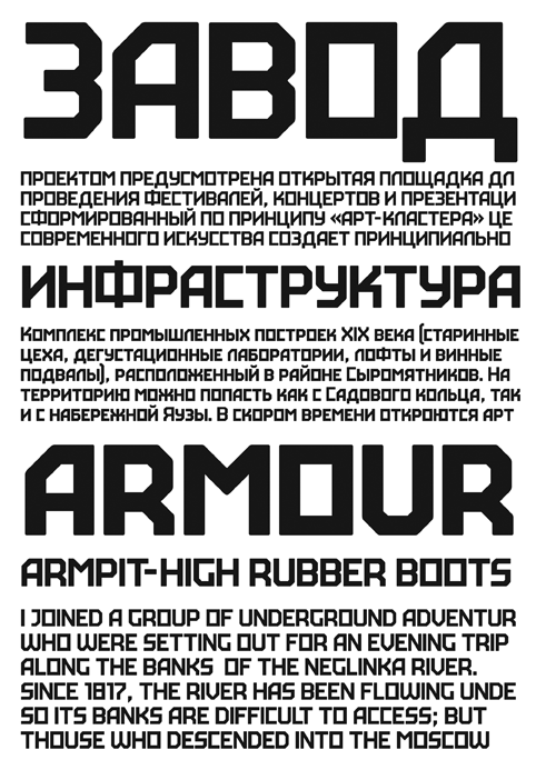 Kraft is a rough industrial sans serif meant for setting text in all caps. Instead of lowercase letters there are capitals of smaller height but with the same stroke width. They make tighter type.
