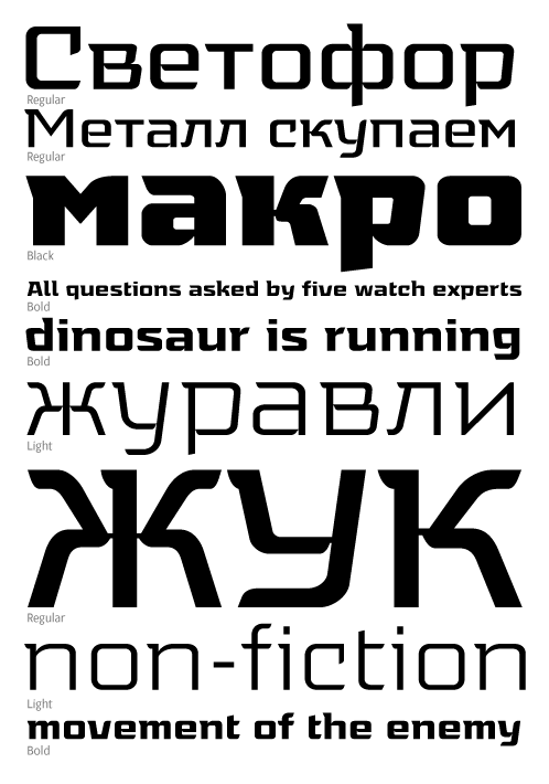 The typeface is a bit rough and square-built with a pronounced oriental touch (Chinese word tongyin means bronze molding). Tongyin declares its ties to Russian constructivism and comes in four weights: light, regular, bold and black.