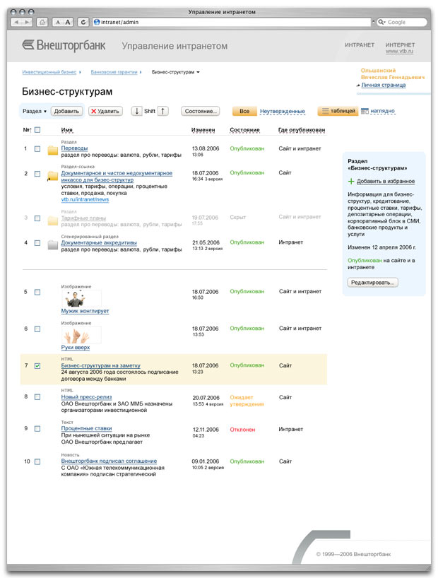 Thousands of people daily use Vneshtorgbank intranet, while the number of the banks website users reaches hundreds of thousands. Every day over hundred employees upload updates both to the former and to the latter.