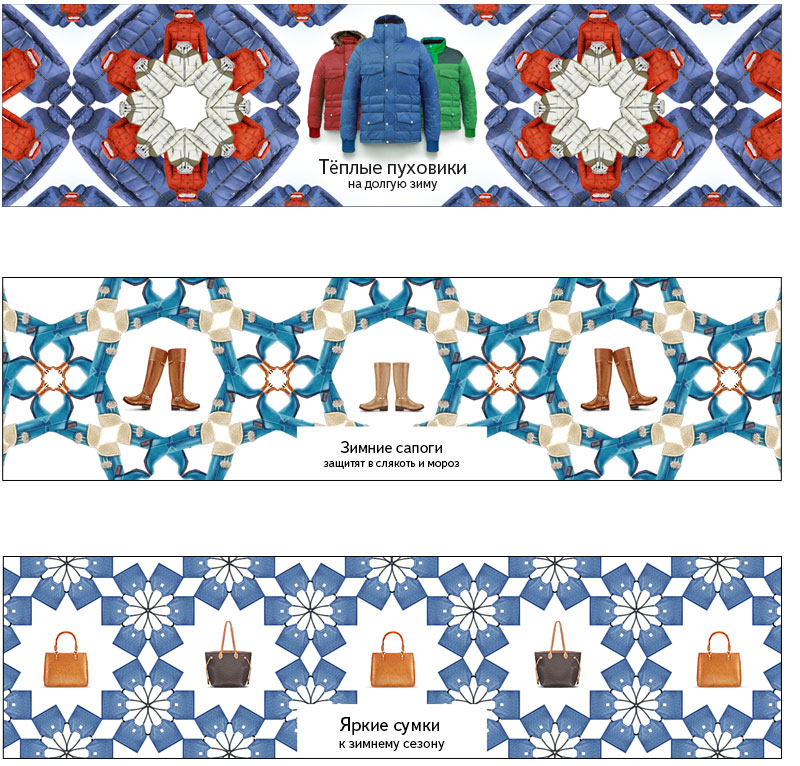 The Wardrobe section of the Yandex.Market website collects information about millions of brand clothing items available in online and offline stores in Russia. New campaign materials demonstrate the multitude of offers with kaleidoscope patterns.
