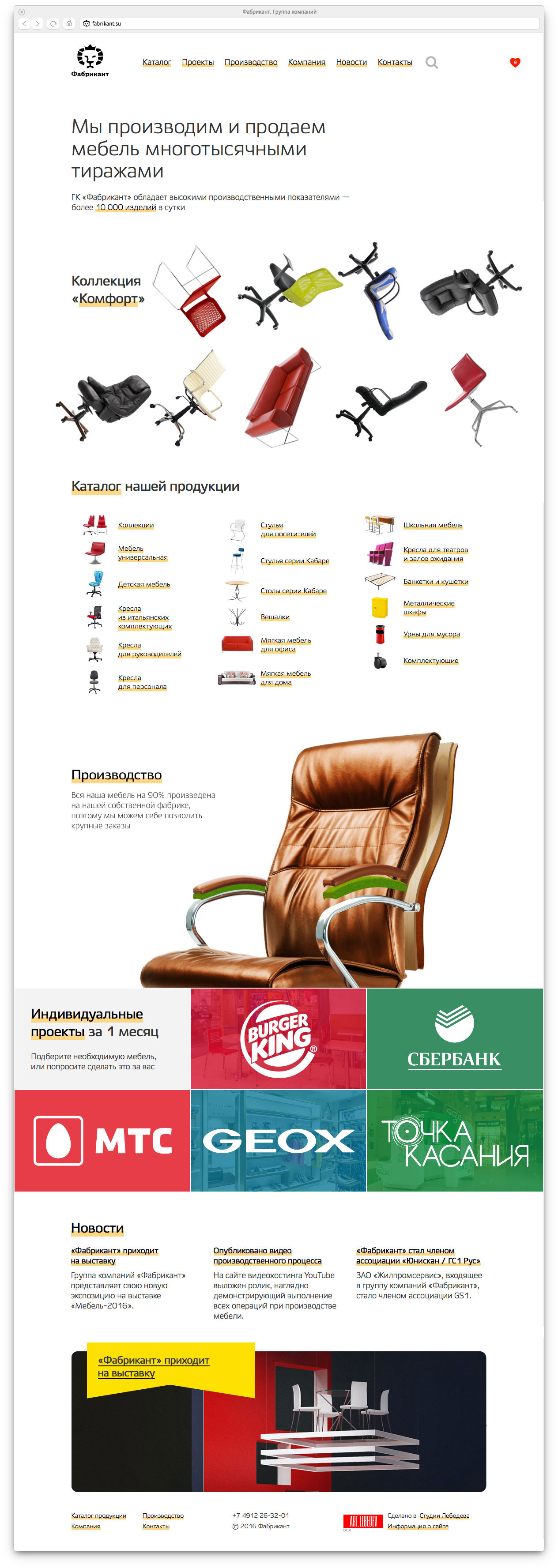 Fabrikant is one of the largest furniture manufacturers in Russia. A new website presenting all of the company’s products was developed at the studio. The website is most often visited by wholesale buyers who choose furniture for showrooms, exhibition pavilions and conference halls. In case the required design is not available, the company accepts custom orders.