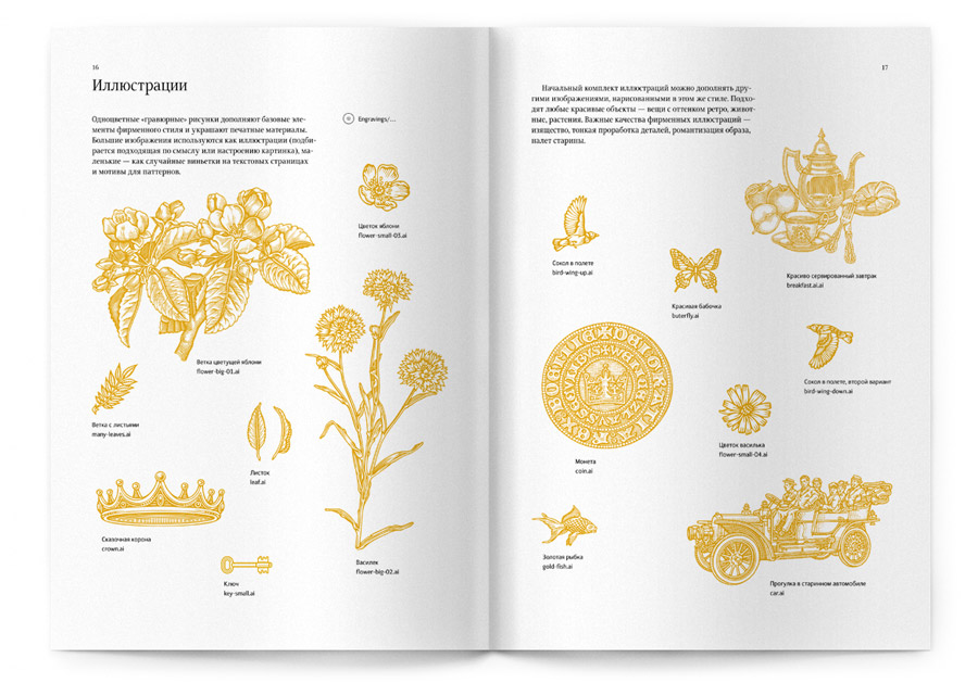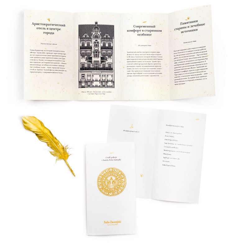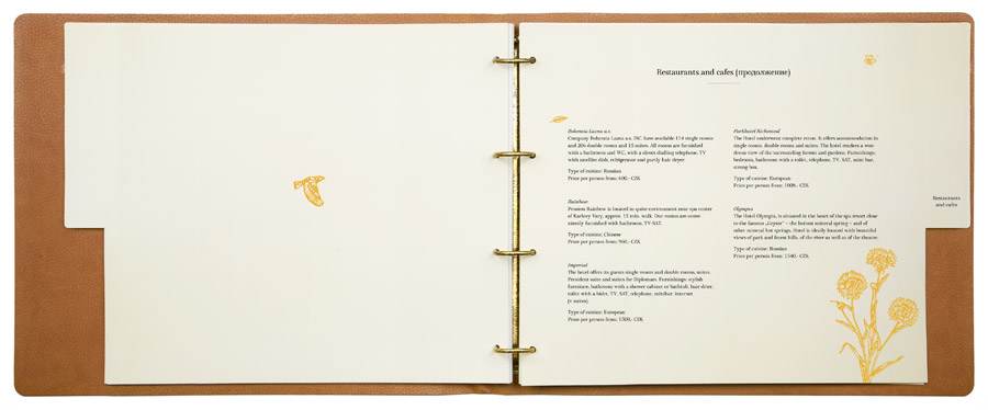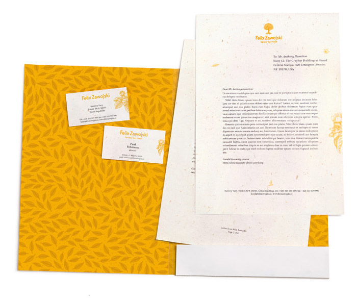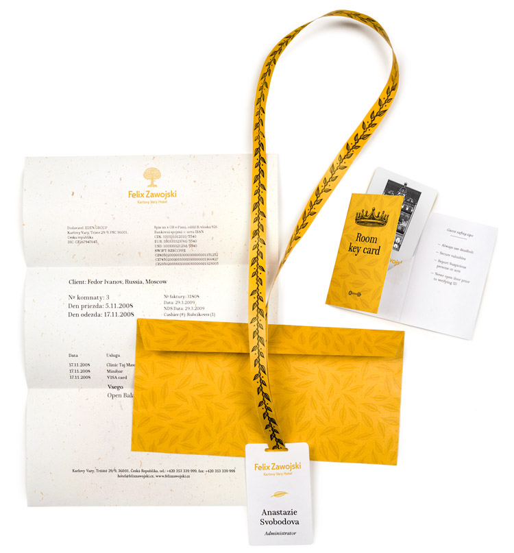 Documents for clients and guests are printed on fine quality paper with sparks of gold. ![]() Folder, business cards and letterheads set in mustard-yellow and gold with etching-like designs