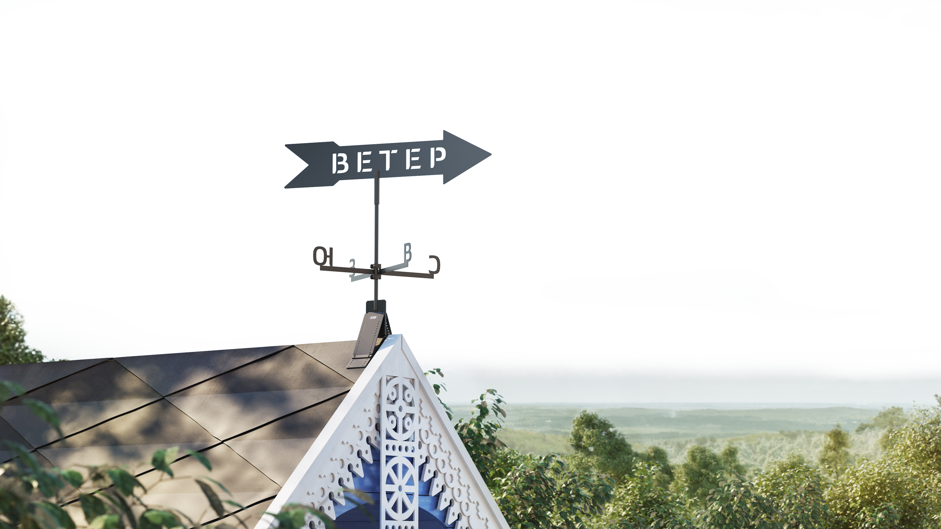 Flugerus is an elegant metal weather vane that shows wind direction relative to points of the compass. Flugerus is decorated with swift text that emphasizes the unstoppable nature of air flow.