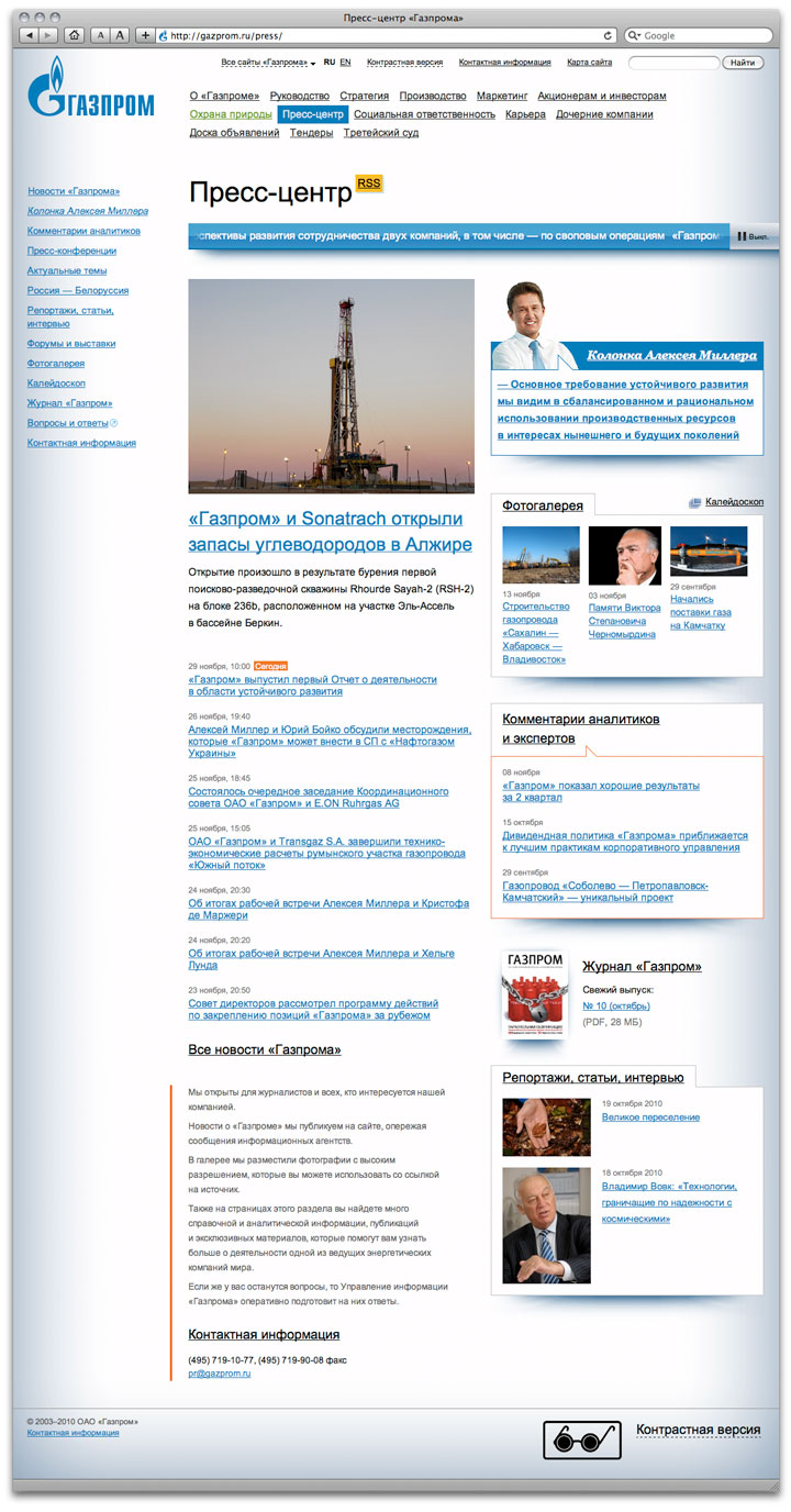 Since the launch of Gazprom website, more and more information was added and new sections introduced. Because of the news flow, users frequently overlooked some publications—for example, a new photo album or a fresh issue of Gazprom magazine. It was time to redesign the press center main page. To handle the latest news, we introduced a news ticker and movable information blocks. Besides, the website contains important data that doesn’t get old (for example, reports). Now editors can manage the announcements of such publications so that the more recent news doesn’t displace them. |