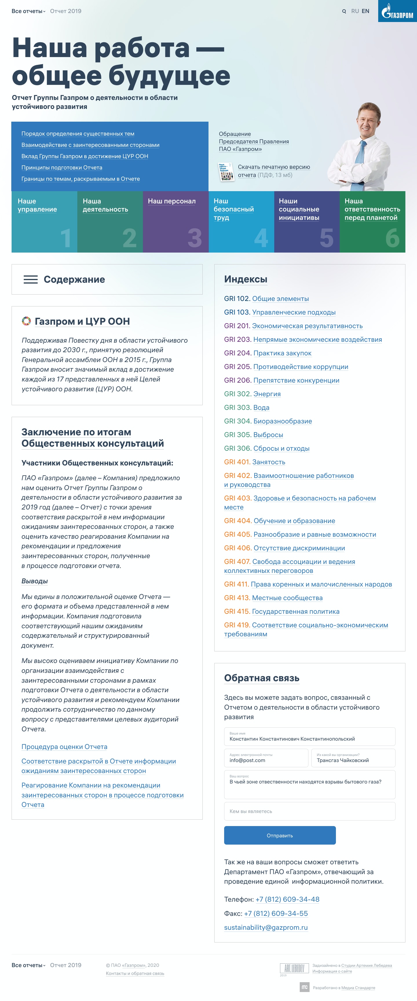 The main page of the website was updated for the 2019 report. The table of contents became more compact, allowing to easily find the main topics that reveal the detailed information. Index links make the page even more convenient for readers who know what they are looking for.